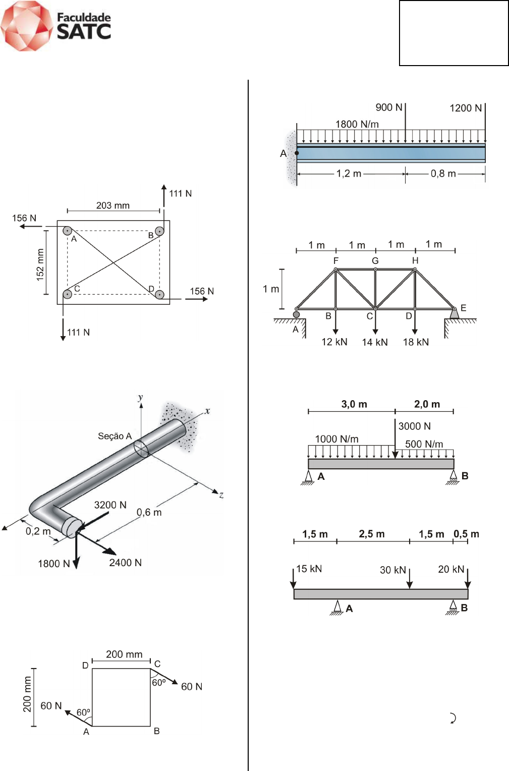 CURSO DE ENGENHARIA MECÂNICA DISCIPLINA: ESTÁTICA Profº José Luiz Salvador Acadêmico:______________________________________ Lista 08 01. Quatro pinos de 25 mm de diâmetro são presos a uma tábua. Dois barbantes, apoiados nos pinos são tracionados, como ilustrado. (a) Determine o binário resultante na tábua. (b) Se apenas um barbante é usado, em quais pinos deverá ser apoiado e em que direções deverão ser tracionado a fim de que se produza o mesmo binário com uma força de tração mínima? (c) Qual o valor dessa força de tração mínima? 02. A barra cilíndrica de 50 mm de diâmetro esta sujeita as três forças indicadas. Determine os momentos em relação aos eixos x, y e z. 03. Duas forças de 60 N são aplicadas, como ilustrado, aos vértices A e C de uma placa quadrada de 200 mm de lado. Determine o momento do binário formado pelas duas forças. 04. Para a viga abaixo, determine as reações no apoio A. 05. Para a treliça de carregamento mostrado determine as reações nos apoios A e E. 06. Para a viga de carregamento indicado, calcule as reações nos apoios A e B. 07. Para a viga de carregamento indicado, calcule as reações nos apoios A e B. RESPOSTAS 01. a) 52,92 N.m b) A e D α = 53,18º ou B e C α = − 53,18º c) 189,95 N 02. Mx = − 360 Nm My = 800 Nm Mz = 1080 Nm 03. – 16,39 N.m 04. Ray = 5700 N ↓ MA = 7080 N.m 05. RA = 20,5 kN RB = 23,5 kN 06. RA = 3500 N RB = 3500 N 07. RA = 29,375 kN RB = 35,625 kN