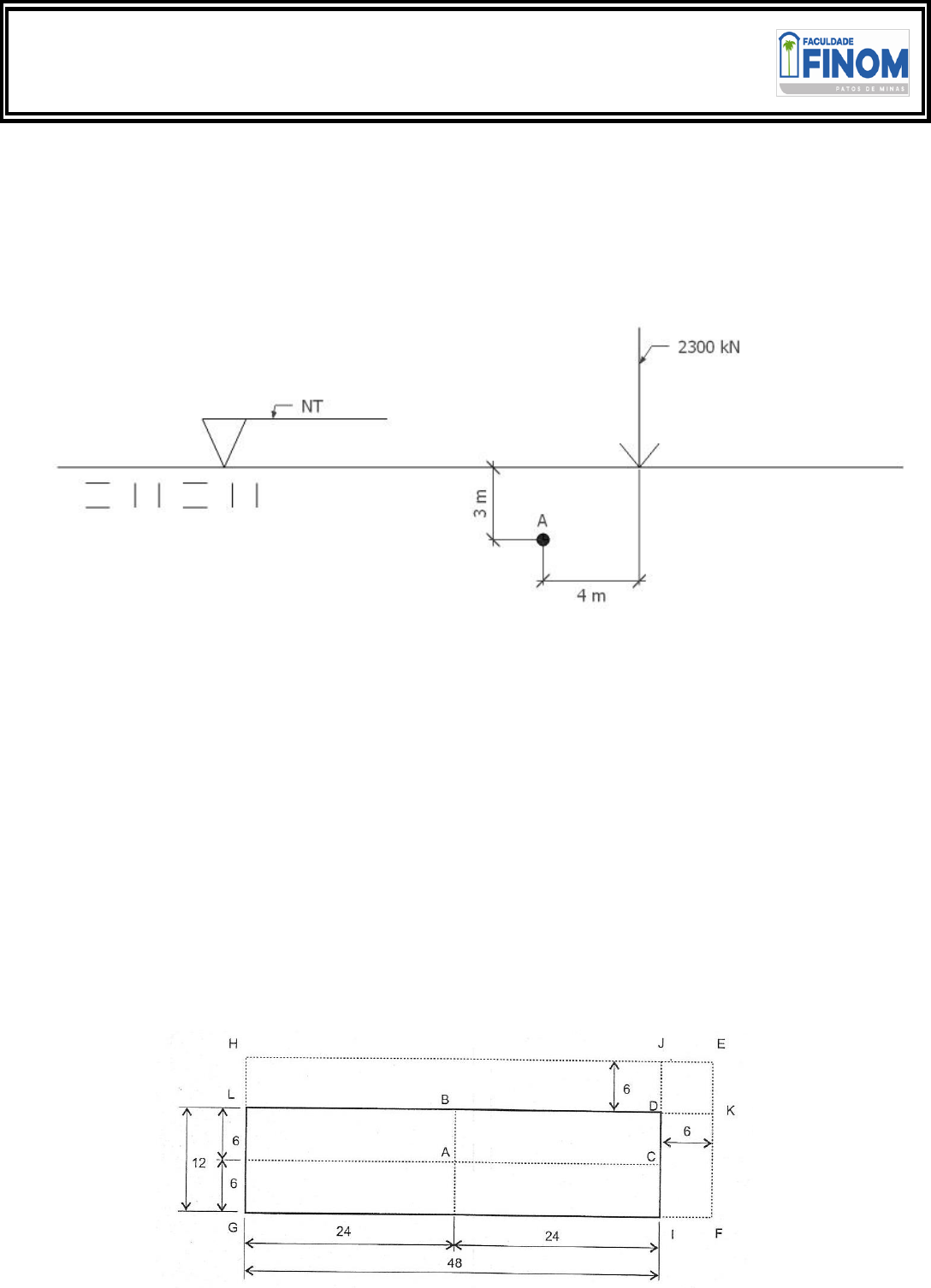 LISTA DE EXERCÍCIOS Questão 01 Uma torre foi construída na superfície de um terreno, aplicando sobre o mesmo uma carga pontual de 2300 kN. Calcule o acréscimo da tensão vertical no ponto A devido à construção dessa torre. Questão 02 Um tanque metálico circular, com 14 m de diâmetro, foi construído com fundação direta, na superfície, num terreno plano e horizontal, para estocagem de combustível. O tanque deverá transmitir ao terreno uma pressão de 50 kPa. Para a previsão de eventuais recalques, desejam-se conhecer os acréscimos de tensão a 3,5 e a 7 m de profundidade, no centro e na periferia do tanque. Questão 03 Uma construção industrial apresenta uma planta retangular, com 12 m de largura e 48 m de comprimento, e vai aplicar ao terreno uma pressão distribuída de 50 kPa. Determinar o acrécimo de tensão nos pontos A e D, a 6 m e a 28 m de profundidade aplicando a solução de Newmark. Exercícios Curso:Engenharia Civil Turma: EC-7NA-PM Disciplina: Mecânica dos Solos II Professora: Marina da Mota Pereira Valor: 1,5 ponto Data: 12/04/2018 NOME LEGÍVEL: ______________________________________________________