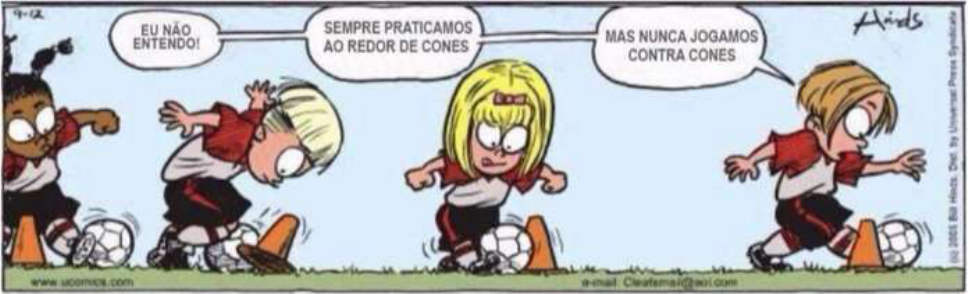 QUESTÃO 3 Interprete a figura abaixo e escolha a opção CORRETA (A) Alunos realizam uma aula de condução da bola e parecem concordar com a proposta do professor. (B) Alunos dedicam-se à atividade proposta pelo professor, aprendendo como conduzir a bola conforme será exigido no jogo de futebol de verdade. (C) Alunos questionam o modelo de aula do professor, uma vez que enfrentarão pessoas e não cones no jogo de futebol de verdade. (D) Alunos questionando como o futebol de verdade é jogado, pois gostariam de enfrentar cones assim como praticam nos treinos.