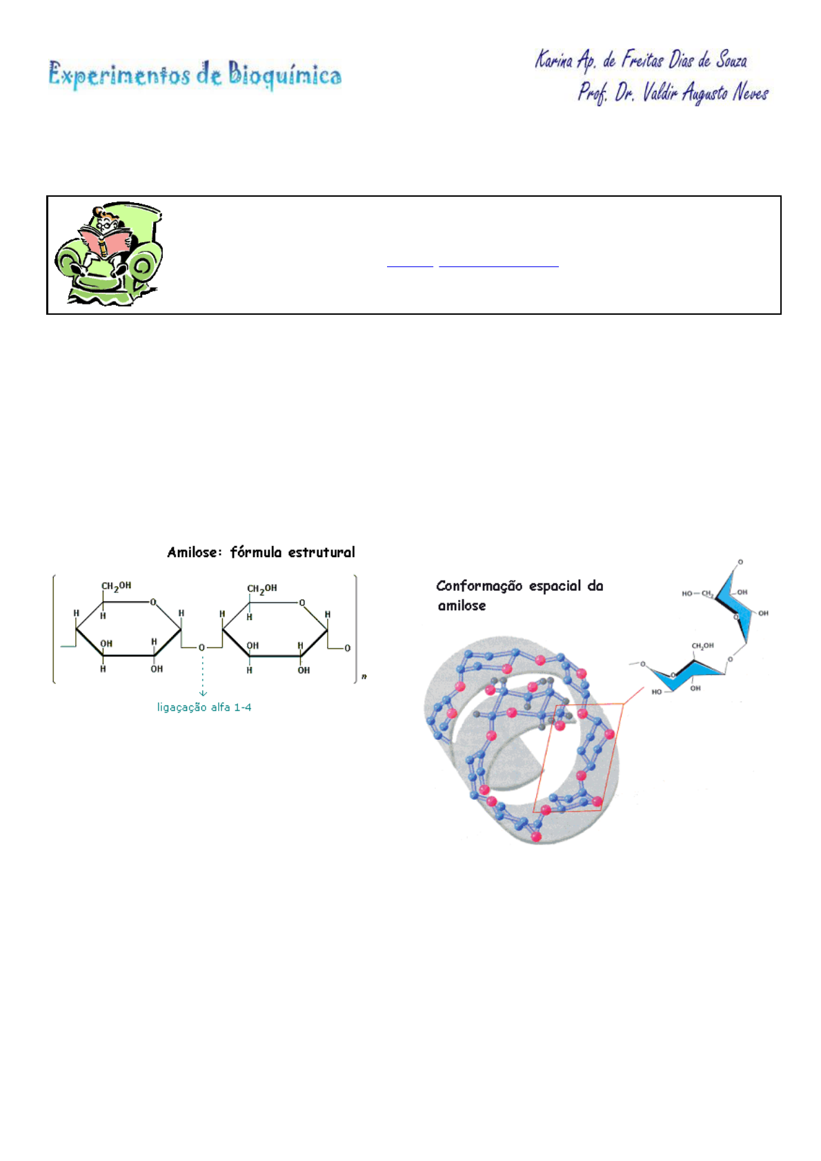 17/04/2018 Teste do iodo http://www.fcfar.unesp.br/alimentos/bioquimica/praticas_ch/teste_amido.htm 1/3 Pesquisa de polissacarídeos: reação com o iodo Antes de iniciar essa prática, algumas leituras são sugeridas: Introdução aos carboidratos 1. Objetivos obter informações sobre o tamanho e grau de ramificação da molécula de carboidrato através da reação com o iodo. 2. Princípios teóricos Polissacarídeos são moléculas de elevado peso molecular, cuja unidade fundamental são os monossacarídeos, principalmente a glicose. Como exemplos de polissacarídeos importantes na natureza podemos destacar o glicogênio, a celulose e o amido. O amido, polissacarídeo de extrema importância em alimentos, é produzido em grande quantidade nas folhas dos vegetais como forma de armazenamento dos produtos da fotossíntese, e é constituído por dois outros polissacarídeos estruturalmente diferentes: amilose e amilopectina (ver figura abaixo). Como podemos observar, a molécula da amilose não apresenta ramificações e, no espaço, assume conformação helicoidal (forma de hélice). A ligação entre os átomos de carbono das unidades de glicose são do tipo alfa 14. A amilopectina apresenta estrutura ramificada, sendo que os "ramos" aparecem a cada 2430 moléculas de glicose. A ligação entre as unidades de glicose também é do tipo alfa 14 na mesma cadeia. Porém, unindo duas cadeias aparecem ligações do tipo a 16. Observe a figura: 17/04/2018 Teste do iodo http://www.fcfar.unesp.br/alimentos/bioquimica/praticas_ch/teste_amido.htm 2/3 Moléculas de alto peso molecular (como a amilose e a amilopectina) podem sofrer reações de complexação, com formação de compostos coloridos. Um exemplo importante é a complexação da amilose e da amilopectina com o iodo, resultando em complexo azul e vermelhovioláceo, respectivamente. A figura abaixo esquematiza a interação do iodo com a estrutura do amido: Já sabemos que o amido é formado pela combinação da amilose com a amilopectina. Também sabemos que a amilose forma um complexo azul com o iodo, enquanto a amilopectina forma um complexo vermelho. Qual será então a cor do complexo iodo amido??? O complexo esquematizado ao lado apresenta coloração azul intensa, desenvolvida pela oclusão (aprisionamento) do iodo nas cadeias lineares da amilose. E a interação iodo amilopectina? Como vimos, o aprisionamento do iodo dáse no interior da hélice formada pela amilose. Como a amilopectina não apresenta estrutura helicoidal, devido à presença das ramificações, a interação com o iodo será menor, e a coloração menos intensa. IMPORTANTE - nem todos os polissacarídeos, apesar de serem moléculas grandes, dão complexo colorido com o iodo. Isso porque é necessário que a molécula apresente uma conformação que propicie o "encaixe" do iodo. A celulose é um exemplo de polissacarídeo que não dá reação colorida com o iodo. 3. Procedimento Experimental 3.1. Material a) Reagentes e soluções solução de amido 1% * solução de glicose 2% solução de lugol ** solução de hidróxido de sódio (NaOH) 1M solução de ácido clorídrico (HCl) 1M água destilada b) Vidraria e instrumental 03 tubos de ensaio contagotas ou pipeta Pasteur pipetas de 2 mL * Como o amido é de difícil dissolução, preparar a solução da seguinte maneira: misturar 1 g de amido com 10 ml de água. Derramar a pasta em um recipiente que contenha 100 ml de água fervente. Cessar a ebulição e deixar esfriar e sedimentar. Separar a parte sobrenadante (sem grumos) por decantação. A solução ganha maior estabilidade se for adicionada de 1g de ácido salicílico (1%). ** Preparo do reagente de lugol: 5 g de iodo (I2) + 10 g de iodeto de potássio (KI). Completar o volume para 100 ml com água destilada. Diluir 1:10 no momento da utilização. 3.2. Procedimento 17/04/2018 Teste do iodo http://www.fcfar.unesp.br/alimentos/bioquimica/praticas_ch/teste_amido.htm 3/3 Veja as fotos desse experimento Parte I 1. Prepare a seguinte bateria de tubos, identificandoos: (1) 2 mL de água destilada (2) 2 mL da solução de amido (3) 2 mL da solução de glicose 2. a cada um dos tubos adicionar 4 gotas de lugol; 3. observar a coloração desenvolvida e descrever o resultado. O desenvolvimento de coloração azul intensa indica presença de polissacarídeo. Parte II 1. Ao tubo que contém amido e lugol, adicione 5 gotas de NaOH 1M. Observe e anote o resultado. 2. Adicione, ao mesmo tubo, 5 gotas de HCl 1M. Observe. Home Aspectos teóricos Atividades Experimentais Bibliografia Contato