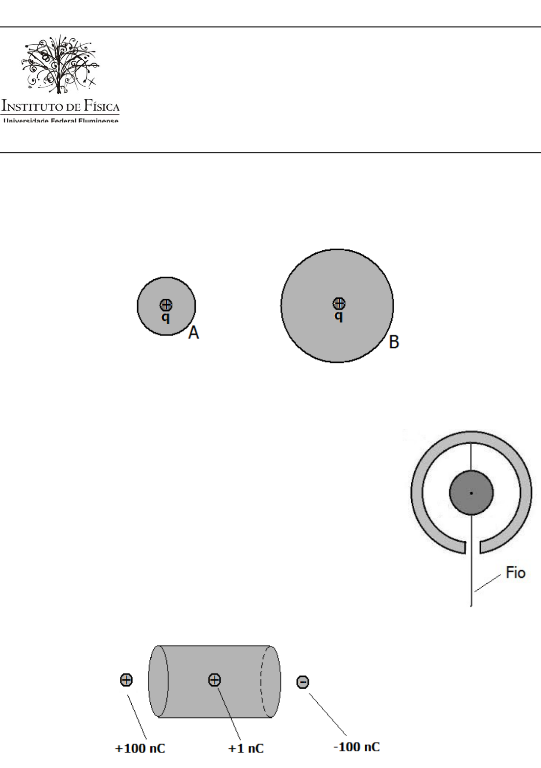 Física Teórica II – Lei de Gauss e Potencial Elétrico 2ª Lista – 1º semestre de 2015 ALUNO ____________________________________________________________ TURMA _____ PROF. ________________________________ NOTA:_______ 01) As duas esferas da figura abaixo encerram cargas iguais. Três estudantes discutem a situação. Estudante 1: Os fluxos através das esferas A e B são iguais, pois elas encerrarem cargas iguais. Estudante 2: Mas o campo elétrico sobre a esfera B é mais fraco do que o campo elétrico sobre a esfera A. O fluxo depende da intensidade do campo, de modo que o fluxo através de A é maior do que através de B. Estudante 3: Eu acho que aprendemos que o fluxo é calculado sobre uma área superficial. A esfera B é maior do que a esfera A, então eu acho que o fluxo através de B é maior do que através de A. Com qual dos estudantes você concorda? Explique. 02) Uma pequena esfera de metal está pendurada por uma linha isolante dentro de uma esfera condutora grande e oca, como na figura. Um fio condutor estendido atravessa a pequena esfera e o pequeno orifício na esfera oca, porém se tocá-la. Um bastão carregado é usado para transferir carga positiva para o segmento do fio que está fora da esfera oca. Após o bastão carregado ter tocado o fio e ter sido removido, as seguintes superfícies carregadas estarão com carga positiva, carga negativa ou descarregada? Explique. a) A pequena esfera. b) A superfície interna da esfera oca. c) A superfície externa da esfera oca. 03) Um retângulo de 2,0cm x 3,0cm situa-se no plano xz. Qual será o valor do fluxo elétrico através do retângulo se a) E=(50i+100k) N/C? a) E=(50i+100j) N/C? 04) Qual é o fluxo elétrico resultante através do cilindro da figura abaixo? 05) A figura mostra uma cavidade oca e fechada em um condutor neutro. Dentro da cavidade existe uma carga pontual Q. Qual é o fluxo elétrico resultante através da superfície fechada que encerra o condutor na figura? 06) A figura mostra uma esfera metálica e maciça posicionada no centro de uma esfera metálica oca. Qual é a carga total distribuída (a) na superfície externa da esfera oca, (b) na superfície interna da esfera oca e c) na superfície da esfera oca? ( Na figura, a=5 cm, b=10 cm e c=15cm) 07) Os três planos de carga paralelos mostrados na figura possuem,respectivamente, densidades superficiais de carga -1/2η, η e -1/2η. Determine os campos elétricos E1, E2, E3 e E4 nas respectivas regiões marcadas na figura. Newton Typewritten Text Explique. Newton Typewritten Text Newton Typewritten Text 08) Um cilindro carregado muito longo, de raio R, possui uma densidade linear de carga λ. Determine o campo elétrico criado pelo cilindro (a) fora do mesmo, para r≥R, e (b) dentro do cilindro, para r≤R. c) Mostre também que suas respostas aos itens anteriores coincidem na borda do cilindro, correspondente a r=R. 09) a) A carga q1 está a uma distância r de uma carga puntiforme positiva Q. A carga q2=q1/3 está a uma distância 2r de Q. Qual é a razão U1/U2 entre suas energias potenciais devida as suas interações com Q? b) A carga q1 está a uma distância d da placa negativa de um capacitor de placas paralelas. A carga q2=q1/3 está a uma distância 2d da placa negativa. Qual é a razão U1/U2 entre suas energias potenciai? 10) Um capacitor com placas paralelas separadas por uma distância d é carregado até atingir uma diferença de potencial ∆Vc. Todos os fios e baterias são desconectados e , então, as duas placas são afastadas (com as mãos isoladas) até ficarem a uma nova distância 2d. a) A carga Q do capacitor varia enquanto a separação aumenta? Em caso afirmativo, por qual fator? Em caso negativo, por que não? b) A intensidade de campo elétrico E varia enquanto a separação aumenta? Em caso afirmativo, por qual fator? Em caso negativo, por que não? c) A diferença de potencial ∆Vc varia enquanto a separação aumenta? Em caso afirmativo, por qual fator? Em caso negativo, por que não? 11) Ordene em seqüência decrescente os potenciais elétricos de Va a Ve nos pontos enumerados de a até e na figura. Explique o ordenamento realizado. 12) (a) Qual é a velocidade de um elétron que foi acelerado a partir do repouso através de uma diferença de potencial de 1000V? (b) Qual é a velocidade de um próton que foi acelerado a partir do repouso através de uma diferença de potencial de -1000V? 13) (a) Quanto vale o potencial elétrico nos pontos A, B e C da figura? (b) Quanto valem as diferenças de potencial ∆VAB e ∆VBC? Newton Typewritten Text 14) Sabendo que, na figura, a=4,0cm e que o módulo de q vale 3,0nC, responda: (a) Qual é o valor do potencial elétrico no ponto P? (b) Qual é a variação energia potencial elétrica para trazermos uma carga de prova q0=1,0nC do infinito até o ponto P? 15) O gerador de Van de Graaf é um dispositivo para geração de um grande potencial elétrico através da acumulação de carga sobre uma esfera oca metálica. Um típico modelo para demonstrações em sala de aula tem um diâmetro de 30 cm. a) O gerador é carregado pela deposição de carga sobre a superfície interior da esfera de metal. O que acontece com a carga após ela ter sido posta ali? b) Que quantidade de carga é necessária sobre a esfera para que seu potencial seja de 500000V? c) Qual é a intensidade do campo elétrico no interior e no exterior da superfície da esfera quando ela se encontra carregada sob uma voltagem de 500000V? 16) A figura é o gráfico do campo elétrico E pela posição x. Qual é a diferença de potencial entre xi=1,0m e xf=3,0m?