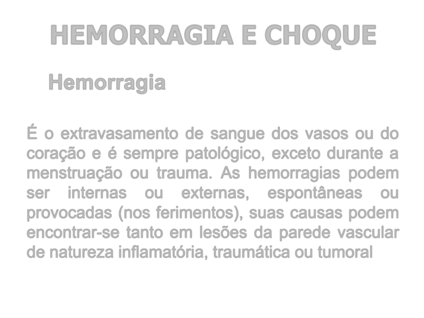 HEMORRAGIA E CHOQUE É o extravasamento de sangue dos vasos ou do coração e é sempre patológico, exceto durante a menstruação ou trauma. As hemorragias podem ser internas ou externas, espontâneas ou provocadas (nos ferimentos), suas causas podem encontrar-se tanto em lesões da parede vascular de natureza inflamatória, traumática ou tumoral Hemorragia HEMORRAGIA E CHOQUE Classificação clínica A hemorragia poderá ser externa ou interna. Hemorragia Externa: Ocorre devido a ferimentos abertos. Hemorragia interna: Geralmente não é visível, porém é bastante grave, pois pode provocar choque e levar a vítima a morte. Noções de Anatomia Artéria Veia Capilares Classificação Anatômica Arterial - Hemorragia que faz jorrar sangue pulsátil e de cor vermelho vivo; Venosa - O sangue sai lento e contínuo na cor vermelho escuro. Capilar - O sangue sai lentamente por vasos menores. A cor é menos viva que na hemorragia arterial. Sinais e sintomas: Agitação; Palidez; Sudorese intensa; Pele Fria; Pulso acelerado (acima de 100 bpm); Pressão arterial baixa; Sede; Fraqueza. HEMORRAGIA EXTERNA HEMORRAGIA INTERNA Os mesmos da Hemorragia externa, e; Perda de sangue ou fluidos pelo Nariz ou ouvido; Vômito ou tosse com presença de sangue; Rigidez ou espasmos dos músculos abdominais; Dor abdominal; Sangramento pelas genitálias. Sinais ou sintomas: QUANTO AO VOLUME DE SANGUE PERDIDO CLASS I II III IV % ATÉ 10% DE 15 A 20% 25 A 30% 35 a 45% PA NORMAL NORMAL CAI OU PINÇA 00 FC NORMAL 100 BPM 120 BPM + 130 BPM FR NORMAL 20 A 30 RPM 30 A 40 RPM + 40 RPM PELE NORMAL FRIA/ÚMIDA/ PALIDA + CLASSE II SEM CIRCULAÇÃO CONS NORMAL NORMAL ALTERADA/ ANSIEDADE INCONSCIENTE ESTIMATIVA DE PERDA SANGUÍNEA NUMA FRATURA Tíbia = 250 ml Pelve = 3000 ml Fêmur = 600 ml Costelas = 50 ml Úmero = 75 ml EXPOR O LOCAL DA LESÃO Verificar o tipo de ferimento e material a ser utilizado no controle de sangramento. 1º TECNICA PRESSÃO DIRETA 2º TECNICA ELEVAÇÃO DO MEMBRO 3° TECNICA PONTO DE PRESSÃO COMPRESSÃO DA ARTÉRIA BRAQUIAL COMPRESSÃO DA ARTÉRIA FEMURAL Tratamento Pré-hospitalar Avaliação da cena (193); Avalie a consciência; Abra as VA e observe a respiração e a circulação; Exponha o local do ferimento; controle a hemorragia; Previna ou trate o estado de choque; Afrouxe roupas apertadas; Esteja preparado para o vômito; Não dê nada de comer ou beber. Conceito: ESTADO DE CHOQUE Quadro grave causado por uma reação do organismo a uma condição onde o sistema circulatório não fornece circulação suficiente para cada parte vital do organismo. Coração: O coração não consegue bombear quantidade suficiente de sangue (insuficiência cardíaca). O choque poderá desenvolver-se rapidamente. As causas estão relacionadas ao coração, aos vasos sanguíneos ou ao volume de sangue circulante. CAUSAS DO ESTADO DE CHOQUE VASOS SANGÜÍNEOS: choque hipovolêmico. O sistema circulatório deve obrigatoriamente ser um sistema fechado. Se os vasos (artérias, veias ou capilares) forem lesados e perderem muito sangue, o paciente desenvolverá choque. VOLUME DE SANGUE CIRCULANTE: choque distributivo Se houver uma diminuição no volume de sangue circulante ou se os vasos sangüíneos por algum motivo dilatarem (aumentarem seu diâmetro) impedindo que o sistema permaneça corretamente preenchido, o choque novamente se desenvolverá. TIPO DE CHOQUE Choque hemorrágico - hipovolêmico Choque cardiogênico; Choque neurogênico - distributivo Choque anafilático - distributivo Choque psicogênico - distributivo Choque séptico - distributivo. Sinais e Sintomas Agitação ou ansiedade; Respiração rápida e superficial; Pulso rápido e fraco; Pele fria e sudorese; Perfusão superior a 2 segundos; Pupilas dilatadas; Sede; Náuseas e vômitos; Pressão arterial baixa. SINAIS E SINTOMAS(ANAFILÁTICO) Prurido na pele; Sensação de queimação na pele; Edema generalizado; Dificuldade para respirar; Pulso fraco; Perda da consciência e morte Tratamento Pré-Hospitalar Avaliação da cena; Avalie o nível de consciência; Posicione a vítima deitada (decúbito dorsal); ABC da vida; Controle hemorragias externas; Eleve os membros inferiores; Imobilize fraturas, se necessário; Afrouxe roupas; Previna a perda de calor corporal; Não dar nada de beber ou comer.