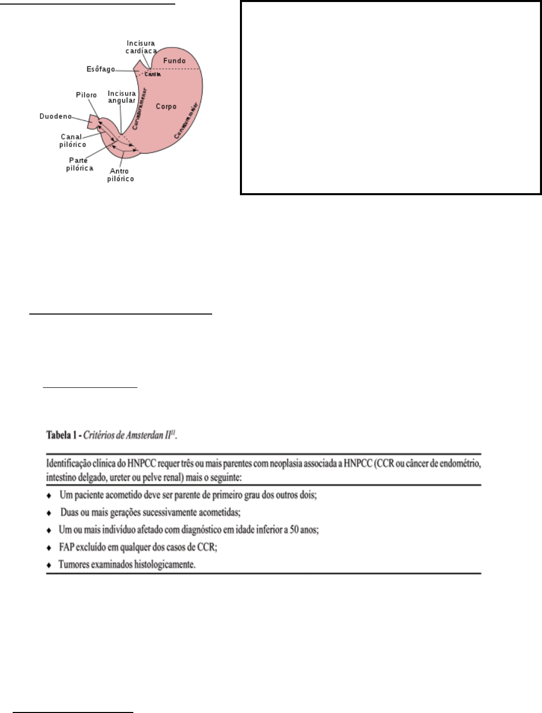 Tumores de estômago e colonO fundo está mais relacionado a casos de pacientes mais jovens com histórico familiar – síndrome de Lynch (HNPCC). Quem tem, em algum momento terá a doença. Na junção cardioesofágica, o tumor está também relacionado ao DRGE, pela exposição ao baixo pH, promovendo alteração da função celular e proliferação errada. Segundo a classificação de Lauren, são os tipo difuso. O antro está mais relacionado aos casos de pacentes idosos, com DRGE ou acloridria e que acabam fazendo metaplasia – é o tipo intestinal de Lauren. A alteração celular ocorre pela exposição ao longo da vida. Fatores de risco (comuns para os dois tipos de câncer) Genéticos: A inativação de genes supressores tumorais (APC, DCC e p53) e a ativação de oncogenes (k-ras) foram descritos e acredita-se que a doença se desenvolva a partir de pólipos que acumulam os defeitos com o tempo. A polipose adenomatosa familiar (PAF) é um fator de risco transmitido pela herança autossômica dominante que deve ser tratado com colectomia total, caso contrário desenvolve-se o carcinoma por volta da 4ª década de vida. Está relacionada à presença do APC mutante que não bloqueia o crescimento celular desordenado, acarretando na formação de múltiplos pólipos adenomatosos no cólon. São necessários pelo menos 100 pólipos para o diagnóstico da forma clássica. Já a síndrome de Lynch é o câncer colorretal hereditário não-polipose e responsável por até 6% dos casos de cânceres colorretais. Está relacionado à inativação dos genes de reparo MSH2 e MLH1. Os critérios de Amsterdam definem a síndrome de Lynch da seguinte maneira: >>> Todo paciente que preencha esses critérios deve fazer colonoscopia de 2 em 2 anos entre os 20-35 anos e após os 35, anualmente. Em mulheres também está indicado o USG transvaginal, curetagem, CA-125 e pesquisa de sangue oculto na urina. Os critérios de Amsterdam foram modificados recentemente para deixar de considerar somente o câncer colorretal como caso index e incluir também os tumores de endométrio, ureter ou pelve renal, uma vez que também estavam relacionados à síndrome de Lynch, aumentando então o grupo a ser rastreado. O câncer colorretal familiar não tem anormalidade genética específica identificada, mas os riscos de ele desenvolver a doença aumentam, caso exista algum familiar próximo com histórico de doença. Nesses casos, o rastreamento com colonoscopia é indicado a partir dos 40 anos ou então 10 anos antes da idade em que o caso mais novo na família apareceu. Doença inflamatória intestinal Dieta e hábitos de vida: O câncer gástrico está mais relacionado aos nitritos e nitratos produzidos pela degradação dos alimentos, principalmente a carne vermelha. Antigamente via-se mais casos de câncer gástrico, pois não havia geladeira, então os alimentos não eram bem conservados e se degradavam rapidamente. Os casos de câncer gástrico no Japão também são muitos, devido ao consumo do peixe cru, que se degrada rapidamente. Já os casos de câncer colorretal estão mais relacionados a uma dieta rica em gorduras, carboidratos refinados, ingestão de álcool e tabagismo (>35 anos de tabagismo). Outras patologias: Anemia perniciosa – células parietais não funcionantes levam a hipocloridria e consequentemente a uma intestinalização do estômago, fazendo metaplasia, atrofia da mucosa e displasia. Outras patologias são os pólipos, úlceras, cirurgia gástrica prévia (as cicatrizes deixadas na mucosa do estômago não têm um tecido apropriado para receber aquele pH), gastrites (relacionadas a hipocloridria), endocardite por S. bovis, síndrome de Peutz-Jeger e síndrome de Gardner H. pylori: Em pacientes com úlcera gástrica e infecção pelo H. pylori os casos de câncer gástrico são um pouco mais elevados, principalmente os linfomas gástricos, devido à inflamação provocada pela bactéria. O status socioeconômico também está relacionado. Importante: o uso indiscriminado de omeoprazol e ranitidina mascaram os sintomas da doença e dificultam o diagnóstico precoce. Obs: A gastrite crônica atrófica é a condição precursora mais comum de câncer gástrico, seja ela por anemia perniciosa (gastrite corporal difusa) ou por H. pylori (gastrite atrófica multifocal). Outros fatores: sexo masculino; >35 anos (ou acima de 50 anos por metaplasia) Fatores protetores de câncer colorretal: (1) Uma dieta rica em fibras, cálcio e ácido fólico são importantes na prevenção da doença. A ingestão de fibra solúvel tem vários benefícios, como regularizar o hábito intestinal, redução do LDL, controle da resistência insulínica e prevenção da diverticulose, pois a sua digestão promove uma “musculação” da musculatura lisa do intestino, fortalecendo-a (a diverticulose acontece por fragilidade da parede). (2) O uso crônico de antiinflamatórios parecem inibir a formação de pólipos intestinais. (3) A resposição hormonal também é um fator protetor. Pólipos intestinais: Pólipo é qualquer massa que surja na superfície interna da luz intestinal, causando elevação da mucosa em direção à sua luz. Podem ser únicos, encontrados isoladamente (esporádicos), ou fazer parte de síndromes de polipose. As principais complicações são sangramento e malignização, sendo o mais propenso à malignização o pólipo adenomatoso do tipo VILOSO, com mais que 2cm e displasia de alto grau. Nesses casos estão indicados ressecção e biópsia. As síndromes de polipose hereditárias são divididas em PAF e nas poliposes hamartomatosas; Síndrome de Peutz-Jaghers (pólipos associados a manchas melanóticas em pele e mucosa), Síndrome de Gardner (dentes extranuméricos, osteoma e lipoma), Síndrome de Cowden (pólipos extraintestinais, tumor facial e hiperceratose palmoplantar e sem potencial para maligninização). Tumor colorretal Patologia: Podem ser do tipo polipoide, mais comum