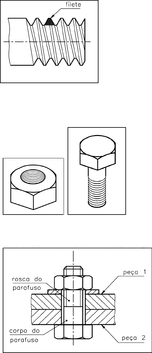 Roscas Rosca é um conjunto de filetes em torno de uma superfície cilíndrica. As roscas podem ser internas ou externas. As roscas internas encontram-se no interior das porcas. As roscas externas se localizam no corpo dos parafusos. As roscas permitem a união e desmontagem de peças. Permitem, também, movimento de peças. O parafuso que movimenta a mandíbula móvel da morsa é um exemplo de movimento de peças. Os filetes das roscas apresentam vários perfis. Esses perfis, sempre uniformes, dão nome às roscas e condicionam sua aplicação. Tipos de roscas (perfis) Perfil de filete Aplicação Parafusos e porcas de fixação na união de peças. Ex.: Fixação da roda do carro. Parafusos que transmitem movimento suave e uniforme. Ex.: Fusos de máquinas. Parafusos de grandes diâmetros sujeitos a grandes esforços. Ex.: Equipamentos ferroviários. Parafusos que sofrem grandes esforços e choques. Ex.: Prensas e morsas. Parafusos que exercem grande esforço num só sentido. Sentido de direção da rosca Dependendo da inclinação dos filetes em relação ao eixo do parafuso, as roscas ainda podem ser direita e esquerda. Portanto, as roscas podem ter dois sentidos: à direita ou à esquerda. Na rosca direita, o filete sobe da direita para a esquerda, conforme a figura. Na rosca esquerda, o filete sobe da esquerda para a direita, conforme a figura. Nomenclatura da rosca Independentemente da sua aplicação, as roscas têm os mesmos elementos, variando apenas os formatos e dimensões. P = passo (em mm) d = diâmetro externo d1 = diâmetro interno d2 = diâmetro do flanco a = ângulo do filete f = fundo do filete i = ângulo da hélice c = crista D = diâmetro do fundo da porca D1 = diâmetro do furo da porca h1 = altura do filete da porca h = altura do filete do parafuso Roscas triangulares As roscas triangulares classificam-se, segundo o seu perfil, em três tipos: rosca métrica rosca whitworth rosca americana Para nosso estudo, vamos detalhar apenas dois tipos: a métrica e a whitworth. Rosca métrica ISO normal e rosca métrica ISO fina NBR 9527. Ângulo do perfil da rosca: a = 60º. Diâmetro menor do parafuso ( do núcleo): d1 = d - 1,2268P. Diâmetro efetivo do parafuso ( médio): d2 = D2 = d - 0,6495P. Folga entre a raiz do filete da porca e a crista do filete do parafuso: f = 0,045P. Diâmetro maior da porca: D = d + 2f. Diâmetro menor da porca (furo): D1 = d - 1,0825P. Diâmetro efetivo da porca ( médio): D2 = d2. Altura do filete do parafuso: he = 0,61343P. Raio de arredondamento da raiz do filete do parafuso: rre = 0,14434P. Raio de arredondamento da raiz do filete da porca: rri = 0,063P. A rosca métrica fina, num determinado comprimento, possui maior número de filetes do que a rosca normal. Permite melhor fixação da rosca, evitando afrouxamento do parafuso, em caso de vibração de máquinas. Exemplo: em veículos. Rosca Whitworth normal - BSW e rosca Whitworth fina - BSF Fórmulas: a = 55º P = � hi = he = 0,6403P rri = rre = 0,1373P d = D d1 = d - 2he D2 = d2 = d - he A fórmula para confecção das roscas Whitworth normal e fina é a mesma. Apenas variam os números de filetes por polegada. Representação convencional de tipos de roscas M16 Exercícios Marque com um X a resposta correta. 1. Uma característica do parafuso é que todos eles apresentam: a) ( ) pinos; b) ( ) roscas; c) ( ) arruelas. 2. A rosca em que o filete de perfil tem forma triangular, denomina-se rosca: a) ( ) redonda; b) ( ) quadrada; c) ( ) triangular. 3. Em fusos de máquinas usa-se rosca com filete de perfil: a) ( ) trapezoidal; b) ( ) dente-de-serra; c) ( ) quadrado. 4. Quanto ao sentido, as roscas podem ser: a) ( ) plana ou inclinada; b) ( ) reta ou vertical; c) ( ) à direita ou à esquerda. 5. Quanto ao perfil, as roscas podem ser dos seguintes tipos: a) ( ) Métrica, whitworth, americana; b) ( ) Americana, métrica, cilíndrica; c) ( ) Métrica, whitworth, cilíndrica. �PAGE �55� �PAGE �307� _939459144.unknown