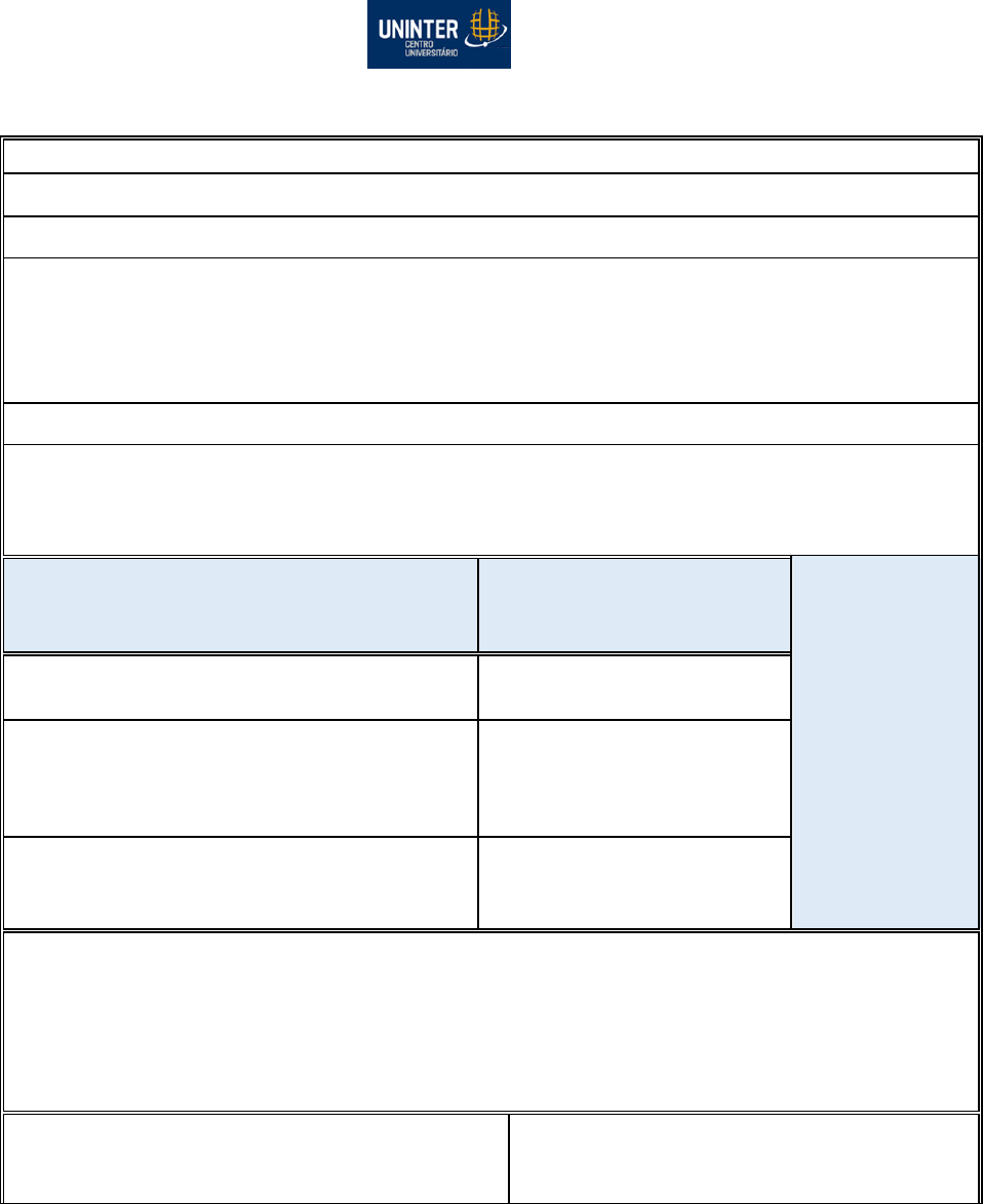 ESCOLA SUPERIOR DE EDUCAÇÃO FICHA DE AVALIAÇÃO - APRESENTAÇÃO DO PORTFÓLIO – MÓDULO A FASE II/2018 CIDADE-UF: POLO ASSOCIADO: APRESENTAÇÃO: ( ) PRESENCIAL ( ) WEBCAM ALUNO: RU TURMA: CURSO: TÍTULO DO TRABALHO DE PORTFÓLIO: CRITÉRIOS DE AVALIAÇÃO Tutor/Coordenador Avaliador A NOTA DEVERÁ SER DE 0 A 100 PARA CADA UM DOS TRÊS CRITÉRIOS. 1. COLABORAÇÃO NA APRESENTAÇÃO DOS COLEGAS. 2. A ADEQUAÇÃO DA LINGUAGEM, POSTURA E ORGANIZAÇÃO DOS MATERIAIS E DO TEMPO TORNARAM A APRESENTAÇÃO CLARA E COESA. 3. DOMÍNIO DO CONTEÚDO, CLAREZA, ADEQUAÇÃO DIDÁTICA E OBSERVÂNCIA DO TEMA FORAM CONTEMPLADOS. OBSERVAÇÕES / SUGESTÕES / CRÍTICAS / ALTERAÇÕES A SEREM REALIZADAS: AVALIADOR Tutor/Coordenador ASSINATURA _________________, ________/ ________/ 20____. Nome legível e assinatura do aluno: __________________________________________