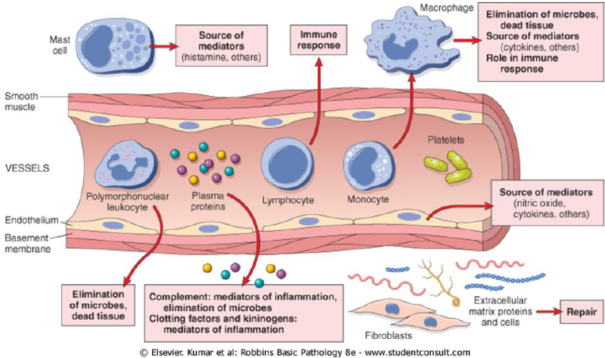 Inflamação Resposta protetora c/ intenção de eliminar causa inicial de injúria celular e células e tecidos necróticos resultantes do insulto original. Dilui, destrói ou neutraliza agentes nocivos (micróbios e toxinas). E ativa os eventos que eventualmente curarão e repararão os locais de injúria. Inflamação faz parte da imunidade inata. Apesar de ajudar a limpar infecções: Outros estímulos nocivos Iniciar o reparo Reação inflamatória Processo de reparo subsequente pode causar danos consideráveis - Componentes da reação inflamatória que destroem e eliminam micróbios e tecido morto também são capazes de ferir tecido normal. Assim, injúria pode acompanhar reações inflamatórias normais e benéficas, e essa patologia pode até se tornar a dominante no caso de a reação ser muito forte (ex infecção severa), prolongada (agentes resistem erradicação) ou inapropriada (autoantígenos, alergias). Componentes da inflamação e suas principais funções. Inflamação pode ser: aguda ou crônica. Inflamação aguda é caracterizada por exsudação de fluido, proteínas plasmáticas e acúmulo predominante de neutrófilos. Inflamação Crônica, por influxo de linfócitos e macrófagos associados a proliferação vascular e fibrose (cicatrização). Podem se sobrepor. Os sinais cardinais resultam das mudanças vasculares e recrutamento de células: Calor Rubor Tumor Os outros dois ocorrem como consequência de mediadores e dano mediado por leucócitos: Dor e perda de função. As etapas são: (1) Reconhecimento do agente injurioso (2) Recrutamento de leucócitos (3) Remoção do agente (4) Regulação da resposta (5) reparo O estímulo pode ser eliminado pela inflamação aguda (levando ao declínio da reação e reparo do tecido lesado) ou a injúria pode persistir e levar a inflamação crônica. Inflamação Aguda Resposta rápida à injúria ou micróbios e outras substâncias estranhas com objetivo de levar leucócitos e proteínas plasmáticas para o sítio de lesão. Chegando lá, os leucócitos se livram dos invasores e papam os tecidos necróticos. Possui dois grandes componentes: Mudanças vasculares – vasodilatação (para maior fluxo) e aumento da permeabilidade plasmática (para que proteínas plasmáticas saiam da circulação) Eventos celulares – recrutação e ativação celular (emigração de leucócitos da microcirculação e acúmulo no foco da lesão) Estímulos Infecções, trauma, agentes químicos e físicos (radiação, temperatura, químicos ambientais), necrose tecidual, corpos estranhos (sujeira, sutura), reações autoimunes (tendem a se desenvolver para inflamação crônica, pois não se pode retirar o estímulo). Mudanças Vasculares Mudanças no calibre e fluxo Após a vasoconstrição transiente (dura poucos segundos), ocorre vasodilatação arteriolar, resultando no aumento do fluxo sanguíneo e aumento do leito capilar. Isso é a causa do rubor (eritema) e calor característicos de inflamação aguda. Aumento da permeabilidade Contração de células endoteliais, levando a espaços nas vênulas (processo reversível elicitado por histamina, bradicinina, leucotrienos e outros mediadores químicos), geralmente dura de 15-30 minutos, e é chamado de resposta imediata transiente. TNF e IL-1 podem induzir a uma contração mais lenta e prolongada, envolvendo mudanças no citoesqueleto, e pode demorar de 4 a 6 horas para ser ativada e durar 24 horas ou mais. Lesão endotelial direta resulta em vazamento vascular, por causar necrose de células endoteliais e soltá-las Lesão endotelial mediada por leucócitos pode ocorrer como consequência de acúmulo de leucócitos na parede do vaso Aumento de transcitose de proteínas via um caminho intracelular (fator de crescimento vascular endotelial, VEGF) Respostas de vasos linfáticos A pequena quantidade de fluido intersticial formada geralmente é removida por drenagem linfática. Na inflamação, fluxo de linfa é aumentado e ajuda a drenar fluidos de edema do espaço extravascular. Em inflamações severas, especialmente com micróbios, os vasos linfáticos podem transportar o agente agressor. Eventos Celulares – Recrutamento de Leucócitos e Ativação Importante função da resposta inflamatória é levar leucócitos para o sítio da lesão e ativá-los. O preço a se pagar pela potência defensiva de leucócitos é que, uma vez ativados, podem lesar o tecido e prolongar a inflamação, então a chave para a função normal dos leucócitos é garantir que sejam recrutados e ativados apenas quando necessário. Recrutamento de Leucócitos Marginação, adesão ao endotélio, rolar pela parede do vaso Fluxo laminar faz com que as células encontrem a parede do vaso (marginação) Em seguida, leucócitos vão rolando pela parede do vaso, com várias ligações transientes (rolamento) Adesão firme ao endotélio Mediada por integrinas na parede do leucócito, mas têm baixa afinidade por ligante até que ocorra ativação do leucócito, mediada por quimiocinas TNF e IL-1, secretadas no local de lesão, também ativam células endoteliais, aumentado sua expressão de integrinas Transmigração entre células endoteliais Diapedese Se apertando por entre o endotélio Migração no tecido intersticial para um estímulo quimiotático Produtos bacteriais, citocinas, componentes do sistema do complemento (principalmente C5a) O tipo de leucócitos que migram depende. Na maioria das inflamações agudas, neutrófilos predominam nas 6-24h iniciais, e são substituídos por monócitos em 24-48h. Neutrófilos são mais numerosos no sangue, respondem mais rápido a quimiocinas, se ligam mais fortemente às moléculas de adesão induzidas no endotélio, têm vida curta e morrem por apoptose e desaparecem em 24-48h, enquanto monócitos sobrevivem mais tempo Em infecções virais, linfócitos podem ser as primeiras células a chegarem Em alergia, granulócitos eosinofílicos podem ser o tipo principal Em