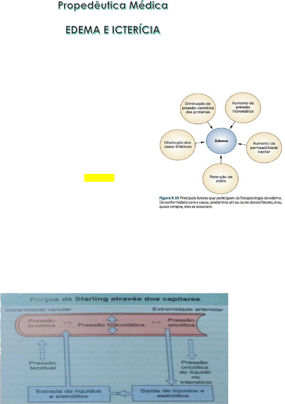 EDEMA O edema é definido como um aumento clinicamente aparente do volume do líquido intersticial até que se torne evidente no exame clínico. Um ganho ponderal precede o edema, assim como, paciente que induz diurese pode apresentar uma perda ponderal rápida com síndrome endemigênica. Há um aumento do volume do líquido intersticial, com aumento de peso até que se torne evidente o edema. Nos adultos, normalmente, há um ganho de 3 litros de água (acumulada) e sal para que o diagnostico possa ser feito. Anasarca é o termo usado para se referir a um edema generalizado, envolvendo mais de um segmento e não sendo restrito apenas aos membros inferiores. A localização do edema é extremamente importante para diagnosticar sua etiologia. Assim como, derrames especiais que ocorrem dentro da cavidade peritoneal denominado ascite, derrame hidropleural (entre a pleura parietal e visceral), derrame hidropericárdio e hidroartroses. Esses mecanismos podem estar associados a uma síndrome endemigênica ou associados a patologias distintas. Na anamnese deve-se perguntar essencialmente tempo de duração do edema, localização e a evolução, além da HPP e antecedentes familiares. Quando o paciente apresentar edema deve-se avaliar os seguintes parâmetros: I. Localização e distribuição II. Intensidade III. Consistência IV. Elasticidade V. Temperatura da pele circunjacente VI. Sensibilidade da pele circunjacente VII. Outras alterações da pele Localização e distribuição Edemas podem acometer região da face, região pré sacra em pacientes acamados e membros inferiores, mais frequentemente. Para avaliar essa síndrome deve-se observar primeiramente se o edema é localizado ou generalizado. Um edema localizado é um edema limitado a um órgão particular ou ao um leito vascular, facilmente distinguível do edema generalizado. Normalmente é um edema de extremidade unilateral, ocorre devido a uma obstrução venosa ou linfática, o paciente pode apresentar trombose venosa profunda, obstrução tumoral ou linfaedema primário. Edemas de extremidade inferior podem ocorrer por meio da paralização dos membros ou pós-traumático. Edema causado por alergias onde o paciente pode ter um angioedema ou um edema de face por obstrução da veia cava superior. Numa minoria dos pacientes, pode haver um edema localizado bilateral de membros inferiores quando houver obstrução de veia cava inferior, compressão, ascite ou massa abdominal. Já o edema generalizado é quando envolve a maioria das regiões do corpo. Intensidade A intensidade pode ser pesquisada comprimindo o edema contra uma superfície óssea por 5 segundos (região tibial, sacra, osso da face) surge então um “buraco” no lugar que comprimiu chamado de cacifo ou fópia. Esse cacifo pode ser medido e com isso determinar as cruzes desse edema (+/++++). Quando consegue comprimir, se entrar 2 mm na pele e rapidamente retorna ao normal +/4+. Se houver compressão de 4mm e levar de 10 a 15 segundos para a pele voltar ao normal ++/4+. Se o edema retrair 6mm e demorar retornar ao normal 3+/4+ e se o edema retrair 8mm e demorar quase 5 minutos para voltar ao normal 4+/4+. Num paciente que não apresenta cacifo a medida da intensidade pode ser feita medindo oo peso diário para avaliar quanto de líquido o paciente está perdendo. O paciente com insuficiência cardíaca, normalmente vai para casa e pede-se que ele reduza a ingestão de líquido e compre uma balança para analisar se está havendo perda de peso ou não, caso ele ganhe 3kg numa semana significa que ele está ganhando líquido, com isso ajusta-se o antidiurético antes de uma internação. Também é muito comum medir diariamente o perímetro da região edemaciada, normalmente em pacientes com insuficiência cardíaca, para analisar a diminuição ou aumento do edema. Consistência A consistência do edema pode ser dada avaliando se é de fácil constrição (mole) por retenção líquida e que não é prolongado, um exemplo seriam pacientes que estão desenvolvendo uma síndrome cardíaca. Já o edema duro acompanha uma proliferação fibroblástica que acompanha surtos inflamatórios repetidos ou edemas de longa duração, um exemplo seria um paciente com elefantíase (se apertar o edema não contrai) ou com erisipela (várias no mesmo membro). Elefantíase é uma síndrome caracterizada por uma hiperplasia cutânea regional decorrente da obstrução da circulação linfática com represamento da linfa, mais comum em membros inferiores com proliferação fibroblástica intensa. As causas mais comuns são filariose e erisipela. Elasticidade Edema elástico são os inflamatórios e os inelásticos, que demora para voltar para a posição original, são os edemas não inflamatórios. Os elásticos têm como exemplo erisipela e alteração por traumatismo ortopédico, já os inelásticos as insuficiências cardíacas e hepática. Um edema inflamatório (celulite, erisipela) possui cacife com tendência em voltar rápido para a posição de origem. A extensão também deve ser levada em consideração. Temperatura Deve avaliar a temperatura da pele edemaciada se está quente ou fria. Nos pacientes com insuficiência cardíaca ou hepática a temperatura é normal ou um pouco fria, já nos pacientes com erisipela ou pseudolíticos, o edema é aquecido e o restante da pele encontra-se mais fria. Isso deve ser descrito para avaliar uma capacidade inflamatória daquele edema. Sensibilidade Avaliar se o edema é doloroso ou não. Se sim, deve-se lembrar das patologias inflamatórias. Outras alterações A coloração também deve ser observada, se há palidez, cianose, vermelhidão. A palidez pode ser uma alteração na perfusão arterial. Já a cianose geralmente aparece quando há estase venosa. Quanto a textura da pele, pode ser lisa e brilhante quando o edema é recente. E, apresenta-se espessa quando há edemas de longa duração. Quando a pele fica toda “enrugadinha” é s