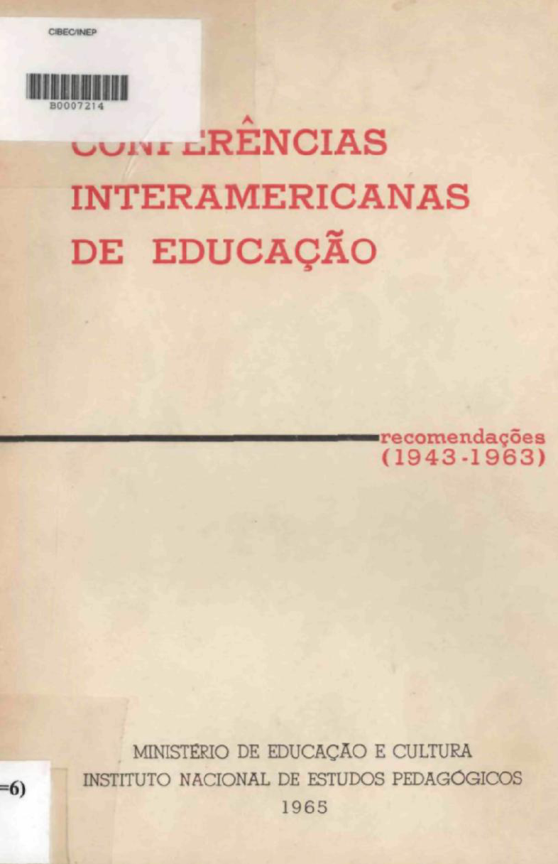 INSTITUTO NACIONAL DE ESTUDOS PEDAGÓGICOS CONFERENCIAS INTERAMERICANAS DE EDUCAÇÃO 1965 SUMÁRIO Apresentação (p. VII). PRIMEIRA REUNIÃO INTERAMERICANA DE MINISTROS DA EDUCAÇÃO: Utilização da radiodifusão com fins educativos (p. 1) — Diretores mínimos dos professores (p. 1) — Ensino de História da América (p. 2) — Concurso para um livro de História da América (p. 3) — Reconhecimento da obra dos educadores da América (p. 5) — Dia do professor (p. 5) — Comemorações nas escolas das grandes datas americanas (p. 6) — O folclore americano como fonte de inspiração na composição autóctone da arte musical e das canções escolares (p. 6) — Conservação e restauração dos monumentos e reliquias arqueológicas. Organização das instalações arqueológicas. Arqueologia e Paleontologia (p. 8) — Estudo dos quatro idiomas continentais (p. 9) — Ideais democráticos da escola americana (p. 9) — O Estado e o ensino particular (p. 10) — Educação indígena (p. 10) — Cursos supletivos e de continuação para adultos ( p. 11) — Escolas de ensino industrial e técnico (p. 12) — Participação da mulher nas atividades docentes (p. 13) — Formação de professor para a reorientação educacional da América (p. 14) — Construções escolares e colônias de férias para crianças (p. 14) — Desenvolvi- mento da educação física (p. 14) — Educação sanitària (p. 15) — Hino escolar americano (p. 15) — indice de alfabetismo na América (p. 15) — Ensino de crianças anormais (p. 16) — Campanha de alfabetização (p. 17) — Biblioteca seleta de obras americanas (p. 17) — Publicação de uma biblioteca escolar pan--americana (p. 18) — Ensino da História da Literatura Americana (p. 18) — A educação nas Américas (p. 18) — Ensino de Geografia da América (p. 19) — Dicionário Geográfico Americano (p. 19) — Mapas para o ensino de Geografia da América (p. 20) — Intercâmbio de publicações entre as nações da América (p. 20) — Intercâmbio bibliográfico e organização de bibliotecas (p. 21) — Intercâmbio dos documentos referentes à organização c regulamentação do ensino (p. 22) — Intercâmbios culturais das Américas (p. 23) — Ensino de Geografia Americana (Museus escolares) (p. 24) — Cuidado e conservação dos monumentos históricos e histórico-artísticos (p. 25) — Direitos de propriedade artística e inte-telectual (p. 25) — Equiparação e correlação de planos e certificados de estudo (p. 26) — Instituto interamericano de educação (p. 27) — Criação de estudos livres de artes plásticas (p. 28) — Criação de um Centro de Cooperação entre Bibliotecas, Arquivos e Museus (p. 28) — Associação Interamericana de Educação e Cultura (p. 29) — Vocabulário de termos técnicos (p. 30) — Textos de Geografia das Nações Americanas (p. 30) — Convenção sobre a Universidade Interamericana (p. 34) — Estatutos da Universidade Interamericana (p. 37). SEGUNDA REUNIÃO INTERAMERICANA DE MINISTROS DA EDUCAÇÃO: Declaração de Lima sobre generalização da educação primária e a eliminação do analfabetismo (p. 44) — Planejamento integral da educação (p. 46) — Financiamento de planos integrais para a educação (p. 47) — Responsabilidade individual, oficial e social pela educação (p. 49) — Formação de professores (p. 49) — Edificação escolar (p. 50) — Avaliação da educação pública com vistas à generalização do ensino primário (p. 51) — Administração da educação pública (p. 51) — Plano de ação para intensificar a educação fundamental nas zonas rurais (p. 52) — Estatística da educação (p. 54) — Projeto principal da Unesco sobre extensão da educação primária na América Latina (p. 54) — Escola Normal Rural Interamericana (p. 56) — Recomendações da Conferência Regional sobre a Educação Primária Gratuita e Obrigatória na América Latina (p. 56) — Reuniões interamericanas de ministros da educação (p. 57) — Métodos e materiais para as campanhas ou programas de alfabetização e educação fundamental (p. 58) — Estrutura administrativa dos planos de alfabetização e educação fundamental (p. 59) — Pre- paração de pessoal para as campanhas ou programas de alfabetização e educação fundamental (p. 60) — Alfabetização da mulher (p. 61). TERCEIRA REUNIÃO INTERAMERICANA DE MINISTROS DA EDUCAÇÃO: Definição de propósitos — A educação, a ciência, a cultura e os principios democráticos (p. 65) — Declaração de voto do Brasil (p. 66) — Diretrizes de política geral (p. 67) — Mecanismos de planejamento (p. 68) — Determinação das metas (p. 69) — Material didático (p. 69) — Construção de escolas, equipamentos e mobiliário (p. 70) — Recomendações — Metas de desenvolvimento da educação na América Latina (p. 70) — educação geral (p. 77) — ensino técnico-profissional (p. 77) — ensino superior (p. 79) — Considerações sobre assistência técnica e financeira externa co desenvolvimento da educação, ciência e cultura (p. 81) — Projetos de ação imediata — Planejamento integrado da educação (p. 83) — Órgãos do planejamento educacional (p 84) — Desenvolvimento doa recursos humanos (p. 84) — Administração da educação pública (p. 84) — Instituto de pesquisas pedagógicas (p. 84) — Formação de professores e supervisores (p- 85) — Escola isolada (p. 85) — Construção de prédios escolares (p. 85) — Educação de adultos e campanhas de alfabetização (p. 86) — Educação científica (p. 86) — Ensino técnico de grau médio (p. 86) — Fundo especial interamericano para as universidades latino-americanas (p. 86) — Associação de universidades nacionais e regionais (p. 87) — Serviço de bem-estar estudantil universitário (p. 87) — Ensino das ciências naturais e das ciências aplicadas (p. 87) — Bibliotecas públicas e escolares (p. 