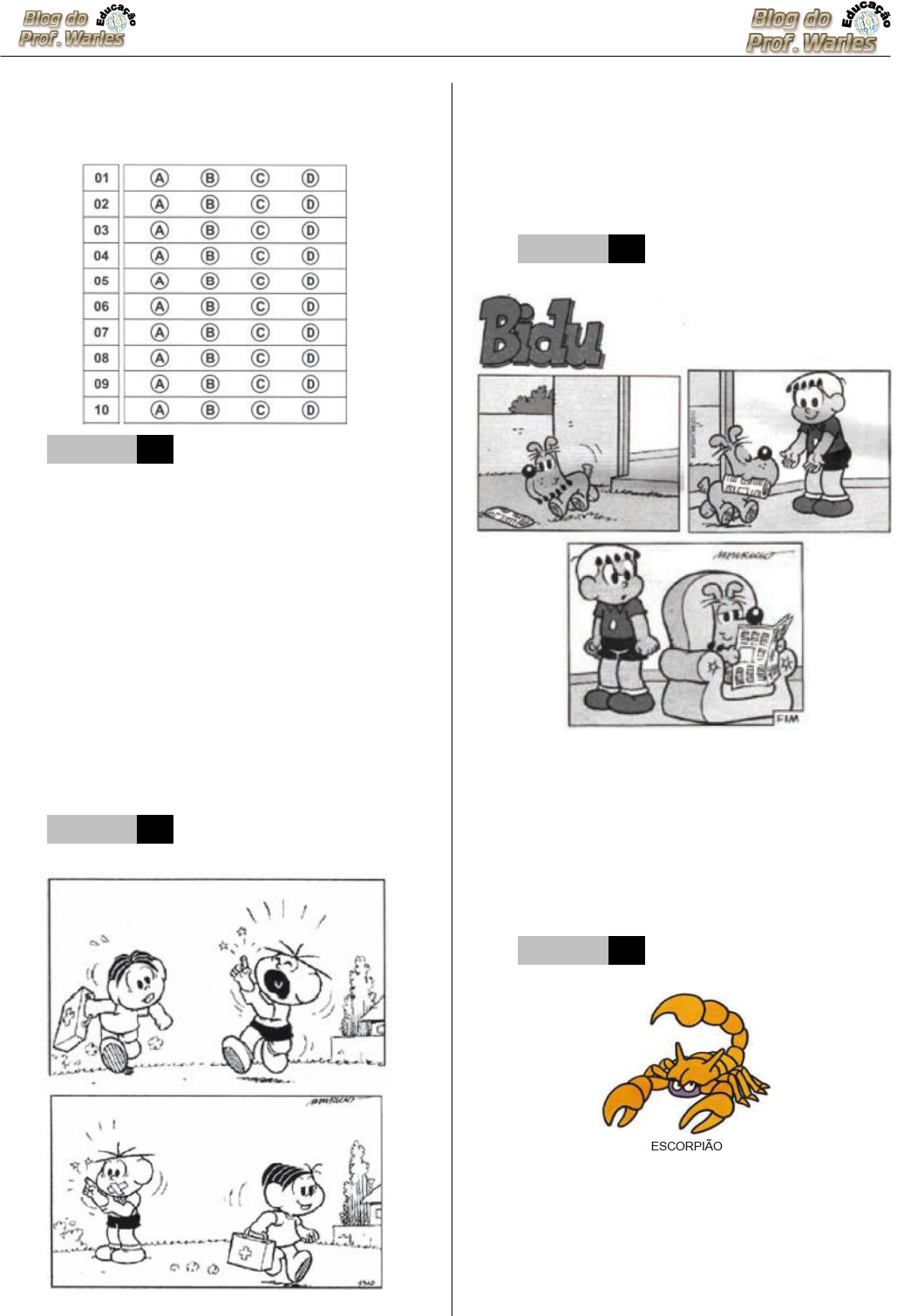 ���Simulado 02 – Português 3º Ano - Ensino Fundamental Simulado de Língua Portuguesa Escola: __________ Profª. _______________ Nome: _________________________________ H4 Questão 01 –––––––––––––––––––––––––( Leia o texto abaixo. A CUTIA A cutia é um bicho pequeno. Ela recolhe mais alimento do que consegue comer. O restante das castanhas ela enterra para comer mais tarde e acaba se esquecendo de onde as enterrou. Por causa disso as sementes acabam brotando e se tornam outras árvores. QUEIROZ, Luis Roberto. Animais brasileiros. São Paulo. A cutia enterra as castanhas para A) comê-las mais tarde. B) esquecer sua comida. C) plantar novas árvores. D) recolher mais alimento. H7 Questão 02 –––––––––––––––––––––––––( Leia o texto abaixo. http://.monica.com.br/comics/tirinhas/5362 . Acesso em 08 jun. 2002 A menina fechou a boca do menino para ele não A) brincar. B) comer. C) gritar. D) sorrir. H7 Questão 03 –––––––––––––––––––––––––( Leia o texto abaixo. SOUZA, Maurício de. Bidu. Rio de Janeiro: Globo, nº 23,1999. p.162 O menino ficou chateado porque o cachorrinho A) estragou o jornal. B) não lhe deu o jornal. C) quis rasgar o jornal. D) amassou o jornal. H8 Questão 04 –––––––––––––––––––––––––( Leia o texto abaixo. O escorpião possui até doze olhos, mas isso não o impede de ter uma péssima visão! Ainda bem que não precisa muito dela por ser um animal noturno, que caça durante a noite e consegue sentir suas presas (aranhas, insetos), graças a pêlos muito sensíveis às vibrações. (Texto retirado da Enciclopédia Planeta Animal. Girassol Brasil edições ltda.) O assunto do texto é A) a extinção do escorpião. B) a visão do escorpião. C) o ferrão da aranha. D) o habitat dos insetos. H9 Questão 05 –––––––––––––––––––––––––( Leia o texto abaixo. CAPUTO, Ruth Rozendo. Ciranda Cultural. p. 122. Adaptado. Nesse texto, o ponto de exclamação foi usado para indicar A) alegria. B) dúvida. C) surpresa. D) susto. H3 Questão 06 –––––––––––––––––––––––––( Leia o texto abaixo. Esse texto é uma A) carta. B) história. C) notícia. D) piada. H6 Questão 07 –––––––––––––––––––––––––( Leia o texto abaixo. MORAES, Vinícius de. A Arca de Noé: poemas infantis. São Paulo: Cia das Letras, p.36. O elefante estava correndo porque A) espetou o pé no espinho e sentia dor. B) estava com medo de um passarinho. C) estava procurando um bichinho perdido. D) ficou perdido e desconsolado. H5 Questão 08 –––––––––––––––––––––––––( Leia o texto abaixo. PAES, José Paulo. Olha o bicho. São Paulo: Ática, 1989. No verso “A cigarra é só cantiga”, cantiga é o mesmo que A) alegria. B) comida. C) fadiga. D) música. H6 Questão 09 –––––––––––––––––––––––––( Leia o texto abaixo. CAMARGO, Milton. A zebra, a girafa e outros bichos. São Paulo: Ática, 1982. O Canguru comprou um carrinho porque queria A) carregar os brinquedos do filho. B) dar de presente de aniversário ao seu filho. C) fazer uma longa viagem com seu filho. D) carregar seu filho sem se cansar. H6 Questão 10 –––––––––––––––––––––––––( Lendo texto abaixo, podemos concluir que: ... quem adota hábitos de higiene está trabalhando pela saúde individual e coletiva, evitando assim, transtornos e gastos com consultas a especialistas da área de Saúde e medicamentos. A) Quem cuida da higiene é menos saudável. B) Quem se previne e zela pela higiene evita gastos com médicos e remédios. C) Quem investe na higiene pessoal jamais terá que ir ao médico. D) A higiene não é tão importante para a manutenção da saúde das pessoas. � PAGE �3�