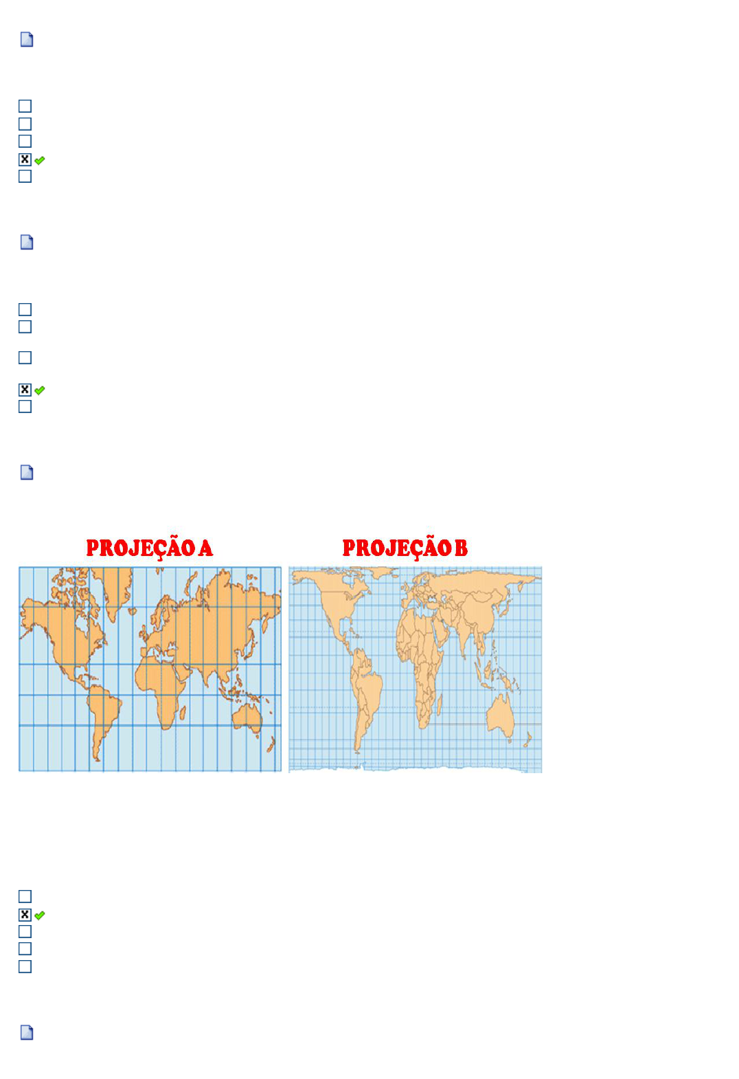 1a Questão (Ref.:201404028256) Acerto: 1,0 / 1,0 Em 1963, descobriu-se o mapa da cidade de Catal Hyük, cidade da antiga Anatólia. Essa parte asiática, importante para a história da Cartografia, forma o que hoje é qual país? Japão Vietnã Alemanha Turquia China 2a Questão (Ref.:201403637403) Acerto: 1,0 / 1,0 A Cartografia é a ciência que trata da concepção, produção, difusão, utilização e estudo dos mapas. Dentre as funções da cartografia NÃO está: A representação da superfície terrestre de forma clara e precisa; Possibilitar a identificação das características geométricas, da natureza e de outras particularidades dos objetos e fenômenos observados; Intervir na elaboração dos mapas a partir dos resultados das observações diretas ou da exploração da documentação; Auxiliar na elaboração de expressões matemáticas; Representar graficamente a superfície terrestre, tendo como produto final o mapa; 3a Questão (Ref.:201404031736) Acerto: 1,0 / 1,0 As duas projeções cilíndricas mais conhecidas são as de Mercator e a de Peters. Entre elas vamos traçar um quadro de diferenciações, embora sejam do mesmo tipo de projeção. Observe a figura apresentada e julgue as assertivas abaixo: I. A projeção A é de Mercator II. A projeção B é de Peters III. Ambas as projeções são de Mercator II e III I e II I, II e III III I e III 4a Questão (Ref.:201404031716) Acerto: 1,0 / 1,0 O princípio da geometria do sistema de projeções permitiu que muitos mapas fossem criados. As sombras projetadas no plano facilitaram a visualização e a interpretação do globo terrestre. Então, pode-se dizer que, atualmente, existem mais de duas centenas de formas de projeção, diferentes variações. Observe a figura apresentada. A figura representa qual projeção? Cilíndrica Plana Azimutal Cônica Dazul 5a Questão (Ref.:201404124370) Acerto: 1,0 / 1,0 A escala é definida como a relação da distância real entre dois pontos quaisquer na superfície da Terra com a distância entre esses dois pontos num documento cartográfico. Se, em uma carta, na escala 1:500.000, a distância em linha reta entre duas cidades for de 10 cm, no terreno essa distância será de: 50 km 10 km 06 km 20 km 05 km 6a Questão (Ref.:201404028296) Acerto: 1,0 / 1,0 A escala, em cartografia, é a relação matemática entre as dimensões do objeto no real e a do desenho que o representa em um plano ou um mapa. Constitui-se em um dos elementos essenciais de um mapa, juntamente com a orientação, a legenda (convenções cartográficas) e a fonte. Em uma escala 1:50.000 significa dizer que: 1cm no mapa é igual a 500 metros, na realidade 1cm no mapa é igual a 50.000.000 centímetro, na realidade 1cm no mapa é igual a 5.000.000 metros na realidade 1cm no mapa é igual a 5.000.000.000 metros na realidade 1cm no mapa é igual a 50.000.000 quilômetros na realidade 7a Questão (Ref.:201404028314) Acerto: 1,0 / 1,0 A introdução do geoprocessamento no Brasil inicia-se a partir do esforço de divulgação e formação de pessoal feito pelo prof. Jorge Xavier da Silva (UFRJ), no início dos anos 80. Os termos geoprocessamento e sistema de informação geográfica têm sido utilizados equivocadamente como sinônimos. Nesse sentido, assinale a alternativa que não corresponde a uma tecnologia utilizada no geoprocessamento. Pergamum Fotogrametria Cartografia Digital Sensoriamento Remoto Geoestatística 8a Questão (Ref.:201403498840) Acerto: 1,0 / 1,0 O geoprocessamento é um conjunto de técnicas relacionadas ao tratamento da informação espacial. Sendo assim, pode- se afirmar que no geoprocessamento: I. O sensoriamento remoto é um tipo de coleta de dados. II. O banco de dados é um tipo de armazenamento. III. A geoestatística é um tipo de tratamento de dados. IV. O sistema de informação geográfico é um tipo de sistema de uso integrado. Estão corretas apenas as afirmativas: III, IV I, II, III, IV I, IV I, II I, II, III 9a Questão (Ref.:201404028356) Acerto: 1,0 / 1,0 Durante a Segunda Guerra Mundial (1939 a 1945), foi desenvolvido o filme infravermelho como ¿filme de detecção de camuflagem. Sobre o infravermelho não é correto afirmar que: Energia na faixa de infravermelho não existe O infravermelho é um comprimento de onda da luz que não é captado pelos nossos olhos e nem pelo filme e sensores fotográficos comuns As radiações da banda infravermelha não podem ser geradas pelo Sol A vegetação sadia reflete a energia infravermelha muito mais fortemente que a energia verde, aparecendo nas fotografias em tons de vermelho Uma das características desse tipo de fotografia é que apenas fontes de calor (seres vivos) refletem de maneira saliente o infravermelho 10a Questão (Ref.:201403548293) Acerto: 1,0 / 1,0 O Sensoriamento Remoto é uma técnica que se iniciou com a utilização de fotografias da superfície da Terra, tomadas a partir de balões, para a elaboração de mapas ainda no século XIX, pouco tempo depois da invenção da fotografia. O termo sensoriamento remoto significa, a princípio: Obtenção de informações a partir do uso de apenas aviões e satélites Obtenção de informações a partir do uso de aviões Obtenção de informações a partir do uso de satélites Obtenção de informações sem o contato direto com o objeto de estudo Obtenção de informações a partir do uso de balões
