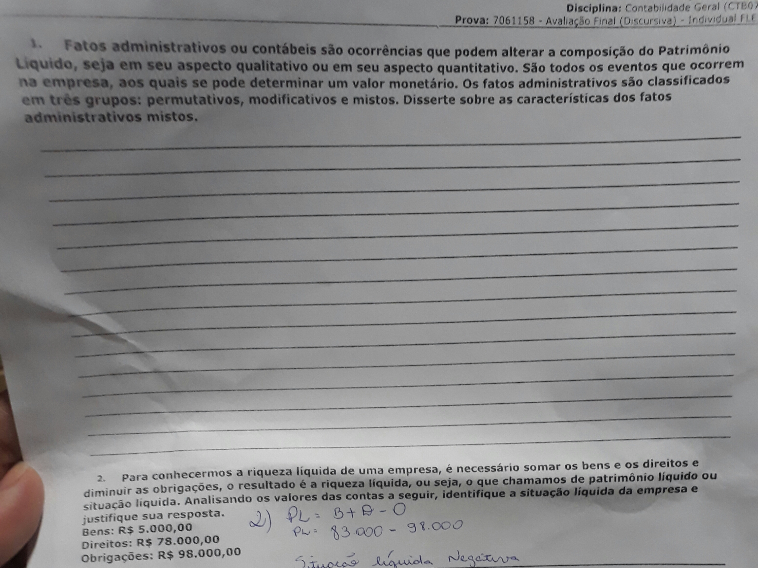 Exercícios 1. A verdadeira riqueza de uma empresa não está apenas na soma de seus bens, mas na diferença entre o que ela possui (bens e direitos...
