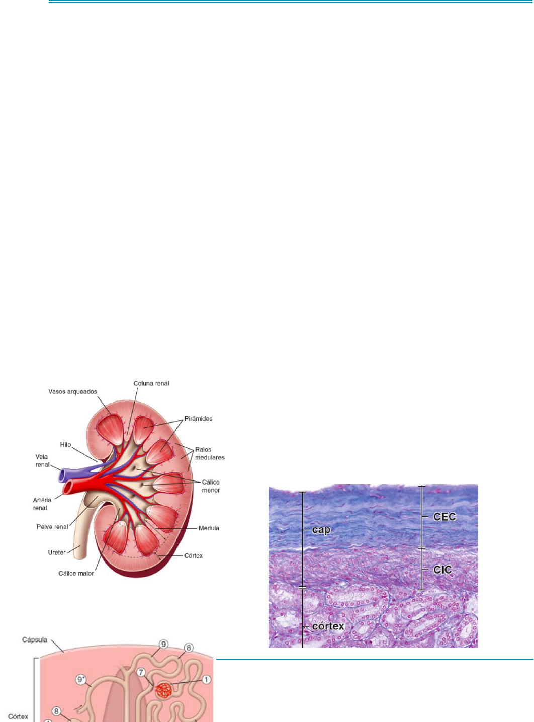 HISTOLOGIA Aula 02 - UC5 - P2 Sistema Urinário O sistema Urinário consiste em um par de rins, um par de ureteres, bexiga urinária e a uretra. os rins recuperam as substâncias essenciais e, ao mesmo tempo, eliminam os resíduos. Para manter a homeostasia, os rins conservam a água, os eletrólitos e certos metabólitos. Os rins são essenciais na manutenção de um pH plasmático constante e na regulação do equilíbrio acidobásico. A manutenção desse pH ideal é obtida pela excreção de íons hidrogênio quando os líquidos corporais se tornam excessivamente ácidos, ou pela excreção de bicarbonatos quando os líquidos corporais se tornam muito básicos. Os produtos de degradação metabólicos são descarregados pelas células na circulação; em seguida, são removidos do sangue por filtração nos rins e, finalmente, excretados na urina. Ambas as funções excretora e homeostática dos rins iniciam-se quando o sangue adentra o aparelho de filtração nos glomérulos. Inicialmente, o plasma é separado das células e das grandes proteínas, resultando em um ultrafiltrado glomerular de sangue ou urina primária, a qual é ainda modificada por reabsorção seletiva e secreção específica pelas células do rim. A urina final é transportada pelos ureteres até a bexiga, onde é armazenada até ser eliminada através da uretra. A urina contém água e eletrólitos, bem como produtos de degradação de várias substâncias, tais como ureia, ácido úrico e creatinina. Os rins também funcionam como órgão endócrino. As atividades endócrinas dos rins incluem: • Síntese e secreção do hormônio glicoproteico eritropoetina (EPO), que atua sobre a medula óssea e que regula a formação dos eritrócitos em resposta a uma diminuição na concentração de oxigênio do sangue. • Síntese e secreção da protease ácida, a renina, uma enzima envolvida no controle da pressão arterial e no volume sanguíneo. Estrutura geral do rim: Cápsula: A superfície do rim é recoberta por uma cápsula de tecido conjuntivo. A cápsula consiste em duas camadas distintas: uma camada externa composta de fibroblastos e fibras colágenas uma camada interna que contém miofibroblastos A cápsula torna-se contínua com o tecido conjuntivo, formando as paredes dos cálices e da pelve renal Córtex e Medula: Córtex - parte externa Medula - parte interna O córtex consiste em corpúsculos renais, juntamente com os túbulos contorcidos e túbulos retos do néfron, túbulos conectores(conecta o tubulo contorcido distal a ducto coletor), ductos coletores e um extenso suprimento vascular. Os corpúsculos renais constituem o segmento inicial do néfron e contêm uma rede singular de capilares, denominada glomérulo. Cada raio medular consiste em uma agregação de túbulos retos e ductos coletores. Cada néfron e seu túbulo conector (que se liga a um ducto coletor no raio medular) formam o túbulo urinífero. O córtex também possui a célula justaglomerular e e mácula densa. . A medula caracteriza-se por túbulos retos, ductos coletores e uma rede especial de capilares, os vasos retos. Os túbulos retos dos néfrons e os ductos coletores partem do córtex para dentro da medula. . Os túbulos na medula, em virtude de sua disposição e das diferenças de comprimento, formam, em conjunto, estruturas cônicas, denominadas pirâmides (há em gelada 8 a 12 pirâmides no rim). . A porção apical de cada pirâmide, que é conhecida como papila, projeta-se dentro de um cálice menor, uma estrutura em formato de taça que representa uma extensão da pelve renal. . Cada pirâmide é dividida em uma medula externa (adjacente ao córtex) e em uma medula interna. A medula externa é ainda subdividida em uma faixa interna e uma faixa externa. O número de lobos em um rim é igual ao número de pirâmides medulares. Cada pirâmide medular e o tecido cortical associado à sua base e lados (metade de cada coluna renal adjacente) constituem um lobo do rim. Os lobos do rim são ainda subdivididos em lóbulos, que consistem em um raio medular central e o córtex circundante. Néfron: O néfron é a unidade estrutural e funcional fundamental do rim. Ambos os rins humanos contêm aproximadamente 2 milhões de néfrons. Estes são responsáveis pela produção de urina e correspondem à porção secretora de outras glândulas. O néfron consiste no corpúsculo renal e em um sistema de túbulos. o corpúsculo renal representa o início do néfron. É formado pelo glomérulo, um tufo de capilares composto de 10 a 20 alças capilares, circundado por um capuz epitelial de dupla camada, a cápsula renal ou de Bowman. A cápsula de Bowman é a porção inicial do néfron, em que o sangue que flui através dos capilares glomerulares sofre filtração, produzindo o ultrafiltrado glomerular. Os capilares glomerulares são supridos por uma arteríola aferente e drenados por uma arteríola eferente. Por sua vez, a arteríola aferente se ramifica, formando uma nova rede de capilares que irão suprir os túbulos renais. O local de entrada e saída das arteríolas aferente e eferente na camada parietal da cápsula de Bowman é denominado polo vascular. Em posição oposta ao polo vascular está o polo urinário do corpúsculo renal, local em que se inicia o túbulo contorcido proximal OBS// Túbulo unífero = néfron + túbulo coletor Diversos néfrons são drenados por um único túbulo coletor. Muitos túbulo coletores se unem na região medular profunda - formam os ductos de Bellini - perfuram a papila renal (ápice da pirâmide renal) na área crivosa (cribriforme) Da papila, o conteúdo vai para o cálice menor e depois para o cálice maior (união de 2 a 3 cálices menores vizinhos). 3 a 4 cálices maiores se abrem na pelve renal Aparelho de filtração dos rins: O corpúsculo renal contém o aparelho de filtração do rim, que consiste no endotélio glomerular, na membrana basal glomerular subjacente e na camada visceral da c