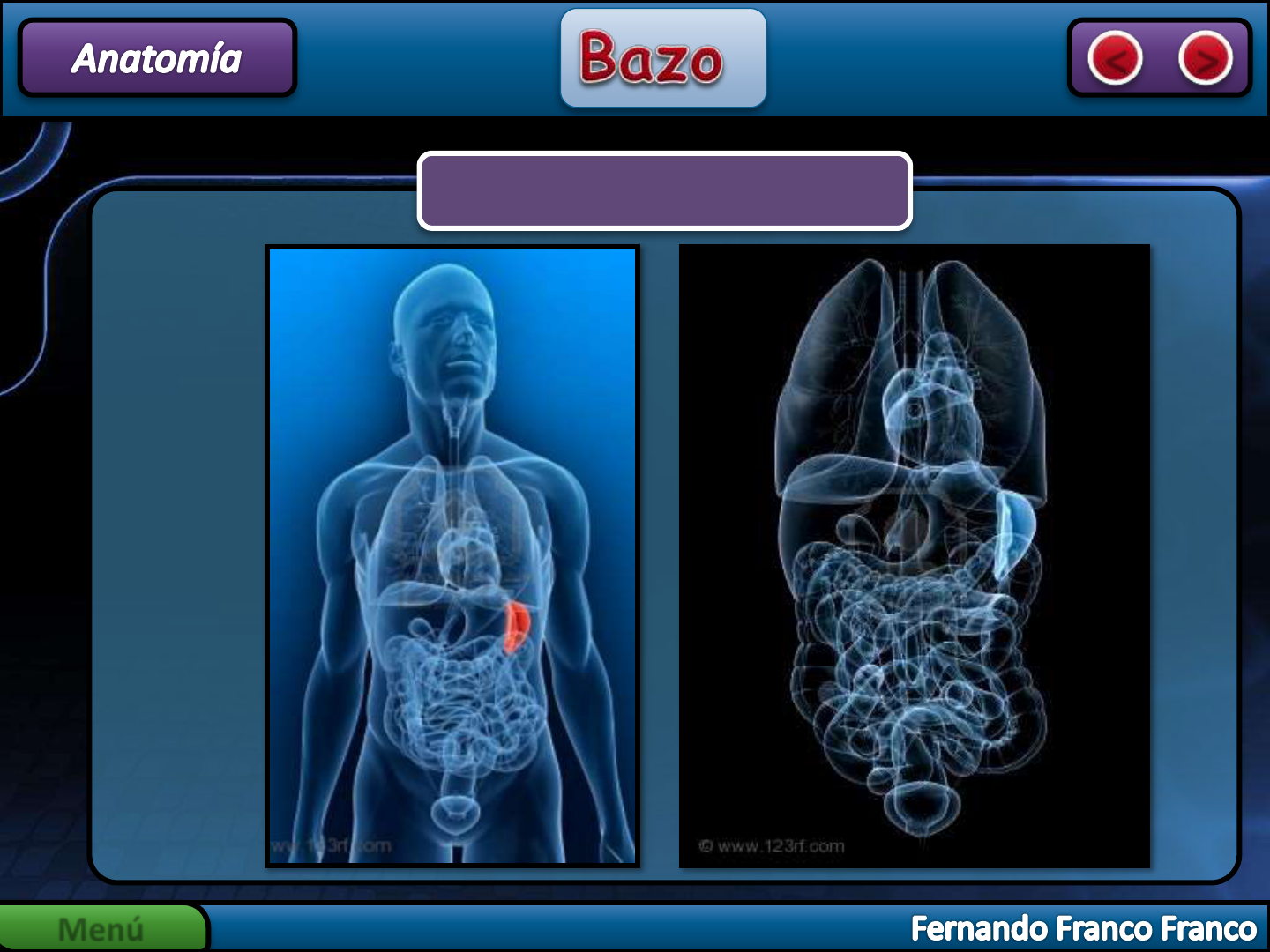 Menú < > Menú < > Menú < > Menú < > Curvatura Menor: A. Coronaria Estomatica – A. Pilórica Curvatura Mayor: A. Gastroepiploica Derecha – A. Gastroepiploica Izquierda Menú < > Pars Condensa: A. hepática izq Menú < > Pars Pediculada Pars Condensa Pars Flaccida Hep Cis Duo Col Rod 1º y 2º Maniobra de Pringel Menú < > Pedículo hepático Lóbulo Spiegel Bulbo Vena Cava Menú < > A. Gatroepiploica derecha A. Hepática A. Coronario Estomatica Estómago – Duo Páncreas Serosa visceral Ant y Post Celda esplénica Epiplón: Pancreaticoesplénico Gastroesplénico Fascia de Treitz (duodenopancreática) Menú < > Menú < > Asa – A. Mesentérica sup Mesenterio (Raiz) – Colon Ascendente Fascias de Coalescencia Karl Told 1 (colon Asc) •Carl Told 3 (Pre – Fredet) •Carl Told 4 (Retro – Treitz) Karl Told 2 (Colon Desc) Menú < > Menú < > Fascia Innominadas Epiplón “Gastrocólico” Hojas del Epiplón Transcavidad de los Epiplones Menú < > Puerta Vestíbulo Foramen Bursae Omentalis Transcavidad Menú < > Menú < > Menú < > Saco de Douglas Fondo Vesicouterino Menú < > 1990 2010