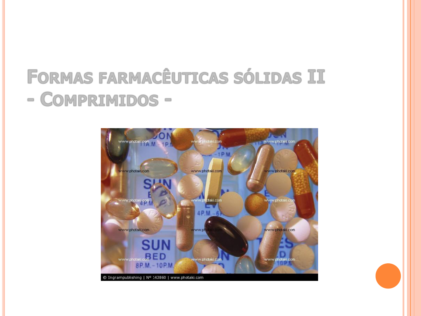 FORMAS FARMACÊUTICAS SÓLIDAS II - COMPRIMIDOS - COMPRIMIDOS TIPOS DE COMPRIMIDOS • Comprimidos Convencionais; • Comprimidos revestidos por película e por açúcar (drágeas); • Comprimidos mastigáveis (manitol); • Comprimidos sublinguais; • Comprimidos Multicamadas • Comprimidos efervescentes; • Comprimidos de liberação programada. COMPRIMIDOS PRODUZIDOS POR COMPRESSÃO • Bom fluxo; • Boa densidade; • Boa capacidade de adesão e coesão; • Boas características cristalinas; • Características físico-químicas adequadas. Equipamentos Compressora Rotativa Compressora Excêntrica Punções Jogos de punções Formatos dos punções que determinam a forma dos comprimidos. 1 – Face chata lisa 2 - Face chata chafrada 3 – Côncavo raso rasa 4 - Côncavo padrão 5 – Côncavo fundo 6 – Côncavo extra Componentes dos comprimidos Princípios Ativos Diluentes Aglutinantes Desintegrantes ou desagregantes Lubrificantes, antiaderentes e deslizantes Corantes, aromatizantes e edulcorantes Comprimidos Convencionais (liberação imediata) Mais comuns, planejados para desintegrarem rapidamente, obtidos por: Compressão direta Granulação via seca/Dupla Compressão Granulação via úmida Compressão direta mistura Lubrificante e desintegrante comprimido pesagem Fármaco + excipientes compressão Vantagens Intervenção reduzida de operadores; Processo executado a seco; Diminuição de fases durante o processo; Desvantagens Diminuição da uniformidade de conteúdo do fármaco, caso exista diferenças de tamanho de partículas; Fármacos de elevada dosagem. Granulação Via Úmida mistura malaxagem granulação secagem calibraçãolubrificantecompressão comprimido pesagem Fármaco + excipientes Agregante Vantagem Dispersão e distribuição do fármaco mais uniforme Desvantagem Caro, complexo e demorado; Maior espaço físico, muitos equipamentos; Menor estabilidade de fármacos sensíveis à umidade e ao calor; Granulação Via Seca mistura fragmentação calibração lubrificantecompressão comprimido pesagem Fármaco + excipientes Pré-compressão Vantagem Grânulos escoam mais uniformemente do que a mistura original; Fármacos sensíveis a umidade e calor, dose efetiva elevada; Desvantagem Tempo; Desgaste de máquinas; Liberação de pós para ambiente. Comprimidos Multicamadas Comprimidos com várias camadas As camadas vão se adicionando e sendo levemente comprimidas até a última e mais severa compressão. Ex: Coristina d Comprimidos revestidos por compressão O núcleo é comprimido dentro de outro comprimido Núcleo Revestimento Comprimidos de liberação programada Liberação controlada Liberação retardada São preparados utilizando polímeros em sistemas matriciais ou revestimento Comprimidos Revestidos por Películas ‣ Finalidades do processo de revestimento Mascarar sabor desagradável de certos fármacos; Conferir proteção física e química ao fármaco; Controlar a liberação dos fármacos; Proporcionar características especiais de liberação do fármaco - ação do estômago. ‣ Tecnologia de Obtenção Drageadeira ou tangerina (Bacia Convencional); Sistemas de Bacias Perfuradas (Hi- Coater); Leito Fluido. Drageadeira ou Tangerina Sistema Hi-Coater Equipamentos Leito Fluido Controle de Qualidade Peso médio Dureza Friabilidade Desintegração Teor Dissolução Umidade