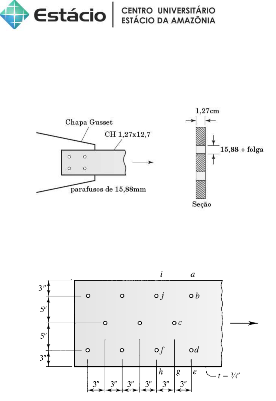 CCE0182 – ESTRUTURAS DE AÇO – LISTA DE EXERCÍCIOS 01 ASSUNTO: PEÇAS TRACIONADAS Página 1 de 3 Denominam-se peças tracionadas as peças sujeitas a solicitações de tração axial, ou tração simples. 1ª QUESTÃO: Uma chapa de 1/2 x 5” (1,27 x 12,7 cm) de aço A36 (MR250) é solicitada à tração conforme indicado na figura. Ela está conectada à uma chapa gusset por quatro parafusos de diâmetro 5/8” (15,875 mm). Determine o esforço de tração resistente pelo método dos estados limites. Respostas: Área bruta (Ndres = 366,59 kN) e área líquida (Ndres = 331,85 kN). 2ª QUESTÃO: Determinar a menor área líquida An para a chapa representada a seguir, considerando os percursos básicos (abde; abcde). Os furos são para parafusos de diâmetro 1” (2,54 cm), as dimensões verticais entre furos são 3”, 5”, 5” e 3” (7,62cm; 12,7cm; 12,7cm e 7,62 cm), totalizando 16” (40,64 cm), as dimensões horizontais são sempre iguais a 3” (7,62 cm) e a espessura vale t = 3/4” (1, 905 cm). Resposta: An = 65,26 cm2. CCE0182 – ESTRUTURAS DE AÇO – LISTA DE EXERCÍCIOS 01 ASSUNTO: PEÇAS TRACIONADAS Página 2 de 3 3ª QUESTÃO: Uma cantoneira L 3 1/2 x 3/8” (22,58 x 0,953cm) está conectada a uma chapa gusset por parafusos de 22,22 mm como mostra a figura. Sendo o tipo do aço A36 (MR250), a carga permanente de equipamentos aplicada de 115,69 kN e a carga variável de uso de 66,72 kN, determine se o elemento é capaz de resistir as solicitações impostas. Assumir que Ct = 0,85 e Ag = 16,13 cm 2. Resposta: Ndres = 344, 51 kN > NSd = 273, 61 kN, o elemento resiste à solicitação imposta. 4ª QUESTÃO: Um perfil formado por duas cantoneiras L 5 x 3 x 5/16” LLBB (long-legs back-to-back) de aço A36 (MR250) está sujeito à esforços de tração. Determinar a força axial de tração resistente de cálculo, assumindo-se: Ct=0,75, área da cantoneira de 15, 55 cm 2 e furos para parafusos de 1/2” (1,27 cm). Observar ainda que uma cantoneira L 5 x 3 x 5/16” é aproximadamente equivalente a L 12,7 x 7,62 x 0,794 cm. Resposta: Ndres = 576,74 kN. 5ª QUESTÃO: Determinar o valor de Ct do elemento sujeito a esforços de tração representado na figura abaixo, sendo a cantoneira tipo L 6 x 1/2” (15,24 x 1,27cm), a distância entre furos igual a 3” (7,62 cm). Resposta: Ct = 0,72. CCE0182 – ESTRUTURAS DE AÇO – LISTA DE EXERCÍCIOS 01 ASSUNTO: PEÇAS TRACIONADAS Página 3 de 3 6ª QUESTÃO: Determinar o valor de Ct do elemento sujeito a esforços de tração representado na figura, sendo a cantoneira tipo L 6 x 6 x 1/2” (15,24 x 15,24 x 1,27 cm). Resposta: Ct = 0,70. 7ª QUESTÃO: Determine a menor área líquida An para o perfil C 6 x 13” (15,24 x 33,02 cm) mostrado na figura, sendo os parafusos de 15,88 mm (5/8”), Ag = 24, 65cm2, espessura t = 1,11 cm e as dimensões 1,5 ”= 3,81 cm; 3” = 7,62 cm e 2” = 5,08 cm. Resposta: An = 21,28 cm2.