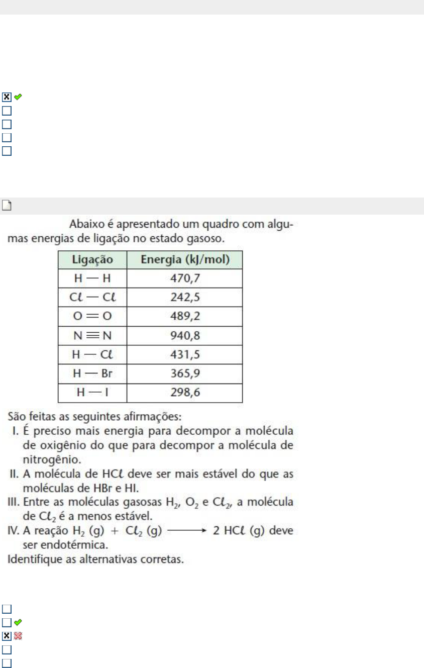 1a Questão (Ref.:201607334791) Pontos: 0,1 / 0,1 Uma reação bioquímica estudada por um farmacêutico envolveu a liberação de 300 kJ de calor à pressão constante e, como consequência, da mesma observou-se uma variação de entropia de -56 J/K no sistema. Qual a variação de energia livre de Gibbs, considerando que a reação ocorreu em um organismo a uma temperatura de 37 0C? -282640 J -212640 J -382640 J -182640 J -222640 J 2a Questão (Ref.:201608132391) Pontos: 0,0 / 0,1 Apenas I, III e IV Apenas II e III Apenas II, III e IV Apenas I e III Apenas I e II 3a Questão (Ref.:201607334742) Pontos: 0,1 / 0,1 Um farmacêutico deseja estudar o equilíbrio químico para a reação de formação da amônia (NH3). Estudos termodinâmicos mostram que, no equilíbrio químico, a uma temperatura adequada, as pressões parciais de NH3(g), de N2(g) e de H2(g) na reação de formação são, respectivamente: 0,2 bar; 0,1 bar e 0,3 bar. Qual a opção que mostra o valor da constante de equilíbrio (k) na temperatura estudada? Reação: : 0,5 N2(g) + 1,5 H2(g) = NH3(g) k = 0,8 k = 2,6 k = 3,8 k = 0,5 k = 0,2 4a Questão (Ref.:201608094450) Pontos: 0,1 / 0,1 Nas células biológicas que têm suprimento abundante de O2, a glicose é completamente oxidada a CO2 e H2O. As células musculares podem ficar com falta de O2 durante exercícios vigorosos. Nesse caso, uma molécula de glicose é convertida em duas moléculas de ácido lático pelo processo de glicólise. Dadas as equações termoquímicas para a combustão da glicose e do ácido láctico: C6H12O6 (s) + 6O2(g) → 6CO2 (g) + 6H2O(l) ΔH°=-2808 kJ CH3CH(OH)COOH (s) + 3O2(g) → 3CO2 (g) + 3H2O(l) ΔH°=-1344 kJ Calcule a entalpia-padrão para a glicólise: C6H12O6 (s) → 2CH3CH(OH)COOH (s) - 1464 kJ/mol - 120 kJ/mol - 110 kJ/mol + 120 kJ/mol + 110 kJ/mol 5a Questão (Ref.:201607381246) Pontos: 0,1 / 0,1 A capacidade calorífica de um líquido cuja temperatura se eleva de 6 K quando recebe 240 J de calor está corretamente indicada na opção: 20 J/K 234 J/K 40 J/K 24 J/K 246 J/K