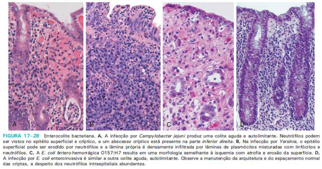 Enterocolite infecciosa: diarreia, dor abdominal, urgência, desconforto perianal, incontinência e hemorragia. Cólera: Vibrio cholerae, gram negativa, em forma de vírgula, transmitida por água contaminada e algumas vezes por alimentos (frutos do mar) contaminados, prefere temperaturas quentes. São não invasisos e permanecem no lúmen intestinal, sendo a doença causada por uma enterotoxina pré-formada, a toxina da cólera, sendo composta por algumas subunidades, essas subunidades vão ser responsáveis pela ligação nas células epiteliais intestinais, e causarão um desequilíbrio nos íons cloreto, que serão liberado no lúmen, causando a secreção de bicarbonato, sódio e água, o que leva a uma diarreia massiva, e a absorção desses elementos também fica inibida. A maioria dos indivíduos expostos é assintomática ou desenvolve somente diarreia branda. Naqueles com a doença grave, há um início abrupto de diarreia aquosa e vômitos seguindo um período de incubação de 1 a 5 dias. As fezes volumosas se assemelham a água de arroz e são, algumas vezes, descritas como tendo odor de peixe. A taxa de diarreia pode alcançar 1 litro por hora, levando à desidratação, hipotensão, câimbras musculares, anúria, choque, perda de consciência e morte. A maioria das mortes ocorre dentro das primeiras 24 horas após a apresentação. Campylobacter jejuni: diarreia dos viajantes; alimentos contaminados, leite não pasteurizado, 4 propriedades principais de virulência: mobilidade (flagelos), aderência, produção de toxina (lesão epitelial) e invasão. Febre entérica ocorre quando as bactérias se proliferam na lâmina própria e nos linfonodos mesentéricos. Complicações: Síndrome de Guillain-Barré. São organismos em forma de vírgula, gram negativos; diagnóstico por cultura de fezes; colite aguda autolimitada (infiltrados neutrofílicos mucosos e intraepiteliais são proeminentes, criptite [infiltração de neutrófilos nas criptas], abcessos crípticos [criptas com acúmulos de neutrófilos luminais]). Diarreia aquosa, disenteria (15%) Shigella: bacilos gram negativos, encapsuladas, imóveis, anaeróbicos facultativos que pertencem às Enterobacteriaceae, relacionados a ECEI. Desinteira. Transmissão fecal-oral, alimentos contaminados. É resistente ao meio ácido do estômago, quando chega ao intestino, são captadas pelas células epiteliais M, proliferam intracelularmente, escapam para a lâmina própria e são fagocitadas por macrófagos, nos quais elas induzem a apoptose. O processo inflamatório danifica a superfície epitelial e permite que a Shigella tenha acesso à membrana basolateral do clonócito. Acomete mais o cólon esquerdo e o íleo. A mucosa é hemorrágica e ulcerada, e pseudomembranas podem estar presentes. Doença autolimitadas, 6 dias de diarreia, febre e dor abdominal; a diarreia evolui para desinteira em 50% dos casos. Salmonelas: família Enterobacteriaceae, bacilos gram negativos, divididas em typhi e não typhi. Alimentos contaminados. Características semelhantes à shigella e campylobacter. Varia desde fezes moles e diarreia profusa ate disenteria.