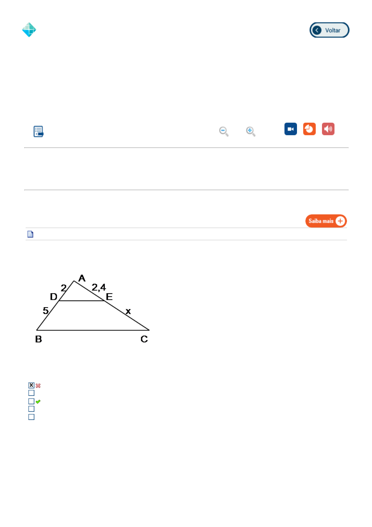 18/05/2018 EPS http://simulado.estacio.br/alunos/ 1/4 CEL0483_EX_A6_201707162719_V1 FUNDAMENTOS DE GEOMETRIA I 6a aula Lupa Vídeo PPT MP3 Exercício: CEL0483_EX_A6_201707162719_V1 18/05/2018 22:01:21 (Finalizada) Aluno(a): THAYNÁ SILVA DEBOSSAN 2018.1 EAD Disciplina: CEL0483 - FUNDAMENTOS DE GEOMETRIA I 201707162719 Ref.: 201707187629 1a Questão Determine o valor de x, sabendo que DE//BC. 10,4 7,4 6 8 10 Explicação: 2/5 = 2,4/x 2x = 12, logo x = 6 Ref.: 201707744760 18/05/2018 EPS http://simulado.estacio.br/alunos/ 2/4 2a Questão Para dividir um terreno triangular ABC foi construída uma cerca interna DE, paralela ao lado AC, sendo DE = 40m , formando uma nova área triangular DBE, com os lados DB = 30m e BE=20m . Sabendo que a frente AC do terreno tem 120m, quais são as medidas originais dos lados AB e BC do terreno ? 110 e 100 120 e 80 60 e 40 90 e 60 10 e 7 Ref.: 201707751388 3a Questão Se uma base de 50 cm produz uma sombra de 20 cm, Calcular a altura de um poste cuja sombra é de 3m no mesmo momento. 7,5 2,5 3,5 5,5 4,5 Ref.: 201707752776 4a Questão Utilizando a figura abaixo, calcule x. 7 10 8 9 11 Ref.: 201707447324 5a Questão 18/05/2018 EPS http://simulado.estacio.br/alunos/ 3/4 Sabendo que a razão entre os perímetros de dois hexágonos regulares é 2/3, qual a razão entre suas áreas? 2/3 9/4 4/9 1 3/2 Ref.: 201707412915 6a Questão Dois polígonos são semelhantes quando têm: Nenhuma das respostas é correta. Dois ângulos geometricamente iguais. Os lados correspondentes proporcionais. Todas as respostas estão corretas. Seus ângulos e lados correspondentes são, respectivamente, congruentes e proporcionais. Ref.: 201707189739 7a Questão Um triângulo cujos lados medem 24cm, 36cm e 40cm é semelhante a outro triângulo de 30cm de perímetro. Calcule a medida do menor lado do segundo triângulo. 8,2 cm 5,2 cm 9,2 cm 6,2 cm 7,2 cm Explicação: 24 + 36 + 40 = 100 cm 100 / 20 = 24 / x 100x = 30.24 100x = 720 x = 7,2 cm Ref.: 201707419528 8a Questão Ao estudar a semelhança entre polígonos, um aluno escreveu as seguintes afirmações a respeito da razão de semelhança k entre os triângulos: I - A razão ente os perímetros é uma constante k. II - A razão entre os raios dos círculos inscritos é k. III - A razão entre as áreas das figuras semelhantes é k2. Baseado nas informações acima, escolha a opção correta: 18/05/2018 EPS http://simulado.estacio.br/alunos/ 4/4 Apenas as afirmativa II e III estão corretas Todas as afirmativas estão corretas Apenas a afirmativa I está correta Nenhuma das afirmativas está correta Apenas a afirmativa III está correta