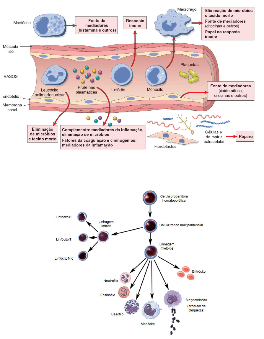 FUNÇÕES DAS CÉLULAS DO PROCESSO INFLAMATÓRIO Normalmente, as moléculas e células de defesa circulam no sangue, e o alvo da reação inflamatória é trazê-las para o local da infecção ou lesão tecidual. Vários tipos de moléculas e células exercem papéis importantes, incluindo proteínas plasmáticas, leucócitos, células endoteliais e células do tecido conjuntivo. FONTE: KUMAR et al., 2008 1. CÉLULAS ENDOTELIAIS Papel importante em fenômenos como: - Tônus vascular: liberação de mediadores químicos que promovem vasodilatação (p.ex., óxido nítrico). - Fenômenos exsudativos: contração endotelial e mecanismos de adesão endoteliócito / leucócito. - Papel também na angiogênese (que ocorre no processo de reparo, na inflamação crônica e também no câncer – como veremos posteriormente). 2. MASTÓCITOS - Armazenam grânulos com substâncias - particularmente histamina. - Estrategicamente posicionados próximos aos vasos sanguíneos. - A histamina (pré-formada) é liberada em resposta a vários estímulos: lesão física (calor, trauma), reações imunes, fragmentos do complemento(C3a e C5a), proteínas de liberação da histamina derivadas de leucócitos, neuropeptídeos e certas citocinas (IL-1, IL-8). 3. CÉLULAS “SENTINELA” - Macrófagos, células dendríticas. - Nos tecidos, atuam como “filtros” para materiais particulados, micróbios e células senescentes, ativando componentes específicos do sistema imune adaptativo (linfócitos T e B). - Têm a capacidade de reconhecer padrões moleculares associados a patógenos (PAMP). - Os receptores que reconhecem os PAMP (alguns denominados toll-like receptor – TLR) são codificados no DNA do hospedeiro e expressos na superfície dessas células. - A interação TLR-PAMP estimula as células-sentinela a responder imediatamente, deflagrando vias de sinais intracelulares que resultam na produção das principais citocinas inflamatórias (IL-1 e TNF). - Por sua vez, essas citocinas provocam aumento da permeabilidade vascular e estimulam a expressão de moléculas de adesão que facilitarão a diapedese. 4. NEUTRÓFILOS (ou PMNs, ou polimorfonucleares) - Desempenham suas funções nos tecidos o sangue é veículo entre locais de formação, armazenamento e atividade. Ou seja, a demanda aumentada é refletida em números aumentados na circulação (isso é válido para todos os leucócitos). - Constituem a primeira onda de migração, sendo que os primeiros neutrófilos podem ser observados nos tecidos cerca de 90 minutos após a agressão (CONSOLARO, 2009). - É a célula predominante nas primeiras 24 a 48 horas da inflamação; ou seja, caracteriza a inflamação aguda. - Este predomínio inicial deve-se ao seu maior percentual entre os leucócitos circulantes (40 a 70%), e também à sua maior responsividade e agilidade de movimentação frente aos fatores quimiotáticos. Você pode observar a agilidade desta célula frente a fatores quimiotáticos no seguinte link http://www.youtube.com/watch?v=I_xh-bkiv_c (se preferir, clique sobre a figura com a tecla Ctrl pressionada) - Têm a capacidade de englobar, matar e digerir microorganismos, particularmente bactérias e fungos. São ativados tanto pela presença desses microorganismos (através de produtos bacterianos e componentes do complemento) quanto pela presença de tecido lesado (pela presença de metabólitos do ácido araquidônico). - Quando o neutrófilo é ativado, as enzimas proteolíticas e os produtos tóxicos de oxigênio por ele gerados danificam os próprios tecidos do hospedeiro. Também quando se desintegra as enzimas são liberadas no interstício, onde agem agredindo os tecidos inflamados. - A ação das enzimas neutrofílicas pode dar um aspecto viscoso e amarelado ao exsudato inflamatório, que passa a ser identificado como exsudato supurativo ou purulento (pus). Algumas vezes, os neutrófilos são denominados piócitos, e os microorganismos que frequentemente geram essa resposta são denominados microorganismos piogênicos (em especial, estreptococos e estafilococos). - Nos tecidos, os neutrófilos morrem após aproximadamente dois dias. Logo, é necessário que a produção de neutrófilos pela medula seja capaz de compensar a sua contínua destruição. FONTE: KUMAR et al., 2008 5. EOSINÓFILOS - Constituem de 1 a 6% dos leucócitos circulantes. - Também são células fagocitárias, que estão relacionadas a destruição de complexos antígeno-anticorpo, sendo muito encontradas nas reações de hipersensibilidade, especialmente naquelas relacionadas a anticorpos IgE. - Encontram-se aumentados também na ocorrência de parasitoses (helmintos), sendo que seus produtos podem lesar esses parasitas. - Uma vez ativados se degranulam e liberam seus produtos. - Têm vida longa (vários dias, e mesmo semanas), e desta forma, agem por mais tempo. - Tem sido considerado de importância primária na patogenia da fase tardia da asma, em que suas proteínas granulares provocam lesão ao endotélio bronquiolar (Rang et al, 2004). 6. BASÓFILOS - Há muita discussão acerca de sua natureza… - Alguns acreditam que seja a forma circulante do mastócito. - Contém grânulos contendo histamina e heparina. 7. LINFÓCITOS T, PLASMÓCITOS E LINFÓCITOS NK - Apesar de estarem muito vinculadas às respostas adaptativas, participam também das reações inflamatórias originariamente não imunes. - Três grupos, conforme você já viu na Imunologia: 1) Linfócitos T (e suas subpopulações de T auxiliares e T supressores-citotóxicos), envolvidos na imunidade celular; 2) Linfócitos B (relacionados à produção de imunoglobulinas); e 3) Linfócitos NK (citotóxicos, independente de estimulação antigênica). - Linfócitos e macrófagos interagem de modo bidirecional, e essas interações têm um papel importante nas inflamações crônicas. Os macrófagos apresentam os antígenos aos linfócitos T, e produzem citocinas que estimulam as respostas destes