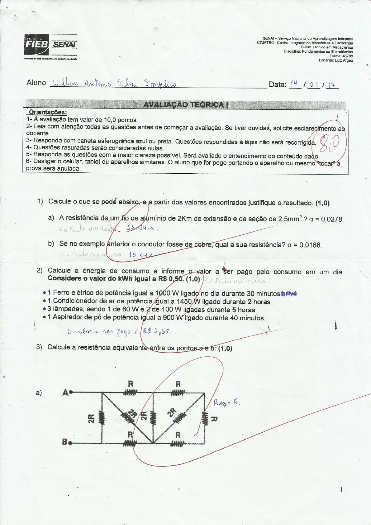 Prova Fundamentos de Eletrotécnica Prof ArgeuTÉCNICO EM MECATRÔNICA SENAI