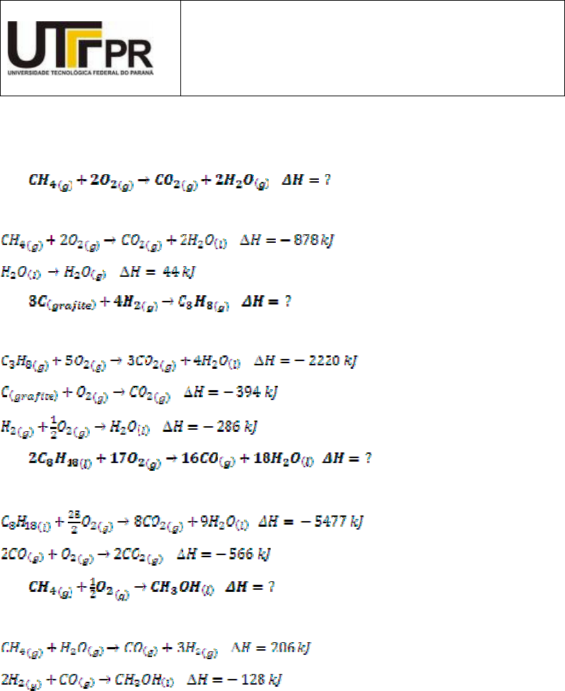 UTFPR – Campus Medianeira Engenharia de Produção Agroindustrial Disciplina: EP52D – Química Professor: Bruno Carciofi 1ª Lista de Exercícios – Termoquímica 1) Calcule as variações de entalpia das equações termoquímicas abaixo, se baseando na Lei de Hess. a) Dadas as equações termoquímicas abaixo: b) Dadas as equações termoquímicas abaixo: c) Dadas as equações termoquímicas abaixo: d) Dadas as equações termoquímicas abaixo: 2( ) 2( ) 2 ( )2 2 484g g gH O H O H kJ∆+ → = − 2) Um sistema termodinâmico recebe 500 kJ sob forma de calor, enquanto realiza trabalho de 200 kJ. Qual é a variação de sua energia interna? 3) Calcule a variação de energia interna do sistema quando um balão é aquecido por 800 J de calor, sendo que ele se expande trocando 350 J de trabalho na atmosfera? 4) Numa dada mudança de estado são recebidos 44 J de trabalho e a energia interna aumenta 170 J. Qual é a capacidade calorífica do sistema, se a temperatura deste aumentou 10 K? Resp.: 12,6 J/K 5) Se considerarmos que a pressão que se opõe à expansão dos exercícios 2 e 3 é mantida constante a 1 atm e considerando que todo trabalho realizado é de expansão, calcule: a) A variação de entalpia do sistema. UTFPR – Campus Medianeira Engenharia de Produção Agroindustrial Disciplina: EP52D – Química Professor: Bruno Carciofi b) A variação de volume. 6) Considere o seguinte conjunto de afirmações a) Para uma reação exotérmica em recipiente fechado e indeformável, ∆U < 0, sob pressão constante. b) Para uma reação endotérmica em recipiente fechado que ocorra com aumento de volume, ∆U é sempre positivo, sendo a press”ao constante. c) Se considerarmos um sistema e o meio exterior globalmente isolados, então ∆Uext + ∆Usis = 0. d) Num sistema fechado, não há trocas de energia, sob a forma de calor, com o exterior. e) Durante a expansão de um gás, o trabalho efetuado é positivo. f) A energia interna de um gás que sofre uma compressão, sem fornecimento de calor, aumenta. Classifique-as de Verdadeira (V) ou Falsa (F) e corrija as que foram consideradas falsas. 7) Classifique cada uma das transformações abaixo em exotérmica ou endotérmica. a) H2(g) + ½O2(g) → H2O(g) ∆H = -285 kJ. b) H2O(ℓ) → H2O(g). c) CH4(g) → CH4(ℓ). d) Combustão da gasolina. 8) Considere as seguintes equações termoquímicas: CH3OH(ℓ) + 3/2O2(g) → CO2(g) + 2H2O(ℓ) ∆H = -726 kJ H2O(ℓ) → H2(g) + ½O2(g) ∆H = 286 kJ C(grafite) + O2(g) → CO2(g) ∆H = -394 kJ Combinando essas equações, obtenha o valor da entalpia de formação do metanol a partir do C grafite, do gás oxigênio e do gás hidrogênio. 9) Combustíveis orgânicos liberam CO2 em sua combustão. O aumento da concentração de CO2 na atmosfera provoca um aumento do efeito estufa, que contribui para o aquecimento do planeta. A tabela a seguir informa o valor aproximado da energia liberada na queima de alguns combustíveis orgânicos, a 25 ºC. Qual o combustível que apresenta o maior quociente energia liberada/quantidade de CO2 produzido? Nome Fórmula Energia liberada (kJ/mol) Etanol C2H6O 1.400 Metano CH4 900 Metanol CH4OH 730 Octano C8H18 5.600 UTFPR – Campus Medianeira Engenharia de Produção Agroindustrial Disciplina: EP52D – Química Professor: Bruno Carciofi 10) É estimado que o corpo humano gera 5900 kJ de energia térmica por hora durante exercícios físicos intensos. Se o único meio pelo qual este excesso de energia seria dissipado fosse através da evaporação de água, quantos gramas de água teriam que evaporar por hora, para manter constante a temperatura do corpo? Resp.: aproximadamente 2,6 kg de H2O por hora. 11) Suponha que o carvão, de densidade 1,5 g/mL, é carbono puro. A combustão do carbono é descrita pela equação: C(grafite) + O2(g) → CO2(g) ∆H = -394 kJ a) Calcule o calor produzido quando um pedaço de carvão de tamanho 7,0 cm x 6,0 cm x 5,0 cm é queimado. b) Estime a massa de água que pode ser aquecida de 15 oC a 100 oC com o pedaço de carvão. c) Estime a massa de gelo que pode ser derretida com o pedaço de carvão. O calor solidificação do gelo é 334,8 J / g 12) Considerando a combustão do octano, constituinte da gasolina, calcule: a) Calcule a massa de octano que dever ser queimada para 12 MJ de calor; b) Quanto calor será envolvido na combustão de 3,8 L de gasolina (considerando constituída por apenas octano)? A densidade do octano é 0,70 g/mL. Resp.: a) 244,3 g de octano; b) 130,6 MJ