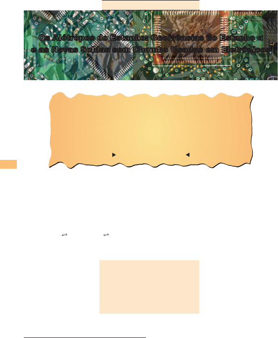 Os Alótropos do EstanhoQUÍMICA NOVA NA ESCOLA 124 Vol. 34, N° 3, p. 124-130, AGOSTO 2012 AtuAlidAdes em QuímicA Recebido em 11/05/2011, aceito em 23/07/2012 Antonio Rogério Fiorucci, Edemar Benedetti Filho e Noé de Oliveira Neste artigo, é discutida uma característica da química do estanho pouco ou superficialmente abordada nos livros textos de química – a transição de fase da sua forma alotrópica a para b. São discutidas as propriedades dos alótropos a e b do estanho, fornecendo subsídios para que esse elemento possa ser mais um exemplo didático do fenômeno de alotropia nas aulas de química. Também é mostrada a correlação da ocorrência dessa transição alotrópica em algumas soldas de estanho sem chumbo recentemente introduzidas em produtos ele- trônicos. Alguns avanços no desenvolvimento dessas novas ligas sem chumbo usadas como soldas na indústria de eletrônicos e os desafios para sua efetiva utilização são apontados. estanho, alotropia, soldas sem chumbo Os Alótropos do Estanho: Ocorrências do Estanho α e as Novas Soldas sem Chumbo Usadas em Eletrônicos A seção “Atualidades em Química” procura apresentar assuntos que mostrem como a Química é uma ciência viva, seja com relação a novas descobertas, seja no que diz respeito à sempre necessária revisão de conceitos. O estanho é produzido em São João Del- Rey e Tiradentes desde o século XVIII. A utilização deste na confecção de utensílios domésticos e litúrgicos foi muito difundida nessa região desde o período colonial, não só pelo acesso à matéria-prima, mas também pela ausência de objetos de vidro e porcelana na região. Formas alotrópicas sólidas do estanho As diferentes formas alotrópicas de um elemento apre- sentam propriedades físicas e químicas bastante distintas. No caso do estanho, existem três formas alotrópicas (Mellor, 1967; Plumbridge, 2007) conforme os seguintes equilíbrios de transição alotrópica de fases: 13,2 oC 161 oC Estanho cinzento (Sn-a) Estanho branco (Sn-b) Estanho rômbico (Sn-g) Cada alótropo apresenta uma estrutura cristalina1 específica. Entre 13,2 oC e 161 oC, o estanho é estável na configuração tetragonal de corpo centrado conhecida como estanho branco ou Sn-b. Acima de 161 oC, o Sn-b converte-se em Sn-g quebradiço com confi- guração cristalina rômbica que se funde a 231,8 oC. O estanho branco é a forma alotrópica conhecida pela maio- ria das pessoas e tem uma varie- dade de aplicações domésticas e tecnológicas como em ligas (bronze2, soldas3 e Pewter4) e em revestimento de aço (folhas-de-flandres5) e do cobre. No Brasil, a cidade de São João Del Rey produz estanho (Pewter) de qualidade reconhecida mundialmente. Nesta, encontra-se o maior número de oficinas e a corporação de artífices de estanho mais habilitada da América Latina (Sebrae MG, 2012). A produção de estanho nessa cidade é tomada como uma tradição, sendo este um importante produto regional (Silva et al., 2006), com produção de for- ma artesanal de peças como taças, bandejas, licoreiras e castiçais, que são vendidas para os turistas e exportadas (Sebrae MG, 2004). O estanho é produzido em São João Del-Rey e Tiradentes desde o século XVIII. A utilização deste na confecção de utensílios domésticos e litúrgicos foi muito difundida nessa região desde o período colonial, não só pelo acesso à matéria-prima, mas também pela ausência de objetos de vidro e porcelana na região. O Sn-b pode sofrer uma transi- ção alotrópica para uma estrutura cúbica do tipo diamante, conheci- do como estanho cinzento (Sn-a), que é semicondutor, não dúctil e sem aplicabilidade. A temperatu- ra de equilíbrio da transição b → a é 13,2 oC, mas para ela ocorrer, usualmente requer-se uma exposição prolongada a temperaturas bem mais baixas. Quando a temperatura é diminuída em relação à de transição, o Sn-b geralmente permanece em um estado metaestável. A existência de uma fase metaestável e o fato de a transição ser lenta Os Alótropos do EstanhoQUÍMICA NOVA NA ESCOLA 125 Vol. 34, N° 3, p. 124-130, AGOSTO 2012 possibilitam ao Sn-b ter suas aplicabilidades para muitos fins, sem que seja convertido a Sn-a. A transição ocasiona uma alteração em nível microscópico (retículo cristalino) representada na Figura 1. Na cela unitária do Sn-b, cada átomo de Sn está ligado a seis outros, com quatro átomos vizinhos a 301 pm, dispostos nos vértices de um tetraedro achatado, e outros dois, a 317,5 pm, colineares ao átomo de referência. No Sn-a, a distância interatômica Sn-Sn é de 280 pm. Na transição alotrópica b → a, ocorre uma considerável mudança de volume (~27% de aumento) da cela acompanhada de alterações das propriedades físicas do estanho (Tabela 1). Sendo inversamente proporcional ao volume, a densidade diminui com a transição. Embora as distâncias de ligação Sn-Sn diminuam (o que levaria a pensar em aumento de densidade), a alteração na densi- dade resulta da diminuição do número de coordenação de cada átomo de Sn de 6 no Sn-b para 4 no Sn-a e de um distanciamento maior dos 12 átomos vizinhos mais próxi- mos aos átomos ligados a um átomo de Sn de referência. Algumas informações sobre as distâncias entre os átomos e os ângulos de ligações nos retículos cristalinos do Sn-a e do Sn-b são descritas na Tabela 2. O estanho representa um dos casos relativamente raros em que sua forma em baixa temperatura é menos densa (Swaddle, 1997). Como consequência da mudança de densidade na transição, rupturas localizadas ocorrem em objetos de estanho branco puro ou de suas ligas e são observadas na superfície e cantos, regiões onde tensão é máxima, como pode ser visualizado na Figura 2. Como alótropos de um mesmo elemento, as formas a e b do estanho apresentam propriedades químicas distintas. Por exemplo, as reações realizadas a -17±2 oC do Sn-b e do Sn-a com solução de á