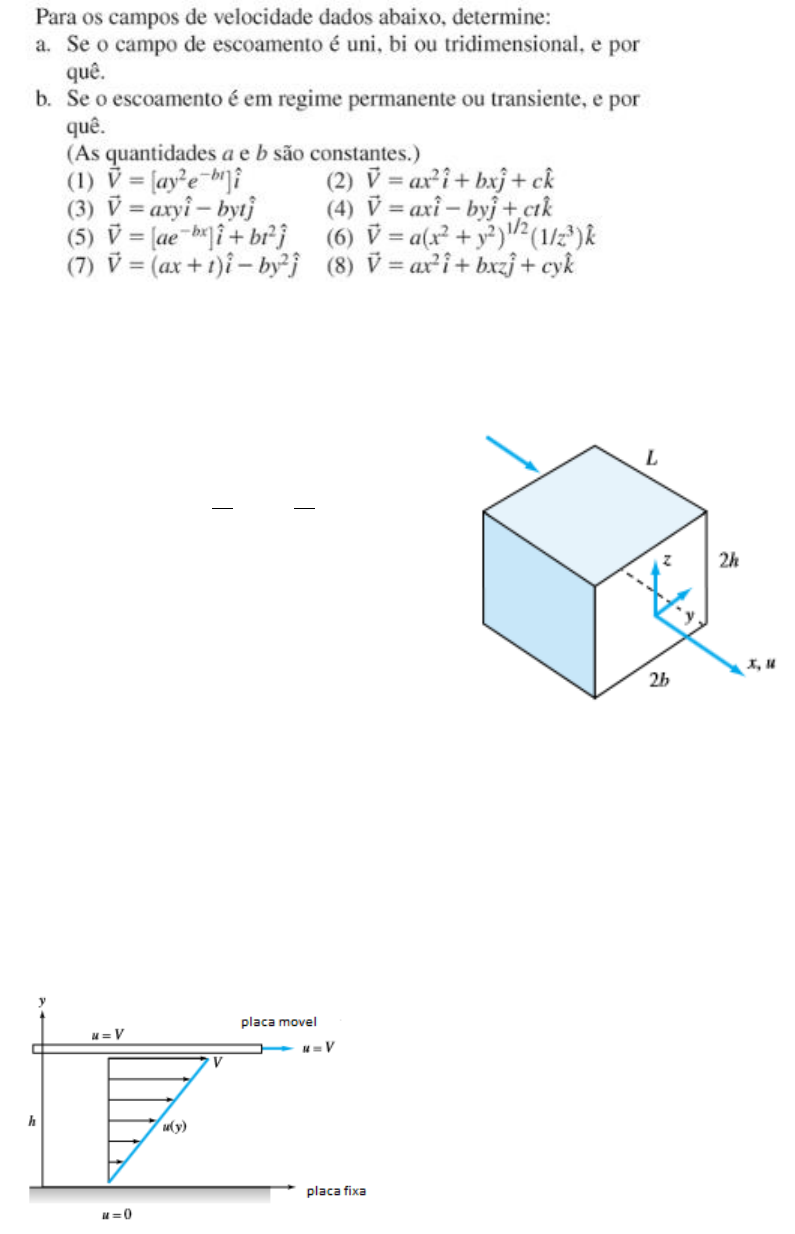 Lista 1 – Conceitos Fundamentais. Campo de Velocidade. Campo de Tensão. Viscosidade Exercicio 1 Exercício 2- Um fluido incompressível escoa em regime permanente através do duto retangular mostrado na figura. O perfil de velocidade na saída é dado aproximadamente por 𝑢 = 𝑢𝑚𝑎𝑥 (1 − 𝑦2 𝑏2 )(1 − 𝑧2 ℎ2 ) Esse perfil satisfaz as condições de contorno corretas para o escoamento de fluidos viscosos? Justifique Exercício 3- Considere o escoamento viscoso induzido pelo movimento relativo entre duas placas paralelas, conforme mostra a figura. Se o fluido é a glicerina a 20 oC e a largura entre placas é 6mm, qual a tensão de cisalhamento necessária em Pa para mover a placa superior a 5,5 m/s? Exercicio 4 A distribuição de velocidade do escoamento de um fluido newtoniano num canal formado por duas placas paralelas e largas é dada pela equação: 𝑢 = 3𝑉 2 [1 − ( 𝑦 ℎ ) 2 ] onde V é a velocidade média. O fluido apresenta viscosidade igual a 1,92 N.s/m2. Admitindo que V=0,6 m/s e h=5 mm, determine: a) a tensão de cisalhamento na parede inferior do canal e b) a tensão de cisalhamento que atua no plano central do canal. Exercício 5 Exercício 6 Exercício 7 Exercício 8 Exercício 9 Exercício 10 Exercicio 11- Uma placa fina é separada de duas placas fixas por líquidos muito viscosos µ1 e µ2, respectivamente, como mostra a figura. A área de contato é A entre a placa central e cada fluido. Considere uma distribuição linear de velocidade em cada fluido e deduza a força F necessária para puxar a placa a velocidade V. Exercicio 12 Quando um fluido viscoso escoa sobre uma placa plana que apresenta bordo de ataque afiado, observa-se o desenvolvimento de uma camada fina, adjacente a superfície da placa, onde a velocidade do fluido varia de zero ( a velocidade da placa) até o valor da velocidade do escoamento ao longe, U. Esta região é denominada camada limite e sua espessura, δ, é pequena em relação as outras dimensões do escoamento. A espessura da camada limite aumenta com a distancia x medida ao longo da placa. Admita que u=Uy/δ e que δ=3,5(νx/U)1/2, onde ν é a viscosidade cinemática do fluido. Determine a expressão para a força de arraste desenvolvida na placa considerando que o comprimento e a largura da placa são respectivamente iguais a l e b. Expresse os resultados em função de l, b, ν e ρ, onde ρ é a massa especifica do fluido. Exercicio 13 Exercício 14 Lista 3 – Equações integrais de movimento Exercício 1 Exercicio 2 Exercicio 3 Exercicio 4 Exercicio 5 Exercício 6 Exercício 7 Exercício 8 Exercício 9 Exercício 10 Exercício 11 Exercício 12 Exercício 13 Exercício 14 Exercício 15 Exercício 16 Exercício 17 Exercício 18 Exercício 19 Lista 4 – Equações integrais de movimento - Exercício 1 Exercicio 2 Exercicio 3 Exercicio 4 Exercicio 5 Exercício 6 Exercício 7 Exercício 8 Exercício 9 Exercício 10 Exercício 11 Exercício 12 Lista 4B – Equações integrais de movimento – Equação de Energia 1- Considere uma bomba d’agua que apresenta vazão, em regime permanente igual a 0,019 m3/s. A pressão na seção de alimentação da bomba é 1,24 bar e na descarga a pressão é igual a 4,14 bar. Os diâmetros dos tubos na alimentação e na descarga são respectivamente iguais a 89 mm e 25 mm. O aumento de energia interna específica da água associada com o aumento de temperatura do fluido é igual a 279 J/kg. a- Determine a potencia necessária para operar a bomba admitindo que esta opere de modo adiabático b- Determine as porcentagens de energia obtida pelo fluido correspondentes a energia cinética, potencial e pressão. R: 24,9kW 2- Ar é aspirado da atmosfera (T=15oC) para dentro de uma turbomaquina. Na saída, as condições são 500 kPa (manométrica) e 130 oC. A velocidade de saída é de 100 m/s e a vazão é de 0,8 kg/s. O escoamento é permanente e não há transferência de calor. Considere a velocidade de entrada muito menor em relação a da saída. Calcule a potencia da turbomaquina. 3- Considere uma turbina a vapor. A velocidade e entalpia especifica do vapor na seção de alimentação da turbina são iguais a 30 m/s e 3348 kJ/kg. O vapor deixa a turbina como uma mistura de líquido e vapor, com entalpia específica igual a 2550 kJ/kg e a velocidade do escoamento na seção de descarga da turbina é 60 m/s. Determine o trabalho no eixo da turbina por unidade de massa de fluido que escoa no equipamento, sabendo que o escoamento pode ser modelado como adiabático e que as variações de cota no escoamento são desprezíveis. R: -797kJ/kg 4- Considere uma queda d´agua com altura de 152m. Determine a variação de temperatura associada a este escoamento, sabendo que os dois reservatórios de água são grandes. R: 0,35oC 5- A vazão mássica de vapor superaquecido que entra numa turbina é de 1,5kg/s e o calor transferido da turbina é 8,5kW. São conhecidos os seguintes dados para o vapor na entrada e na saída da turbina: Entrada: P=2,0MPa, T=350oC, Velocidade=50m/s, Cota em relação ao plano de referencia=6m Saida: P=0,1MPa, Velocidade=200m/s, Titulo=100%, Cota em relação ao plano de referencia=3m Determine o trabalho no eixo da turbina. R: 655,7kW Lista 5A – Equações diferenciais do movimento de fluidos Exercício 1 Para um escoamento bidimensional no plano xy, a componente x da velocidade é dada por u=Ax. Determine uma possível componente y para escoamento incompressível. Quantas componentes y são possíveis? Exercicio 2 Um amortecedor a gás na suspensão de um automóvel comporta-se como um dispositivo pistão-cilindro. No instante em que o pistão esta L=0,15m afastado da extremidade fechada do cilindro, a massa específica do gás é uniforme em ρ=18kg/m3 e o pistão começa a se mover, afastando-se da extremidade fechada do cilindro com V=12m/s. A velocidade do gás é unidimensional e proporcional `a distancia em relação a extremidade fechada; vari