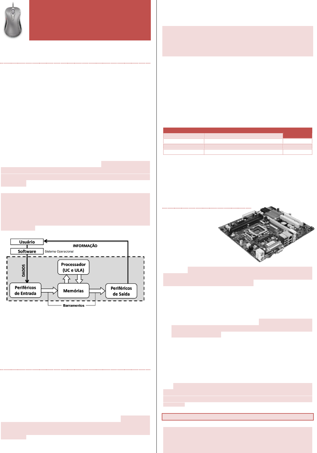 H ar d w ar e - P ág in a1 Hardware e Software 1. SISTEMAS DE INFORMAÇÃO De um modo geral, o termo Sistema de Informação se refere a uma estrutura organizada de pessoas, equipamentos e processos que coletam, manipulam, armazenam e distribuem os dados e informações e fornecem um mecanismo de feedback. Uma visão comum deste sistema está no uso dos computadores, máquinas capazes de aceitar uma ENTRADA DE DADOS estruturada, realizarem seu PROCESSAMENTO através de regras preestabelecidas e produzir uma SAÍDA DE INFORMAÇÃO com resultados aceitáveis. Um dado é apenas um fragmento da informação. Pode-se dizer que é um elemento em estado bruto, uma peça que isoladamente não teria muita serventia, mas que quando ligada a outros dados, em uma determinada sequência lógica, se transforma em um conjunto que permite a formação de um juízo. Este conjunto de dados é chamado informação e é através da análise de informações que se chega a uma determinada conclusão a respeito de algo. Informação é o dado adicionado de valor, que permite o entendimento subjetivo em determinado contexto [ANAC - Cargo 11: Técnico Administrativo – Área 2: TI - Caderno D - Cespe 07/2009]. Já o conhecimento é a vivência prática ou a experiência pessoal obtida com o uso da informação. A arquitetura de Von Neumann, utilizada até os dias atuais como referência para a construção de algumas máquinas, é composta de memória principal (MP), dispositivos de entrada e saída (E/S), unidade lógica aritmética (ULA) e unidade de controle (UC), a qual é responsável pela execução de instruções na memória [TJ-RR – Analista de Sistemas - Cespe 2011]. O funcionamento do computador depende da interação entre os elementos que o compõe: o Peopleware (usuários) manipula o Software, parte lógica (programas, instruções) que controla o Hardware, parte física, tangível (dispositivos, equipamentos), fazendo com que atividades úteis sejam realizadas. 3. LINGUAGEM BINÁRIA Existem duas maneiras de representar uma informação: analógica ou digitalmente. Um equipamento analógico manipula a eletricidade variando-a de forma contínua, irregular, permitindo que a mesma assuma qualquer valor entre o mínimo (zero) e o máximo. O equipamento digital, como os computadores pessoais atuais, permite que a eletricidade assuma apenas dois valores bem definidos: o mínimo, 0 (zero), e o máximo, 1 (um). Cada um desses valores recebe o nome de bit (binary digit, ou dígito binário). Então, bit significa a quantidade de informação contida na incerteza entre dois eventos igualmente prováveis [SEAPA - Analista Desenv. e Fiscalização Agropecuária –Administrador - Cespe 09/2009]. Qualquer tipo de informação, seja um texto, imagem ou programa, será processado e armazenado pelo computador na forma de uma grande sequência de uns e zeros. Um conjunto de 8 bits forma um byte (binary term, ou termo binário) que é usado para representar caracteres (A=01000001 no padrão ASCII) e medir capacidades de armazenamento de informação. A única linguagem que um processador tem capacidade de entender e tem condições de executar é a linguagem de máquina. Trata-se de linguagem binária e que serve para representar a codificação do conjunto de instruções de um computador [MP-PI - Cargo 11: Técnico Ministerial – Informática Cespe - 01/2012]. A representação através de um “B” maiúsculo significa byte, enquanto o bit é representado por um “b” minúsculo. Quando uma questão apresentar um valor em bytes e for necessário convertê-lo em bits, basta multiplicá-lo por 8 (oito); se, por outro lado, apresentar um valor em bits, consiga o equivalente em bytes dividindo-o por 8 (oito). 30 Bytes = 240 bits 32 bits = 4 Bytes Como um byte é uma unidade com valor muito pequeno (armazena apenas um caractere), é comum que sejam utilizados prefixos multiplicadores, conhecidos da nossa linguagem decimal, como o kilo, para apresentar grandes quantidades de informação: Múltiplo Quantidade de bytes Equivale a 1 Kilobyte (KB) 1.024 bytes (210) ou (1024)1 1 Megabyte (MB) 1.048.576 bytes (220) ou (1024)2 1.024 KB 1 Gigabyte (GB) 1.073.741.824 bytes (230) ou (1024)3 1.024 MB 1 Terabyte (TB) 1.099.511.627.776 bytes (240) ou (1024)4 1.024 GB O número 1.024 foi escolhido, pois é a potência de 2 mais próxima de 1.000 (103). Para efeitos práticos adota-se que 1 KB equivale a aproximadamente mil bytes, 1 MB a um milhão de bytes e 1 GB a um bilhão de bytes. 4. PLACA-MÃE É uma placa de circuito impresso, que serve como base para a instalação dos demais componentes de um computador, permitindo que todas as partes do computador recebam energia e comuniquem-se entre si. A placa-mãe é um dos componentes críticos dos computadores, pois definirá as limitações da máquina como um todo [DPE-SP - Agente de Defensoria Pública – Contador - FCC 2013] e incluem, ao menos: o sockets (ou slots) onde são instalados um ou mais microprocessadores. o Slots (encaixes) nos quais a memória principal é instalada, tipicamente, com módulos DIMM de DDR-SDRAM. o um chipset, que serve como interface entre processador, memória principal e periféricos, sendo o principal componente da placa-mãe de um microcomputador [Analista Judiciário - TRT- 21ª região - FCC 09-2003]. o chips de memória não-volátil (normalmente Flash ROM) contendo BIOS. o slots de expansão (encaixes para a conexão de placas offborad). o conectores para encaixe de dispositivos externos, como teclado e mouse. Uma placa de hardware, tal como placa de vídeo, placa de som ou placa de rede, por exemplo, que fica “dentro” da placa-mãe e não pode ser retirada é uma placa onboard [Técnico Judiciário – TRT 8ª região - FCC 12-2004]. 4.1. Chipset Um Chipset é um conjunto de chips que forma o principal componente da placa-mãe [Técnico Administrativo – MPU - ESAF 2004]. Controla o sistema e seus recursos - todos os component