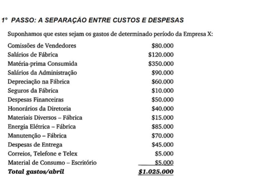 Na contabilidade de Custos devemos seguir os seguintes passos: A primeira tarefa é a separação dos Custos de Produção. Teremos então a seguinte distribuição dos gastos: 2º PASSO: A APROPRIAÇÃO DOS CUSTOS DIRETOS Digamos que essa empresa elabore três produtos diferentes, chamados A, B e C. O passo seguinte é o de se distribuírem os custos diretas de produção aos três itens. Suponhamos ainda que nessa empresa, além da Matéria-prima, sejam também custos diretos parte da Mão-de-obra e parte da Energia Elétrica. O problema agora é saber quanto da Matéria-prima total utilizada, de $350.000, quanto de Mão-de-obra Direta e quanto da Energia Elétrica direta foi aplicado em A, em B e em C. Para o consumo de Matéria-prima, a empresa mantém um sistema de requisições de tal forma a saber sempre para qual produto foi utilizado o material retirado do Almoxarifado. E, a partir desse dado, conhece-se a seguinte distribuição: Para a Mão-de-obra, a situação é um pouco mais complexa, já que é necessário verificar do total de $120.000 quanto diz respeito à Mão-de-obra Direta e quanto é a parte pertencente à Mão-de-obra Indireta. A empresa, para poder conhecer bem esse detalhe, mantém um apontamento (verificação) de quais foram os operários que trabalharam em cada produto no mês e por quanto tempo. Conhecidos tais detalhes e calculados os valores, conclui: Logo, os $90.000 serão atribuídos diretamente aos produtos, enquanto os $30.000 serão adicionados ao rol dos custos indiretos. A verificação da Energia Elétrica evidencia que, após anotado o consumo na fabricação dos produtos durante o mês, $45.000 são diretamente atribuíveis e $40.000 só alocáveis por critérios de rateio, já que existem medidores apenas em algumas máquinas. Do total de Custos de Produção, $485.000 são diretos e já estão alocados e $225.000 precisam ainda ser apropriados. . . 3° PASSO: A APROPRIAÇÃO DOS CUSTOS INDIRETOS Vamos agora analisar a forma ou as formas de alocar os custos indiretos que totalizam, neste exemplo, $225.000. Uma alternativa simplista seria a alocação aos produtos A, B e C proporcionalmente ao que cada um já recebeu de custos diretos. Es critério é relativamente usado quando os custos diretos são a grande porção dos custos totais, e não há outra maneira mais objetiva de visualização de quanto dos indiretos poderia, de forma menos arbitrária, ser alocado a A, B e C. Teríamos então: A última coluna do Quadro 5.2 nos fornece então o custo total de cada produto, e a penúltima a parte que lhes foi imputada dos custos indiretos. Suponhamos, entretanto, que a empresa resolva fazer outro tipo de alocação. Conhecendo o tempo de produção de cada um, pretende fazer a distribuição dos custos indiretos proporcionalmente a ele, e faz uso dos próprios valores em reais da Mão-de-obra Direta, por ter sido esta calculada com base nesse mesmo tempo. Teríamos, dessa maneira – quadro 5.3 Esses valores de custos indiretos diferentes e conseqüentes custos totais também diferentes para cada produto podem não só provocar análises distorcidas, como também diminuir o grau de credibilidade com relação às informações de Custos. Não há, entretanto, forma perfeita de se fazer essa distribuição; podemos, no máximo, procurar entre as diferentes alternativas a que traz consigo menor grau de arbitrariedade. Os Capítulos 6, 7 e 8 tratam de alternativas de atribuição de custos indiretos aos produtos de forma menos simplista e menos arbitrária. . . ESQUEMA BÁSICO . Por enquanto, o esquema básico é: a) separação entre Custos e Despesas; b) apropriação dos Custos Diretos diretamente aos produtos ou serviços; c) rateio dos Custos Indiretos. Os custos incorridos num período só irão integralmente para o Resultado desse mesmo período caso toda a produção elaborada seja vendida, não havendo, portanto, estoques finais. Já as despesas — de Administração, de Vendas, Financeiras etc. — sempre são debitadas ao Resultado do período em que são incorridas: assim é que funciona o Custeio por Absorção. . . CONTABILIZAÇÃO DOS CUSTOS . A forma de contabilização desse procedimento pode ser variada. Existem desde os critérios mais simples até os mais complexos. Em nosso exemplo visto até agora não há realmente muita complexidade, mas em outros à frente a situação pode tornar-se bem diferente. Admitindo que a empresa tenha resolvido, continuando o exemplo desenvolvido, contabilizar, com base no segundo critério de rateio de CIP (Custos Indiretos de Produção), à base do valor da Mão-de-obra Direta, poderíamos ter: Critério Simples: Contabilização dos Custos pela Contabilidade Financeira em contas apropriadas e transferência direta para os estoques à medida que os produtos são acabados ou então só no fim do período, sem registro das fases de rateio: As Contas de Despesas, por não nos interessarem, ficam de fora. Os Custos acima serão distribuídos diretamente às contas de estoques com base no Quadro 5.4 (2 critério): (Conforme mapa de apuração de custos — Quadro 5.4.) Ficam as contas assim: Talvez se pudesse argumentar que lançamentos tão simplificados não fornecem uma boa visão de como foi feita a distribuição dos custos. Entretanto, havendo um bom sistema de banco de dados, as melhores fontes dessas informações sobre distribuição serão sempre os próprios arquivos, e não o Diário e o Razão da Contabilidade. . Critério Complexo: A forma mais complexa para contabilização dos Custos seria representada pelo registro contábil no mesmo grau do detalhamento dos mapas e arquivos de custos. Poderíamos, para o mesmo exemplo, fazendo uso dos Quadros 5.1 e 5.4, contabilizar: . (Apropriação dos Custos Indiretos aos produtos) As contas ficariam: . Esta forma de contabilização segue de perto cada passo do próprio sistema de apuração e distribuição dos Custos e na prática deve ser ac