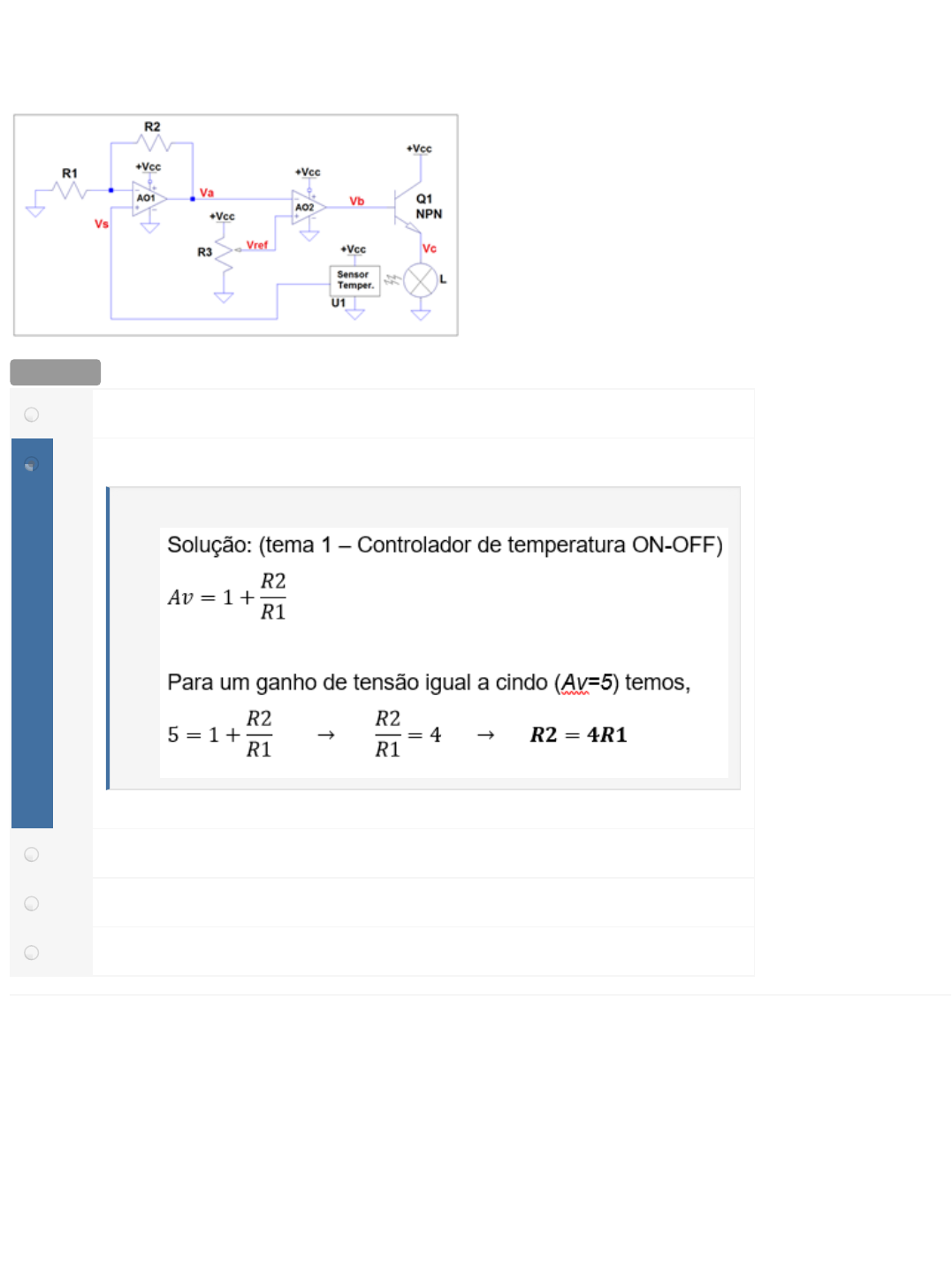 Questão 1/5 - Instrumentação Eletrônica Encontre a relação entre os resistores R1 e R2 do circuito seguinte para que a tensão proveniente do sensor de temperatura seja amplificada 5 vezes. Nota: 20.0 A R = 3R B R = 4R C R = 2R D R = R E R = 5R Questão 2/5 - Instrumentação Eletrônica 2 1 2 1 Você acertou! 2 1 2 1 2 1 Calcule a tensão de referência superior e inferior referente ao circuito seguinte. Considere: R2 = R3 = 5k ?, +Vsat = 13V e –Vsat = -13V. Nota: 20.0 A Vsup = 6, Vinf = -6V B Vsup = 6,5 Vinf = -6,5V C Vsup = -6,5 Vinf = 6,5V D Vsup = -6 Vinf = -6V E Vsup = 6,5 Vinf = 6,5V Questão 3/5 - Instrumentação Eletrônica Analisando o circuito seguinte podemos afirmar que a tensão de saída do comparador irá saturar em +Vcc quando a tensão de entrada Va for: Você acertou! Obs.: considerar Vcc = 12 V. Nota: 20.0 A Va < 6 V B Va < 7 V C Va > 8 V D Va < 7 V E Va < 8 V Questão 4/5 - Instrumentação Eletrônica Considere que um sinal senoidal com ±2 V de pico é aplicado no circuito retificador de precisão ilustr a seguir, e calcule a máxima tensão de saída (Vo) e a máxima tensão na carga (VL). Você acertou! Considere que a queda de tensão nos diodos é de 0,6V quando em condução. Nota: 20.0 A Vo = 2 V e VL = 2 V B Vo = 2,3 V e VL = 2 V C Vo = 2,6 V e VL = 1 V D Vo = -2 V e VL = 2,6 V E Vo = 2,6 V e VL = 2 V Questão 5/5 - Instrumentação Eletrônica Considere que um sinal senoidal com ±1 V de pico é aplicado no circuito retificador de precisão ilustr a seguir, e calcule a tensão de pico na saída (Vo) e a tensão de pico na carga (VL). Considere que a queda de tensão nos diodos é de 0,6 V quando em condução. Nota: 20.0 Você acertou! A Vo = -1,2 V e VL = 2 V B Vo = -1,6 V e VL = -1 V C Vo = 1,6 V e VL = 1 V D Vo = -1,6 V e VL = 1 V E Vo = -1,2 V e VL = -2 V Você acertou!