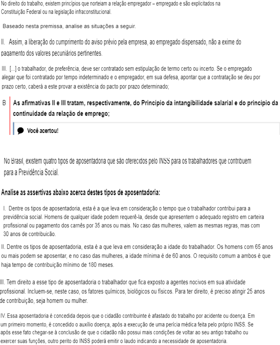 RELAÇÕES TRABALHISTAS O Sr. Ricardo é dono de empresa que atua no ramo industrial e possui vários empregados. Sabemos que os sujeitos da relação de emprego são chamados de empregador e empregado e que o empregador é aquele que admite, assalaria, demite e assume os riscos do negócio e tem garantido pela legislação certos poderes em relação ao empregado. Quando o Sr. Ricardo, pratica atos no sentido de determinar aos seus empregados de que maneira quer que os serviços sejam desenvolvidos, está em outras palavras exercendo um dos poderes do empregador estabelecidos pela legislação que é o poder de: A- Direção. Um estudante foi contratado por uma empresa para trabalhar numa jornada diária de trabalho de seis horas de segunda e sexta-feira, sem registro em CTPS, firmando com o mesmo um contrato de estágio educativo escolar supervisionado, desenvolvido no ambiente de trabalho, baseando-se na Lei nº. 11.788/08. Sobre o contrato de estágio é certo que: E- Trata-se de um contrato especial e peculiar que não gera vínculo empregatício. A redação do inciso XXXIII do artigo 7º da Constituição Federal, determina que o serviço como aprendiz pode ser exercido a partir dos 14 anos. A aprendizagem não se confunde com estágio, pois este não tem vínculo de emprego, sendo que o aprendiz é empregado. Analise as afirmativas abaixo, marque V (verdadeiro) ou F (falso) e, em seguida, assinale a alternativa que apresenta a sequência correta: ( V ) Ocorre a aprendizagem quando o jovem trabalhador é matriculado em cursos como de instituições devidamente qualificadas, como os do Senai ou Senac ou em outros similares e devidamente reconhecidos. ( V ) Como regra, o contrato de aprendizagem não poderá ser estipulado por mais de 2 (dois) anos ( F ) A jornada de trabalho do aprendiz não ultrapassará 6 horas diárias, não sendo possível qualquer exceção. Caracterizam-se como faltas justificadas aquelas previstas em lei, norma coletiva, regulamento de empresa ou no contrato de trabalho e por sua natureza não acarretam desconto na remuneração do empregado. Analise as sentenças abaixo e assinale a correta no que tange as faltas justificadas enumeradas pela CLT: I. São justificadas as faltas motivadas por falecimento do cônjuge, ascendente, descendente, irmão ou pessoa que, declarada em sua Carteira de Trabalho e Previdência Social (CTPS), viva sob sua dependência econômica. II. São justificadas as faltas decorrentes de casamento, hipótese em que o empregado poderá faltar por até três dias consecutivos; III. São justificadas as faltas por um dia, em cada 12 meses de trabalho, em caso de doação voluntária de sangue devidamente comprovada; IV. São justificadas as faltas, pelo tempo que se fizer necessário, quando tiver que comparecer a juízo. São corretas as afirmativas: E- Todas as afirmativas estão corretas. Leia o trecho abaixo. Imagine que João cumpra uma jornada de oito horas de trabalho. Desta forma, sabemos que ele deve gozar de uma a duas horas de intervalo. Contudo, o empregador de João o obriga ou convence a fazer apenas meia hora de intervalo, alegando que ele não pode deixar seu posto muito tempo. João, neste caso faz apenas um intervalo parcial, ou seja, deixa de usufruir a hora de descanso a que teria direito. Baseado neste trecho e nos conteúdos estudados sobre os intervalos intrajornadas, analise as sentenças a seguir, assinalando V para as afirmativas verdadeiras e F para as afirmativas falsas. I. ( F ) Como os intervalos intrajornada, como regra, não são remunerados, João tem o direito de gozar desta meia hora diária como banco de horas; II. ( F ) Os intervalos intrajornadas devem ser negociados entre empregado e empregador de acordo com a necessidade da organização; III. ( F ) Os intervalos intrajornada podem ser reduzidos mediante acordo coletivo entre empregador e sindicato; IV. ( V ) Em qualquer trabalho contínuo, cuja duração exceda de 6 horas, é obrigatória a concessão de um intervalo para repouso ou alimentação, o qual será, no mínimo, de 1 hora e, não poderá exceder de 2 horas. Leia as três situações apresentadas abaixo. Situação 1: Sérgio trabalha de segunda à quinta-feira durante nove horas e às sextas-feiras durante oito horas, totalizando quarenta e quatro horas semanais. Situação 2: Débora trabalha durante oito horas de segunda à sábado, totalizando quarenta e oito horas semanais de trabalho. Situação 3: Gabriela foi contratada para trabalhar durante seis horas por dia de segunda à sábado. Contudo, apesar do que diz o seu contrato de trabalho, Gabriela às quartas e quintas-feiras trabalha durante sete horas. Baseado nos conteúdos estudados, assinale V para as afirmativas verdadeiras e F para as afirmativas falsas no que se refere às horas extras que devem ser pagas em cada uma das situações I. ( V ) Na situação 1, apesar de não ter extrapolado o limite legal semanal de quarenta e quatro horas, Sérgio tem direito ao recebimento de quatro horas com adicional de horas extras, pois de segunda à quinta-feira trabalhou uma hora além das oito definidas pela Constituição; II. ( V ) Na situação 2, embora não tenha trabalhado mais de oito horas em nenhum dia da semana, Débora também deverá receber quatro horas com adicional de hora extra, pois superou o limite de quarenta e quatro semanais. III. ( V ) Na situação 3, a empregada não extrapolou o limite de oito horas diárias, nem o de quarenta e quatro semanais, porém terá direito a receber duas horas com adicional de horas extras, já que às quartas e quintas ela trabalha uma hora a mais do que determina o seu contrato de trabalho. IV. ( F ) Nas situações 1 e 3, os trabalhadores não têm direito ao pagamento de horas com adicional de horas extras, uma vez que não extrapolaram o máximo de 44 horas semanais estipulados pela legislação. Leia as assertivas a seguir: I. A concessão das férias deve ser participada ao