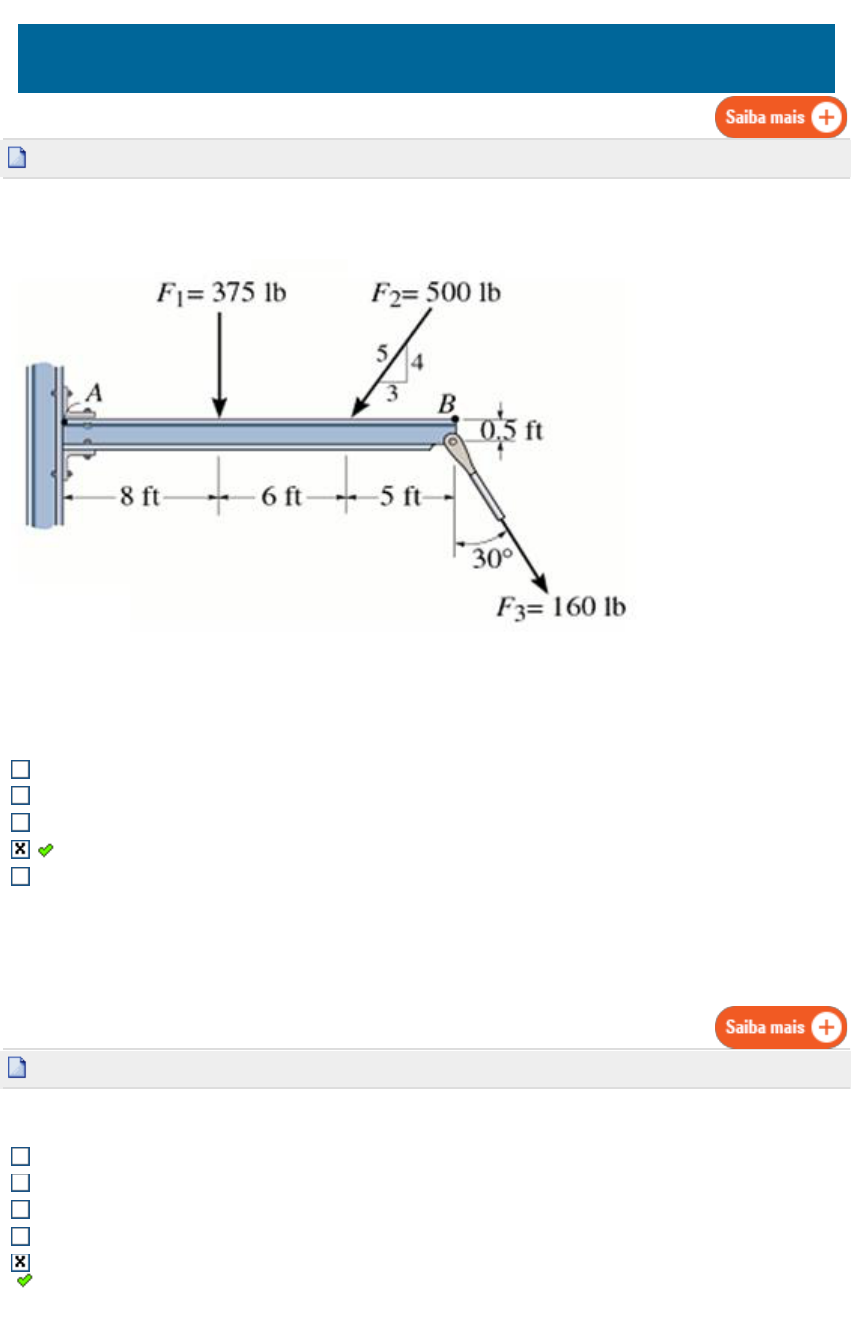 MOMENTO DE UM BINÁRIO Ref.: 201604093100 1a Questão Determine o momento em torno do ponto A para cada uma das três forças atuando na viga, considerando o sentido anti-horário como positivo. -10.000 lb.ft +11.000 lb.ft +11.400 lb.ft -11.200 lb.ft -11.000 lb.ft Ref.: 201603806068 2a Questão Ao observarmos um atleta correndo podemos definir: O atrito entre o tênis do atleta e o asfalto como sendo força interna O pelo do atleta com sendo força interna As forças aplicadas pelos tendões como sendo força externa A reação do apoio como sendo força interna. As forças aplicadas pelos músculos como sendo forças internas. Ref.: 201603669156 3a Questão Um binário atua nos dentes da engrenagem mostrada na figura. Qual será o valor do binário equivalente, composto por um par de forças que atuam nos pontos A e B. 120N 150N 90N 80N 100N Ref.: 201604176120 4a Questão A plataforma uniforme, que tem uma massa por unidade de comprimento de 28 kg/m, está simplesmente apoiada sobre barras de apoio em A e em B. Um trabalhador da construção civil com 90 kg sai do ponto B e anda para a direita, como mostrado na figura a seguir. Qual é a distância máxima s que ele poderá andar sobre a plataforma sem que ela gire em torno do ponto B? 1,85 m 2,15 m 2,65 m 2,49 m 2,78 m Ref.: 201604127317 5a Questão Determine a força interna na barra AB, Fab ? Fab= 125 N - TRAÇÃO Fab= 145 N - COMPRESSÃO Nenhuma das anteriores Fab= 145 N - TRAÇÃO Fab= 125 N - COMPRESSÃO Ref.: 201603806049 6a Questão Podemos afirmar que as forças externas: Podem somente causar um movimento de translação. Podem somente causar um movimento de rotação; Não podem causar movimento Num corpo rígido, pode na presença de oposição, causar um movimento de rotação ou translação. Num corpo rígido, pode na ausência de oposição, causar um movimento de rotação ou translação. Ref.: 201603863121 7a Questão Em um determinado objeto a sua força resultante é F = 100N na direção ( +i ) e o vetor momento gerado pela força resultante é M = ( 0, +50, 0)Nm. Determine o vetor posição responsável por gerar este momento. R=( 0, 0, +5) m R=( 0, 0, +10) m R=( 0, 0, +5/10) m R=( 0, 0, +50) m R=( 0, +50, 0) m Ref.: 201604108722 8a Questão Determine a tensão nos cabos AB e AD para o equilíbrio do motor de 200kg mostrado na figura. Dados θ=30º e α = 60º. Use g=10m/s^2 Tensão na corda AD = 1793,15 N Tensão na corda AB = 1464,10 N Tensão na corda AD = 1464,10 N Tensão na corda AB = 1035,28 N Tensão na corda AD = 1098,75 N Tensão na corda AB = 1344,84 N Tensão na corda AD = 732,05 N Tensão na corda AB = 896,56 N Tensão na corda AD = 1000,00 N Tensão na corda AB = 1732,05 N Explicação: Ref.: 201604233646 1a Questão Determine o momento de um binário formado por duas forças de 400 N em direções opostas com uma de distancia de 2 metros entre estas. 80kN 800Nm 80N 800MPa 800kN Ref.: 201604270323 2a Questão O lado do triângulo eqüilátero da figura mede 1 m. Calcule a intensidade da força F3 para que o momento do binário resultante que age no triângulo seja de 600 Nm no sentido horário. Dados: F1 = 400 N e F2 = 300 N. 500 N 600 N 400 N 300 N 700 N Explicação: Ref.: 201603806068 3a Questão Ao observarmos um atleta correndo podemos definir: A reação do apoio como sendo força interna. O atrito entre o tênis do atleta e o asfalto como sendo força interna As forças aplicadas pelos músculos como sendo forças internas. O pelo do atleta com sendo força interna As forças aplicadas pelos tendões como sendo força externa Ref.: 201603806049 4a Questão Podemos afirmar que as forças externas: Podem somente causar um movimento de translação. Num corpo rígido, pode na presença de oposição, causar um movimento de rotação ou translação. Num corpo rígido, pode na ausência de oposição, causar um movimento de rotação ou translação. Não podem causar movimento Podem somente causar um movimento de rotação; Ref.: 201603863121 5a Questão Em um determinado objeto a sua força resultante é F = 100N na direção ( +i ) e o vetor momento gerado pela força resultante é M = ( 0, +50, 0)Nm. Determine o vetor posição responsável por gerar este momento. R=( 0, 0, +10) m R=( 0, 0, +5) m R=( 0, 0, +5/10) m R=( 0, 0, +50) m R=( 0, +50, 0) m Ref.: 201604108722 6a Questão Determine a tensão nos cabos AB e AD para o equilíbrio do motor de 200kg mostrado na figura. Dados θ=30º e α = 60º. Use g=10m/s^2 Tensão na corda AD = 1098,75 N Tensão na corda AB = 1344,84 N Tensão na corda AD = 732,05 N Tensão na corda AB = 896,56 N Tensão na corda AD = 1000,00 N Tensão na corda AB = 1732,05 N Tensão na corda AD = 1793,15 N Tensão na corda AB = 1464,10 N Tensão na corda AD = 1464,10 N Tensão na corda AB = 1035,28 N Explicação: Ref.: 201604127324 7a Questão Determine a força interna na barra AB, Fab=? . Fab=152 N - COMPRESSÃO Fab=152 N - TRAÇÃO Fab=52 N - TRAÇÃO Fab=52 N - COMPRESSÃO Fab=125 N - COMPRESSÃO Ref.: 201604127317 8a Questão Determine a força interna na barra AB, Fab ? Fab= 145 N - COMPRESSÃO Fab= 145 N - TRAÇÃO Nenhuma das anteriores Fab= 125 N - TRAÇÃO Fab= 125 N – COMPRESSÃO EQUILÍBRIO DOS CORPOS RÍGIDOS ef.: 201603806046 1a Questão A respeito do princípio da transmissibilidade podemos afirmar que: Quando aplicada num corpo rígido não pode ser substituída por uma força F' com a mesma intensidade, a mesma direção e o mesmo sentido. Estabelece que as condições de equilíbrio de um corpo rígido não permanecem inalteradas Não estabelece que as condições de equilíbrio de um corpo rígido permanecem inalteradas Forças que respeitem o princípio da transmissibilidade, são consideradas forças equivalentes Forças que respeitem o princípio da transmissibilidade, não são consideradas forças equivalentes. Ref.: 201603278864 2a Questão Dado a figura abaixo, determine o momento dessa força em relação ao ponto C. 999x103 Nm 9,99x103 Nm 9