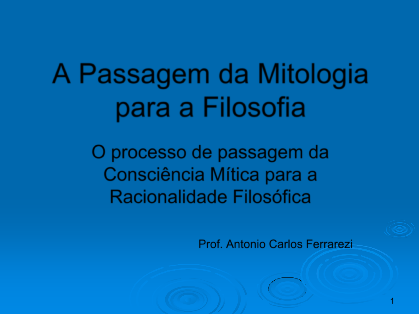 A Passagem da Mitologia para a Filosofia O processo de passagem da Consciência Mítica para a Racionalidade Filosófica Prof. Antonio Carlos Ferrarezi 1 Da Consciência Mítica para a Racionalidade Filosófica Não existiu milagre grego na implantação da filosofia como a nova forma de ver e interpretar o mundo. O que ocorreu foi que vários fatores – de ordem cultural, política, econômica – aconteceram e foram mudando o cenário no qual se desenvolvia a história dos povos da Grécia. 2 Da Consciência Mítica para a Racionalidade Filosófica Tais fatores implicaram em sérias mudanças de pensamento e de comportamento – de visão de mundo – e criaram condições e um ambiente propício para o surgimento de uma nova visão de mundo = a visão filosófica. Fatores: a escrita, a lei escrita, a invenção da moeda e o comércio, as navegações gregas, a política e a democracia grega. 3 A Escrita e a Lei Escrita A invenção da escrita trouxe grande avanço intelectual para a humanidade. Juntamente com ela surgiu também a possibilidade de dar forma escrita às leis que, anteriormente, eram atribuídas aos seres divinais e mitológicos. A escrita passou a exigir maior rigor intelectual do homem. 4 A Invenção da Moeda e o Comércio e as Navegações A moeda e o comércio contribuíram para o avanço da intelectualidade, a partir das operações da matemática e dos cálculos. As NAVEGAÇÕES GREGAS: através das navegações, os gregos puderam entrar em contato com outros povos, ampliar conhecimento e vencer a visão mítica sobre os mares. 5 A POLÍTICA GREGA A Democracia Ateniense O surgimento da Democracia na Grécia foi muito importante para o avanço do pensamento. A Democracia Grega: a primeira da história. A participação dos cidadãos – a discussão das idéias – a liberdade de expressar o pensamento. 6 A Formação das Cidades –Estado A Polis Grega Outro elemento muito importante na construção da racionalidade grega foi a formação da polis grega – ou Cidades- Estado, com sua estrutura política própria. Foi na polis grega que emergiu com força o conceito de cidadão e de cidadania, que significou avanço na intelectualidade grega. 7 Da Mitologia para a Filosofia Todos esses fatores contribuíram para a superação da consciência mítica como forma de ver o mundo e a construção de um novo sistema de pensamento e de uma nova visão de mundo, que foi chamada de FILOSOFIA. Gradativamente a filosofia foi transformando as narrativas míticas em explicações racionais. Nasce a Filosofia grega nos séculos VII e VI a.C. 8