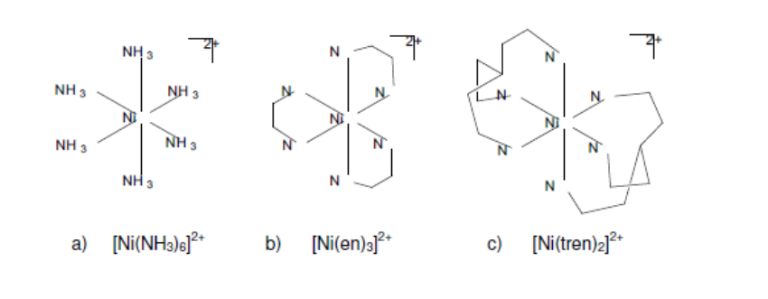 ENGENHARIA QUÍMICA QUÍMICA INORGÂNICA Lista de Exercícios - Compostos de Coordenação 1) Determine o número de oxidação do átomo de metal nos seguintes complexos: a) [Fe(CN)6]4-; b) [Co(NH3)6]3+; c) [Co(CN)5(H2O)]2-; d) [Co(SO4)(NH3)5)]+. 2) Dê o nome dos complexos acima. 3) Escreva as fórmulas para cada um dos seguintes compostos de coordenação: a) hexacianocromato(III) de potássio; b) cloreto de pentaaminassulfatocobalto(III) c) brometo de tetraaminadiaquacobalto(III) d) diaquabis(oxalato)ferrato(III) de sódio 4) Observe a Figura abaixo com três complexos de níquel. (en = etilenodiamina e tren = tris 2-aminoetilmetano). a) Escreva a constante de formação geral () para cada complexo. A constante de formação geral é a constante de equilíbrio para a reação (idealizada) em que todos os ligantes se coordenam ao metal em uma só etapa. b) Qual das três constantes , deve ser a maior e qual deve ser a menor ? Explique. 5) Determine o tipo de isomerismo estrutural que existe nos seguintes pares de compostos: a) [Co(NO2)(NH3)5]Br2 e [Co(ONO)(NH3)5]Br2 b) [Pt(SO4)(NH3)4](OH)2 e [Pt(OH)2 (NH3)4]SO4 c) [CoCl(SCN)(NH3)4]Cl e [CoCl(NCS)(NH3)4]Cl d) [CrCl(NH3)5]Br e [CrBr(NH3)5]Cl 6) Quais dos seguintes compostos de coordenação podem ter isômeros cis e trans? Se o isomerismo existe, desenhe as duas estruturas e dê o nome dos compostos. a) [CoCl2(NH3)4]Cl.H2O; b) [CoCl(NH3)5]Br; c) [PtCl2(NH3)2], um complexo quadrado planar. 7) Desenhe as estruturas dos isômeros ópticos do [CoCl2(en)2]+. 8) O íon complexo [PtCl4]2- é quadrado - planar e diamagnético, já o [NiCl4]2- é tetraédrico e paramagnético. Explique pela TLV a formação das ligações nesses dois complexos. 9) Baseado na TCC, faça um diagrama de níveis de energia de orbitais mostrando a configuração dos elétrons “d” para os seguintes complexos: a) [Cr(H2O)6]3+ b) [Fe(H2O)6]3+ c) [Ru(NH3)6]3+ d) [Ni(dipy)3]3+ e) [Co(NH3)6]3+ f) [Fe(CN)6]3- 10) Calcule a EECC para os complexos acima. 11) 4. Três ligantes A, B e C foram utilizados para preparar complexos octaédricos de um metal Mn+. As concentrações de metal e ligantes foram idênticas em todos os casos. Os espectros de absorção UV-Vis de soluções aquosas dos complexos foram obtidos em cubetas de 1 cm, e estão apresentados abaixo. Com base nesses espectros, responda: a) Qual dos três ligantes (A, B, C) induz o desdobramento de campo cristalino (o) de maior energia? Explique. b) Faça a distribuição eletrônica desse complexo supondo que o centro metálico seja o íon Fe2+ e calcule a energia de estabilização de campo cristalino em função de octaédrico. 12) Usando os valores de 10Dq abaixo, estimados a partir de medidas espectroscópicas, calcule as energias de estabilização do campo cristalino, em kJ mol-1, dos seguintes complexos (suponha que a energia de emparelhamento seja igual a 19000 cm-1 e que 1 kJ mol-1 = 83 cm-1): a. [Fe(NH3)6]3+ (10Dq = 20000 cm-1) b. [Co(H2O)6]2+ ((10Dq = 13000 cm-1) c. [MnCl6]4- (10Dq = 15000 cm-1) d. [CoCl4]2- (10Dq do complexo octaédrico [CoCl6]4- = 21000 cm-1) 13) Usando a Teoria do Campo Cristalino, explique por que CN- reage com [Fe(H2O)6]2+ formando [Fe(CN)6]4-, mas com [Ni(H2O)6]2+ forma-se [Ni(CN)4]2-. 14) Compare as propriedades magnéticas dos seguintes complexos: a. [Fe(H2O)6]2+ e [Fe(CN)6]4- b. [Ni(en)3]2+ e [Ni(H2O)6]2+ 15) Utilizando o diagrama visto em aula, faça o preenchimento eletrônico dos OAs e dos OM para o íon [Ti(H2O)6]3+. O complexo é colorido? Qual o comportamento magnético do complexo? 16) Ambos, H- e P(C6H5)3, são ligantes de força de campo similares, ambos localizados no alto da série espectroquímica. Recordando que as fosfinas atuam como receptores , o caráter é requerido para o comportamento de campo forte? Quais os fatores de orbital explicam a força de cada ligante? 17) A melhor descrição dos orbitais t2g no [Co(H2O)6]2+ é (a) ligante; (b) antiligante; ou (c) não-ligante. Explique como você chegou a essa conclusão? 18) A melhor descrição dos orbitais eg no [Fe(H2O)6]2+ é (a) ligante; (b) antiligante; ou (c) não-ligante. Explique como você chegou a essa conclusão?