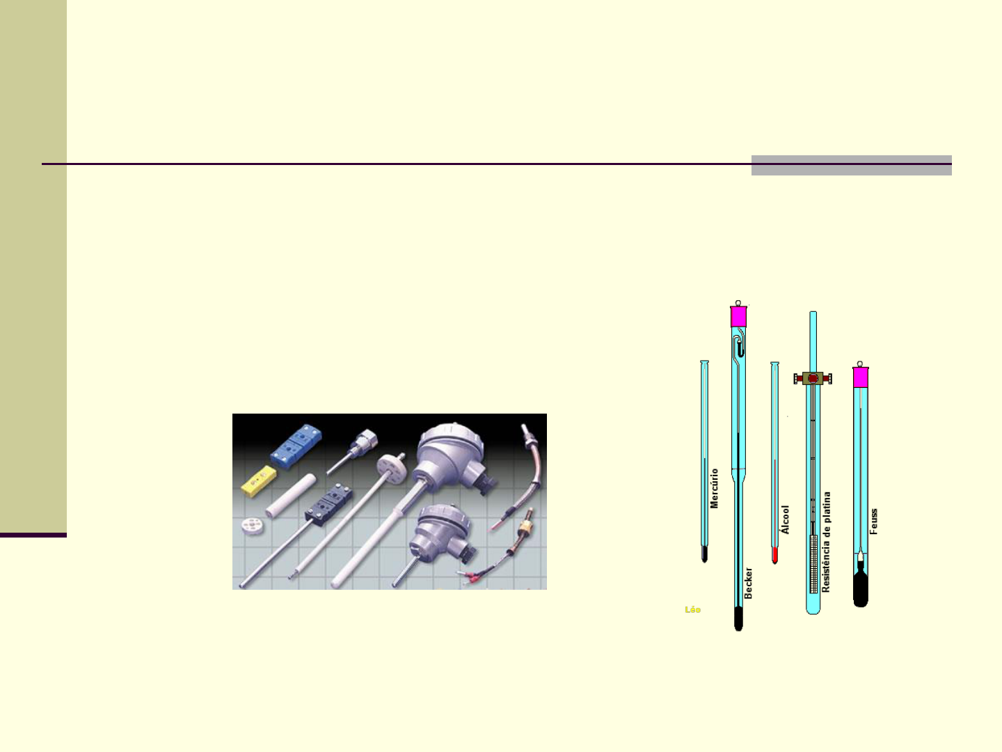 1 Instrumentação Industrial Medidas de Temperatura 2 Grandeza física relacionada com o grau de vibração dos átomos e/ou moléculas que constituem o corpo. CONCEITOS BÁSICOS Temperatura Energia térmica em trânsito de um corpo de maior temperatura para um corpo de menor temperatura. Calor 3 Escalas Termométricas - CELSIUS Celsius arbitrou a temperatura de: 0 ºC ao ponto de fusão do gelo sob pressão normal 100 ºC para a temperatura de ebulição da água em condições normais de pressão. Entre os limites citados, a escala foi dividida em cem partes iguais Cada uma das partes denominamos grau Celsius . 4 Escalas Termométricas - KELVIN Escala absoluta, na qual a variação de um grau absoluto (1 Kelvin ou 1 K) corresponde à variação de 1 ºC na temperatura. O zero Kelvin (0 K) corresponde a - 273,156 ºC, aproximadamente. 5 Escalas Termométricas - FAHRENHEIT Nesta escala relativa: A temperatura de vaporização da água é de 212 ºC (pressão normal) A temperatura de fusão do gelo (pressão normal) é definida como 32 ºF Entre esses dois pontos fixos, temos 180 partes iguais, cada uma delas correspondendo a 1 grau Fahrenheit 6 Quadro de Conversões de Temperatura KELVIN ( K ) CELSIUS ( C ) FAHRENHEIT ( F ) RANKINE ( R ) TK = 5/9( TF +459,6) TC = TK - 273,15 TF = 9/5( TC ) + 32 TR = 9/5 TK TK = TC +273,15 TC = 5/9( TF - 32) TF = 9/5( TK ) - 459,6 TR = TF +459,6 TK = 5/9( TR ) TC = 5/9( TR ) – 273,15 TF = TR - 459,6 TR = 9/5( TC + 273,15) 7 Foram realizadas por GALILEU, a partir de um termoscópio - princípio físico: expansão do ar; - na ocasião, sua “escala” estava dividida em “graus de calor”, segundo seus registros. AS PRIMEIRAS MEDIÇÕES DE TEMPERATURA 8 Termoscópio do tipo usado por Galileu 9 PRINCÍPIO DE CONSTRUÇÃO DE UM TERMÔMETRO 10 1o PASSO: Escolher uma propriedade termométrica do sistema sensor) compatível com o sistema a ser medido. 2o PASSO: Definir uma “Escala de Temperatura” PRINCÍPIO DE CONSTRUÇÃO DE UM TERMÔMETRO 11 TIPOS DE TERMÔMETROS 12 Termômetros à dilatação de líquidos OS MATERIAIS LÍQUIDOS SE DILATATAM COM AQUECIMENTO E SE CONTRAEM COM O RESFRIAMENTO, SEGUNDO UMA LEI DE EXPANSÃO VOLUMÉTRICA A QUAL RELACIONA SEU VOLUME COM A TEMPERATURA E O COEFICIENTE DE EXPANSÃO QUE É PRÓPRIO DE CADA MATERIAL ]1[ 33 2 210 TTTVVT Em que: • T=Temperatura do líquido em ºC. • V0= Volume do líquido a temperatura inicial de referência ºC. • VT= Volume do líquido na temperatura T. • β1, β2 e β3 = Coeficiente de expansão do líquido em ºC -1. • ΔT=T-T0. Para quando a temperatura aumenta: . .. V TVVV T L LLL H H Termômetros à dilatação de líquidos Para quando a temperatura diminui: . .. V TVVV T L HLL L H Termômetros à dilatação de líquidos 15 Termômetros à dilatação de líquidos em recipiente de vidro transparente 16 Termômetros à dilatação de líquidos em recipiente de vidro transparente LÍQUIDOS MAIS UTILIZADOS: LÍQUIDO PONTO DE SOLIDIFICAÇÃO [ºc] PONTO DE EBULIÇÃO [ºc] FAIXA DE USO [ºc] Mercúrio -39 +357 -38 a 350 Álcool Etílico -115 +78 -100 a 70 Tolueno -92 +110 -80 a 100 17 Termômetros à dilatação de líquidos em recipiente metálico Líquido Faixa de Utilização Mercúrio -35 a +350 Xileno -40 a +400 Tolueno -80 a +100 Álcool 50 a 150 18 Termômetros à dilatação de líquidos em recipiente metálico Elementos de Medição: A. Tipo C B. Tipo Helicoidal C. Tipo Espiral 19 Termômetros à pressão de gás Gases aplicáveis: Gás Temperatura Crítica Hélio (He) -267,8 ºC Hidrogênio (H2) -239,9 ºC Nitrogênio (N2) -147,1 ºC Dióxido de Carbono (CO2) -31,1 ºC Lei de Gay-Lussac: Cte T P T P T P n n ... 2 2 1 1 20 Termômetro a pressão de vapor Líquidos mais utilizados: Líquido Ponto de fusão[ºC] Ponto de ebulição [ºC] Cloreto de Metila -139 -24 Butano -135 -0,5 Éter Etílico -119 34 Tolueno -95 110 Dióxido de enxofre -73 -10 Propano -190 -42 21 TERMÔMETROS ELÉTRICOS DE CONTATO Pares Bimetálicos Termômetro de resistência Resistência de Platina Resistência de Platina Industrial Termorresistências Pt-100 Termopares PTC e NTC 22 Termômetro à dilatação de sólidos (Termômetro Bimetálico) Funcionamento baseado no princípio de flexão térmica Características construtivas Material do par bimetálico Faixa de Medição Coef. Dilatação linear Α[10-6 1/K] Invar (64%Fe + 36%Ni) -50 a 800 0,7 Latão 19 Lâminas componentes do par bimetálico: 23 Metais mais adequados para medição de temperatura Liga de Rh99,5%xFe0,5%: Utilizado para medição de temperatura na faixa de 0,5K a 25K (-272,75ºC a -248,15ºC) Cobre: Faixa de medição de 193,15K a 533,15K (-80ºC a 260ºC). Possui linearidade de 0,1ºC em um intervalo de 200ºC, entretanto sua resistência a oxidação é muito baixa e limita sua faixa de aplicação Níquel: Faixa de medição de 213,15K a 453,15K (-60ºC a 180ºC). Os principais atrativos na sua utilização são seu baixo custo e a alta sensibilidade. Sua principal desvantagem é a baixa linearidade. Platina: Faixa de medição de 25K a 1235K (-248ºC a 962ºC). É o metal mais utilizados na construção de termômetros de resistência, pela sua ampla faixa de utilização, boa linearidade e melhor resistência a oxidação. 24 - Baseado na dilatação de metais; - Diferentes metais possuem diferentes coeficientes de dilatação - Se esses metais estiverem dispostos em lâminas conjuntas, a dilatação diferenciada irá curvar esse conjunto de lâminas. 25 TERMÔMETRO BIMETÁLICO A B Dilatação de dois metais com diferentes coeficientes de dilatação (A e B); o resultado é uma flexão lateral do conjunto de lâminas, que tem um ponteiro acoplado. A leitura é feita diretamente numa escala acoplada. 26 O raio de curvatura é dado por: TERMÔMETRO BIMETÁLICO A B 123 .2 TT s BA A combinação desta equação com relações apropriadas da resistência dos materiais permite o cálculo de deflexões de vários tipos de elementos em 