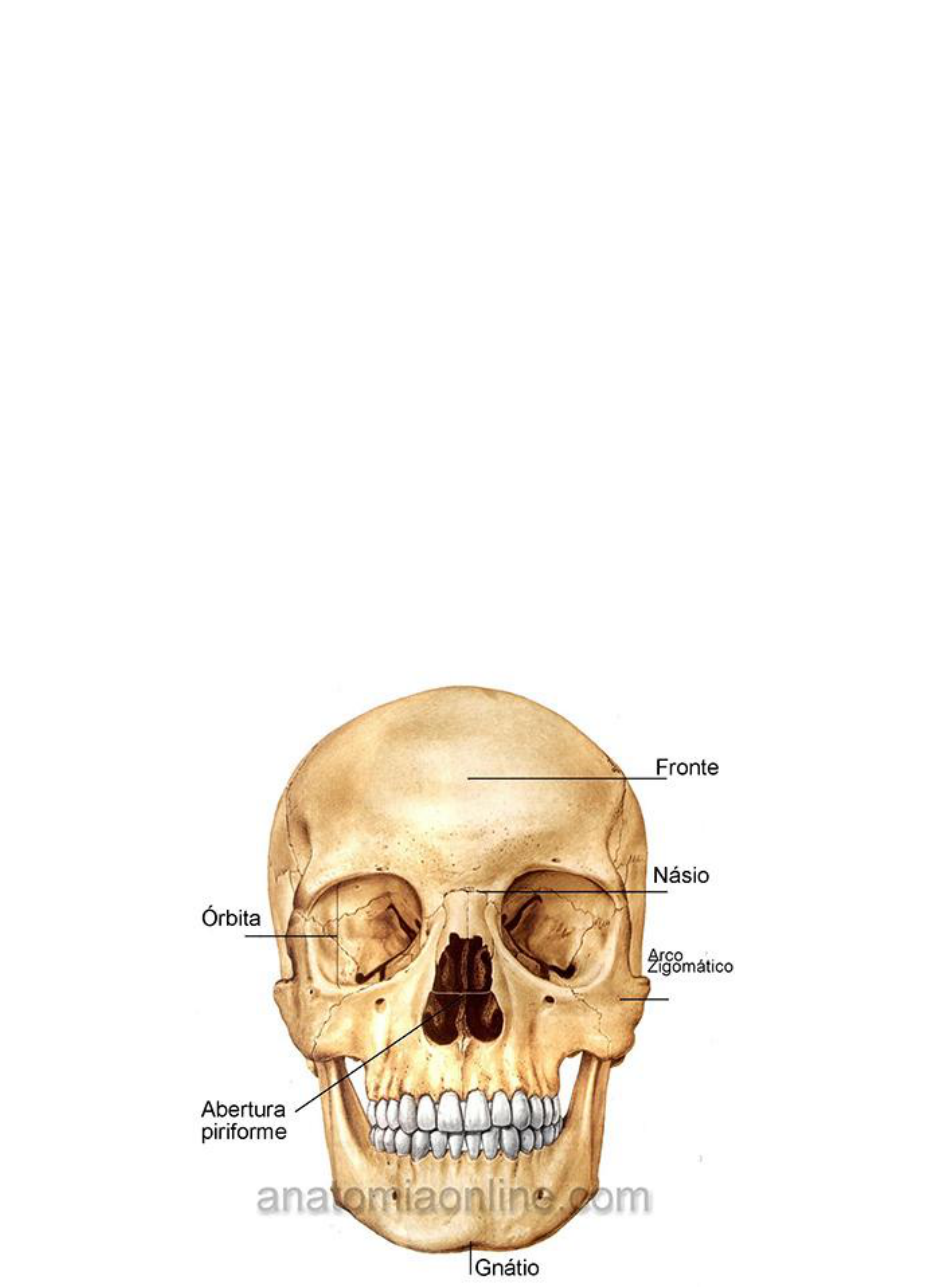 O Crânio Dividi-se, para estudo, em ossos da face e ossos do crânio propriamente dito. Ele pode ser dividido em calota craniana ou calvária e base do crânio. A calvária é a parte superior do crânio e é formada pelos ossos: Frontal, Occipital, e Parietais. A base do crânio forma o assoalho da cavidade craniana e pode ser dividida em três fossas ou andares: Os ossos que o compõe são: Frontal, Occipital, Esfenóide, Etmóide (ímpares)*, Parietal e Temporal (pares)*. A fossa anterior, também chamada de andar superior da base do crânio, é formada pelas lâminas orbitais do frontal, pela lâmina crivosa do etmóide e pelas asas menores e parte anterior do esfenóide. A fossa média, também chamada de andar médio da base do crânio, é formada anteriormente pelas asas menores do esfenóide, posteriormente pela porção petrosa do osso temporal e lateralmente pelas escamas do temporal, osso parietal e asa maior do esfenóide. A fossa posterior, também chamada de andar inferior, é constituída pelo dorso da sela e clivo do esfenóide, pelo occipital e parte petrosa e mastóidea do temporal. Essa é a maior fossa do crânio e também abriga o maior forame do crânio, o forame magno. Os ossos que compõe a face são: Mandíbula, Vômer, Hióde (ímpares), Maxilar, Palatino, Zigomática, Concha nasal inferior, Lacrimal e Nasal (pares). Vista anterior Vista lateral esquerda Vista posterior Vista superior Vista inferior ou interna Base do crânio, face interna – vista superior Base do crânio, sem a mandíbula – vista inferior. Crânio – corte sagital Calvária de recém-nascido – vista superior. Ossos do Crânio Frontal É um osso pneumático, ímpar, que constitui o limite anterior da calota craniana e o assoalho do andar superior da base do crânio. Posição anatômica: Anteriormente: borda supra-orbitária Inferiormente: espinha nasal Frontal – vista anterior. Frontal – vista inferior Parietal É um osso par. Os dois ossos parietais formam os lados e teto da calota craniana. É aplanado, quadrangular e apresenta uma superfície externa convexa e uma interna côncava. Posição anatômica: Anteriormente: borda frontal Inferiormente e lateralmente: borda escamosa Parietal direito- vista lateral Parietal direito, face interna – vista medial Occipital É um osso ímpar que constitui o limite posterior e dorsocaudal do crânio. Tem uma forma trapezóide e conformação de uma taça. Possui uma grande abertura, o forame magno, que se continua com o canal vertebral. Posição anatômica: Dorsalmente: protuberância occipital externa Inferiormente: forame magno Vista inferior Vista superior Esfenóide É um osso ímpar que se encontra no andar médio da base do crânio. Assemelha-se a um morcego de asas abertas. Posição anatômica: Anteriormente: face orbitária Lateralmente: asa maior Vista anterior Vista posterior Temporal É um osso par situado entre o occipital e o esfenóide, formando a base do crânio e sua parede lateral. Posição anatômica: Lateralmente, dorsalmente e inferiormente: processo mastóide Superiormente: porção escamosa Etmóide É um osso ímpar, pneumático, excessivamente leve e esponjoso que forma parte do assoalho do andar superior da base do crânio. Situa-se entre as duas órbitas, forma a maior parte da parede superior da cavidade nasal e constitui parte do septo nasal. Posição anatômica: Anteriormente: processos alares ; Superiormente: crista gali