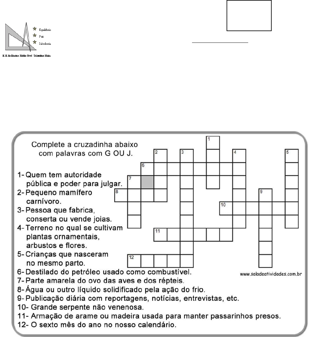 Trabalho individual Instrumento avaliativo: ( ) Prova Individual ( ) Prova dupla (x) Trabalho individual ( ) Trabalho dupla ( ) Trabalho grupo Nome do aluno: .................................................................................... Turma: ............... Ano: 2018 Professor: André Leivas Disciplina: Língua Inglesa Valor: 10% Complete a cruzadinha abaixo, com atenção: Nº de acertos: