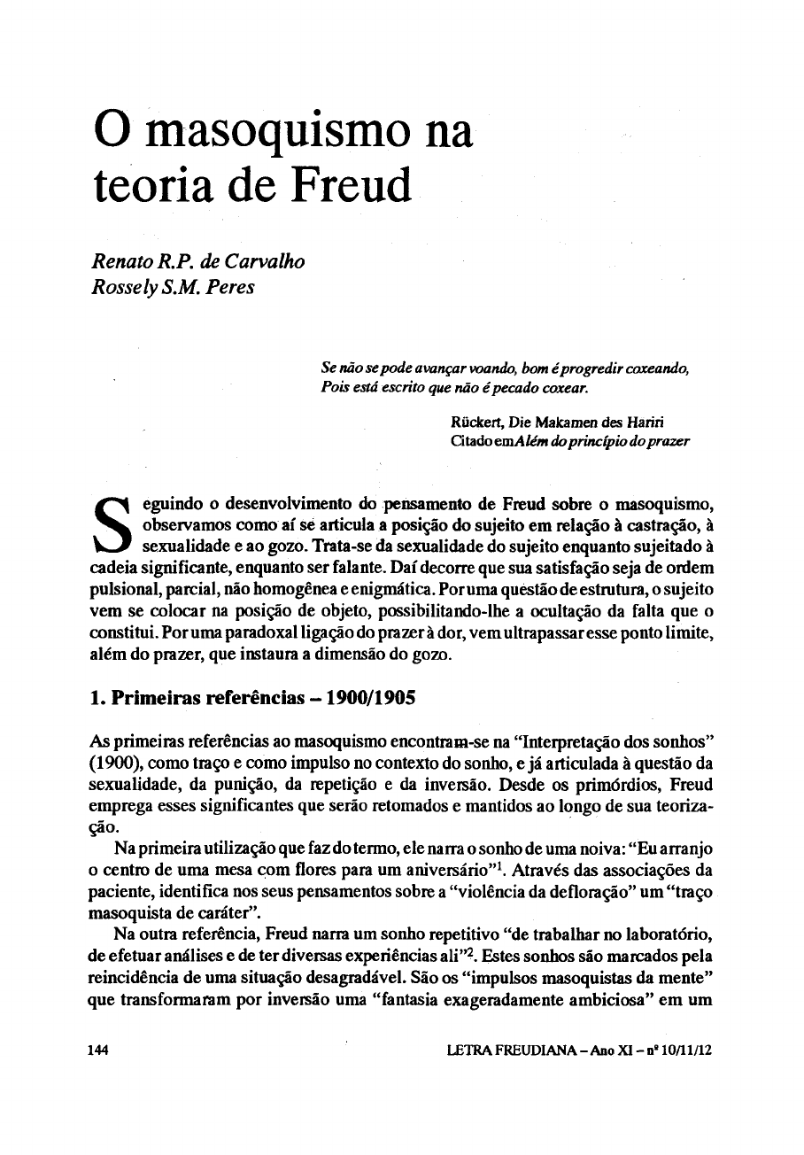 S eguindo o desenvolvimento do pensamento de Freud sobre o masoquismo,observamos como aí se articula a posição do sujeito em relação à castração, àsexualidade e ao gozo. Trata-se da sexualidade do sujeito enquanto sujeitado à
