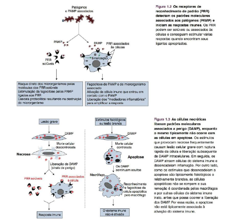 Anotações Imunologia - Fundamentos da Imunologia: Roitt, Ivan M. Matheus Rodrigues Corrêa, MEDUFPI 90 • Sistema Imune : duas atividades essenciais: reconhecimento das substâncias e dos microrga- nismos estranhos que conseguiram entrar no corpo, e remoção desses elementos estranhos utilizando um conjunto de células e moléculas que atuam simultaneamente de forma a eliminar o risco potencial. • Diferenciação do que é estranho daquilo que é próprio : padrões moleculares associados aos patógenos (PAMP, do inglês, pathogen-associated molecular patterns) e padrões moleculares associados a perigo (DAMP, do inglês, danger-associated molecular patterns) ou alarminas; o quando um pató geno consegue evitar sua detecção direta pelo sistema imune, sua presença é delatada quando ele provoca necrose dos tecidos que invadiu. o As células apoptóticas não ativam o sistema imune porque as células mortas por esse mecanismo exibem moléculas em suas mem- branas plasmáticas (p. ex., fosfatidilserina) que as marcam para remoção por fagocitose antes que possam romper e liberar seu conteúdo intracelular. Desse modo, os DAMP permanecem ocultos durante a apoptose e essas células não ativam o sistema imune (Figura 1.3). o O reconhecimento do material que não é próprio é conseguido por meio de um conjunto de receptores e proteínas de reconhecimento de padrões. • A regra fundamental é que um PAMP não é encontrado normalmente no organismo, mas é um componente comum a muitos patógenos isolados frequente- mente. Reconhecem carboidratos de membrana de microorganismos, proteínas (flagelina ), RNA de fita dupla típico dos vírus de RNA; • As citocinas constituem um grupo variado de proteínas que exercem efeitos pleiotrópicos, incluindo a capacidade de ativar outras células, induzir a diferenciação e potencializar a atividade microbicida (Figura 1.4). São liberadas comumente pelas células do sistema imune em resposta aos PAMP e aos DAMP e isso altera o estado de ativação e o comporta- mento de outras células, de maneira a atraí-las a participar do combate. As quimiocinas também são liberadas quando há contato com os PAMP/DAMP e, em geral, funcionam como fatores quimiotáxicos . . ➢ Fases iniciais da resposta imune inata: O macrófago é importante na iniciação das respostas imunes. abundantes na maioria dos tecidos (representam 10% a 15% das contagens totais de células em algumas partes do corpo) e atuam como sentinelas para agentes infecciosos utilizando um conjunto de receptores de reconhecimento de patógenos (PRR) fixados às suas mem- branas plasmáticas, bem como aos outros compartimentos celulares como os endossamos. o O contato do PRR do macrófago com o microrganismo ativa um conjunto de genes que o equipam de forma a desempenhar algumas funções diferentes. • Ações do macrófago após a ativação de seus PRR: • entra em um estado de alerta máximo (i. e., torna-se ativado) e então consegue engolfar e destruir com mais eficácia quaisquer microrganismos que encontre. • começa a secretar citocinas e quimiocinas que produzem efeitos nas células endoteliais adjacentes que revestem os capilares sanguí- neos; isso torna os capilares dessa área mais permeáveis do que seriam normalmente. Por sua vez, o aumento da permeabili- dade vascular permite que dois outros processos aconteçam. ▪ As proteínas plasmáticas, que normalmente ficam praticamente restritas ao sangue, agora podem invadir os tecidos infectados, e muitas dessas proteínas têm propriedades microbicidas. ▪ outro tipo de célula do sistema imune inato - o neu- trófilo - pode então ter acesso ao foco infeccioso. Assim como ocorre com os macro1agos, os neutro os tam em estão aptos à fagocitose, mas normalmente não têm permissão para entrar nos tecidos em razão do seu comportamento potencialmente destrutivo. Depois de entrarem nos tecidos infectados, os neutrófilos ativados iniciam o ataque e engolfam avidamente quaisquer microrganismos que encontrem. Conceito expansão clonal: O reconhecimento do antígeno pelo linfócito estimula a proliferação e a diferenciação dessas células e isso amplia expressivamente a quantidade de linfócitos capazes de reconhecer o antígeno específico que desencadeou inicialmente a resposta. Isso multiplica rapidamente a quantidade de linfócitos capazes de lidar com o agente infeccioso que possui o antígeno e resulta em uma resposta de memória quando o mesmo antígeno for encontrado novamente no futuro. O sistema imune adaptativo é altamente dependente das células do sistema imune inato para que possa saber quando, como e por quanto tempo responder. • Os PRR constituem um grupo variado de receptores e podem ser divididos em pelo menos cinco famílias diferentes (TIR, CTLR, NLR, RLR e receptores de varredura) com base nas suas características estruturais. 1. RECEPTORES TOLL-LIKE(TLR): Localizados na superfície celular(muitos) e alguns (como o TLR3 e o TLR7/8/9, que são sensíveis ao RNA viral intracelular e ao DNA bacteriano não metilado) estão localizados nos endossamos e são recrutados depois do contato com o material fagocitado (Figura 1.7). OBS(ABBAS): os TLRs endossomais podem distinguir ácidos nucleicos de células normais dos ácidos nucleicos microbianos com base na localização celular destas moléculas.O RNA e o DNA da célula do hospedeiro normalmente não estão presentes nos endossomas, mas RNA e DNA microbianos podem terminar em endossomas de neutrófilos, macrófagos ou células dendríticas quando os microrganismos são fagocitados por essas células. ˗ Atuam como sensores para infecções extracelulares (Figura 1.7); ˗ São ativados por componentes bacterianos como peptidoglicanos, lipoproteí- nas, lipoarabinomanano da micobactéria, zimosano do fungo, flagelina e outros ligantes derivados dos patógenos. Resulta na ativação do fator nuclear KB (NFKB) e vários membros da família dos fatores 