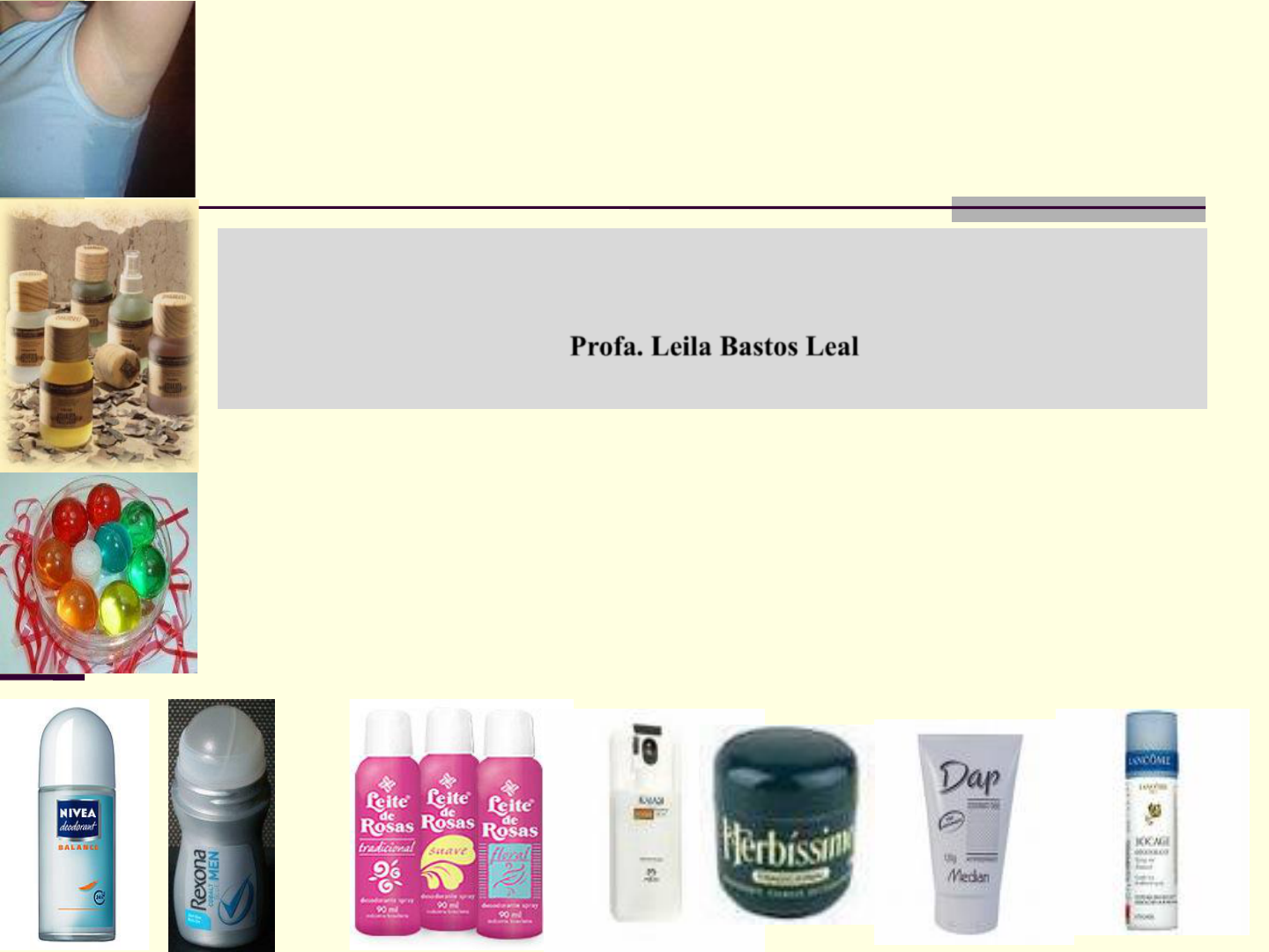 DESODORANTES E ANTIPERSPIRANTES Profa. Leila Bastos Leal PRODUTOS DE CUIDADOS PESSOAIS EUA- DESODORANTES, ANTITRANSPIRANTES, PREPRAÇÕES PARA BARBEAR BANHO/ UTILIZAÇÃO DE PERFUME 1888- EUA PRIMEIRO DESODORANTE 1919- ODOR CORPORAL OFENSIVO PANORAMA DO SETOR Higiene Pessoa l , Per fumari a e Cosmé ticos MERCADO BRASILEIRO Em relação ao mercado mundial de Higiene Pessoal, Perfumaria e Cosméticos, conforme dados do Euromonitor de 2006, o Brasil ocupa a terceira posição. É o segundo mercado em produtos infantis, desodorantes e perfumaria; terceiro em produtos para o banho, produtos masculinos, higiene oral e cabelo; o quarto em cosmético cores; o quinto em proteção solar; oitavo em pele; o nono em depilatórios (Fonte: Abihpec 2007). TRANSPIRAÇÃO (PRODUÇÃO DE SUOR) MECANISMO DE REGULAÇÃO DA TEMPERATURA CORPORAL SUOR DIMINUIR A TEMPERATURA UMIDIFICAR A PELE DEFESA NATURAL CONTROLE DA SUDORESE (INVOLUNTÁRIO) FATORES EMOCIONAIS FATORES FISIOLÓGICOS HÁBITOS ALIMENTARES FATORES DE PRODUÇÃO DE SUOR • FÍSICOS – Atividades, alimentação, ingestão de líquidos e uso de vestimentas. • AMBIENTAIS – temperatura, luz e umidade • PATOLÓGICOS E NERVOSOS – excitação, preocupação, ansiedade e angústia. • DOENÇAS MICROBIANAS, INGESTÃO DE DROGAS COLINÉRGICAS. FATORES QUALITATIVOS DO SUOR • CROMIDROSE – suor apresenta-se com coloração diferente • OSMIDROSE – suor fétido porém sanável através de tratamento higiênico. • BROMIDROSE - suor fétido provocado pelo Bacilo foetidum e Bacilo graveolens FORMAS QUANTITATIVAS DO SUOR • PERSPIRAÇÃO – Transpiração imperceptível com pouca eliminação de suor • SUDORAÇÃO NORMAL – Produzida em indivíduo que se encontra desempenhando atividades normais. • HIDROSE ANIDROSE – Ausência de suor HIPOHIDROSE – Hipofunção das glândulas sudorais HIPERHIDROSE – Hiperfunção das glândulas sudorais Qual o motivo do excesso de suor Excesso de glândulas, temperatura corporal, umidade, ventilação, vestuário. A produção de suor é regulada pelo sistema Nervoso Autônomo STRESS Superestimu- lação das glândulas GLÂNDULAS SUDORÍPARAS 3 MILHÕES EM TODO O CORPO -12LITROS SUOR/DIA DESENVOLVEM NA INFÂNCIA- RESPOSTA AO MEIO AMBIENTE TUBULARES ENROLADAS E DERIVADAS DE CAMADAS EXTERIORES DA PELE ÉCRINAS E APÓCRINAS GLÂNDULA SUDORÍPARAS ÉCRINAS PALMAS DAS MÃOS E PLANTA DOS PÉS (300UN./CM2) INERVAÇÃO SIMPÁTICA SECREÇÃO ÉCRINA INCOLOR, INODORA E HIPOTÔNICA DESEMBOCAM NA SUPERFÍCIE ATRAVÉS DA EPIDERME REGULAÇÃO TEMPERATURA CORPORAL (homens e macacos) SUOR E RESTOS EPITELIAIS -DEGRADADOS POR BACTÉRIAS COM PH ENTRE 3,8 E 5,6 Uréia, proteinas,lipídeos, aminoacidos NaCl, potássio, cálcio, fósforo, ferro 99%Água GLÂNDULA SUDORÍPARAS APÓCRINAS AXILAS/ EM VOLTA DA REGIÃO ANO GENITAL SECREÇÃO APÓCRINA PEQUENA QUANTIDADE DE SECREÇÃO LEITOSA DESEMBOCAM EM GERAL NOS FOLÍCULOS PILOSSEBÁCEOS INTERMITENTE (ESTÍMULO SEXUAL) CONTÉM PROTEÍNAS, AÇUCARES, AMÔNIA, ÁC. GRAXOS E PH ALCALINO ESTRESSE EMOCIONAL TRANSPIRAÇÃO A transpiração é uma espécie de válvula que regula a temperatura do corpo e é regido pelo trabalho das glândulas sudoríparas e por si só é inodoro. HIPERIDROSE Excesso de suor (hiperatividade das glândulas); Disfunção da pele; Acomete 1% da população; HIPERIDROSE PRIMÁRIA HIPERIDROSE SECUNDÁRIA (hipertireoidismo, distúrbios psiquiátricos, obesidade menopausa TRATAMENTOS • DESODORANTES • ANTITRANSPIRANTES • IONTOFORESE – ATROFIA DAS GLÂNDULAS • ANSIOLÍTICOS • PSICOTERAPIA • TOXINA BOTULÍNICA (35-40aplicações em cada local. Duração 4-6 meses) • CIRURGIA: REMOÇÃO DE GLÂNDULAS OU SIMPATECTOMIAS • IONTOFORESE – Consiste no uso de corrente galvânica na região, onde as glândulas recebem pequenos choques que atrofiam as glândulas produzindo menos suor. • TOXINA BOTULÍNICA – É aplicada de forma subcutânea nas glândulas sudoríparas das mãos bloqueando o estímulo neurológico evitando a formação do suor. Remoção de glândulas apócrinas Remoção de glândulas écrinas DESODORANTES • Redução do odor desagradável do suor, pela ação das fragrâncias, uso de anti-bacterianos • Minimizam a liberação do fluxo de suor nas axilas MECANISMO DE AÇÃO DOS DESODORANTES •Adsorção ou Absorção do Odor – Estearato e Carbonato de Magnésio, Talco, silicatos e ácido Silico; •Neutralização – Bicarbonato de Sódio (Anti-sépticos) •Inibição do desenvolvimento bacteriano •Inibição enzimática ANTIPERSPIRANTES FUNÇÃODESODORANTES (atuam diretamente sobre as causas do mau odor) Agentes AntibacterianosTriclosan (poder bacteriostático de efeito prolongado) Agentes AntibacterianosTriclorocarbamida (bacteriostático de efetividade baixa contra bactérias gram -) Agentes AntibacterianosHexaclorofeno AntissépticoSais de Clorexidine, óxido de zinco Antimicrobianos de Natureza Catiônica Compostos de Armônio Quartenário (bactericida com limitações devido ao caráter iônico) Bloqueadores Enzimáticos Citrato de Trietila (inibem as degradações fermantativas) Sais de prata- atividade contra bactérias patogênicas DESODORANTES • Leite floral Álcool; Quaternário de amônio; Digluconato de clorexidine; Óxido de zinco; Ácido bórico; Sorbitol; Fragância; Água. ANTIBACTERIANOS • Desodorantes -Concentração do agente na formulação (ação bacteriostática); -Espectro de ação; -Concentração do agente acumulada sobre a superfície do microorganismo; -Sinergia dos compostos (bactericidas, bacteriostáticos, tensoativos); -Concentrações aceitáveis para produtos cosméticos; -Podem ser utilizados em sabonetes, sais para banho, loções corporais e colônias); FORMAS COSMÉTICAS VEÍCULO- forma física, incorporação do ativo, secagem rápida, efeito prolongado, manchas nas roupas 1-SPRAYS (squeeze) baratos; alta concentração de álcool (irritantes); Álcool reduz a flora microbi