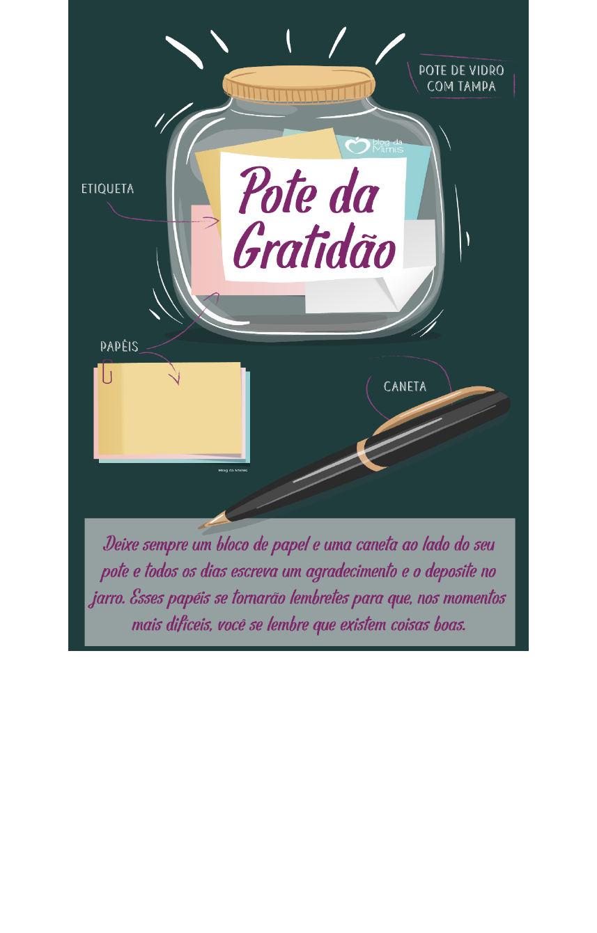 Nesse potinho, você escreverá qualquer coisa que acontecer de positiva no seu dia, por mais simples e pequeno que seja, por mais que você pense que seja insignificante. Tudo o que te fizer feliz, que você perceba que te trouxe algo bom, que fez a diferença, algo que tenha ajudado você. Também pode escrever coisas positivas a seu respeito, assim, sempre que estiver deprimida, poderá tirar um bilhetinho e se lembrar, por exemplo, das suas qualidades.