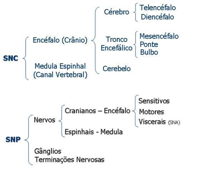 SISTEMA NERVOSO É o conjunto de órgãos responsáveis pela coordenação e integração dos demais sistemas orgânicos, relacionando o organismo com as variações do meio externo e controlando o funcionamento visceral. AXÔNIO – Função de trazer e levar informações ao sistema nervoso, localiza-se na substância branca. CÉLUAS DE SCHWANN – Aceleram o processo de Sinapse. SUBSTÂNCIA CINZENTA – Armazenar informações. SUBSTÂNCIA BRANCA – Leva e traz informações. VENTRÍCULOS ENCEFÁLICOS – Podem ser analisados para descobrir patologias. LÍQUOR – Nutri e protege e sistema nervoso. Produzido no Plexocoreóide. ARCO REFLEXO – Não precisa resposta à estímulos, por exemplo, andar. Eu não preciso pensar que vou andar. Se tiver lesão da medula, o arco reflexo é desativado. Choque, queimaduras – reflexo gravado. Estímulos habituais do cotidiano. NEURÔNIOS : NEURÔNIO SENSITIVO – Traz informações do Sistema Nervoso Central - VIA AFERENTE. NEURÔNIO MOTOR – Leva resposta do SNC ao órgão responsável pela resposta – VIA EFERENTE. NEURÔNIO DE ASSOCIAÇÃO – Analisa, armazena e cria padrões de resposta – VIA DE ASSOCIAÇÃO. Memória. Um neurônio pode ser só sensitivo, mas pode ser mais que um. NERVOS PERIFÉRICOS – Compostos por plexos – aglomerações de nervos. DIVISÃO DO SNC: SISTEMA NERVOSO SOMÁTICO – VOLUNTÁRIO SISTEMA NERVOSO AUTÔNOMO – INVOLUNTÁRIO SISTEMA NERVOSO CENTRAL– Cérebro; Medula Espinhal. SISTEMA NERVOSO PERIFÉRICO – Nervos que saem da Medula. Não possui massa cinzenta. DIVISÃO DO SNC: Bulbo – controle do sono, respiração. Diencéfalo – Região central do cérebro recoberta. Função – Comportamento emocional, controle visceral, ritmo circadiano, atividade motora involuntária. Plexos – Emaranhado de nervos. Corpo humano – 4. ENVOLTÓRIOS DO SNC: MENINGES. DURA-MÁTER – Camada mais externa. ARACNÓIDE – Camada medial. PIA-MÁTER – Camada mais interna, responsável pela forma do SNC. Envaginação – justa posta ao encéfalo. ESPAÇOS: EPIDURAL – Entre a dura-máter e o osso. (contém veias). SUB-DURAL – Entre a dura-máter e a aracnoide. (virtual). SUBARACNÓIDEO - Contém o líquido cefalorraquidiano. (líquor). Vasos sanguíneos. TÁLAMO – Recebe e envia todas as informações sensório-motoras. Periferia para o cérebro e do cérebro para a periferia. EPITÁLAMO – Associado com a regulação do ciclo do sono. Melatonina. SUBTÁLAMO- Auxilia na parte do controle motor, produção de dopamina – substância negra. HIPOTÁLAMO – Controla todas as funções do sistema autônomo “involuntário” = controle da temperatura, fome, sede, emoções, estado de consciência e ritmo circadiano. TENCÉFALO = Lobos. NERVOS PERIFÉRICOS – Compostos por plexos – aglomerações de nervos. - PLEXO CERVICAL (inerva o pescoço); - PLEXO BRAQUIAL (inerva membros superiores); - PLEXO SACRAL (Nervo ciático. Inerva região posterior e lateral da coxa e perna); - PLEXO LOMBAR (Nervo femoral. Inerva região anteromedial da coxa da perna). INTUMESCÊNCIA CERVICAL: NERVOPRAXIA: Esmagamento leve do nervo. Exemplo: braço dormente. Reversível, trinta dias pra voltar ao normal. AXONIDINESE: Esmagamento parcial e mais forte, lesão das células de Schwann. Parcialmente reversível, seis meses pra voltar. Utilizam complexo B12 pra auxiliar na recuperação. NEUROTORESE: Irreversível. Corte do axônio. MORFOLOGIA MEDULA ESPINHAL MEDULA – Massa cilindroide de tecido nervoso situada dentro do canal vertebral sem ocupa-lo completamente. LIMITE SUPERIOR = BULBO. LIMITE INFERIOR= VÉRTEBRA L2. CAUDA EQUINA: TRACTO CORTICOESPINHAL ANTERIOR TRACTO CORTICOESPINHAL LATERAL NÃO DECUSSÃO (10 a 25%) DECUSSÃO (90%) TERMINAM NA COLUNA TORÁXICA TERMINAM NA COLUNA SACRAL DISPOSTOS NO FUNÍCULO ANTERIOR DISPOSTOS NO FUNÍCULO LATERAL Conduzem impulsos nervosos à coluna vertebral. Funículo, Fascículo, Tracto – Fios que sobem e descem. Vias superiores e inferiores. NOME LOCALIZAÇÃO TERMINAÇÃO FUNÇÃO F.grácil e Cuneiforme Funículo Posterior Núcleo grácil e cuneiforme (bulbo) Tato e Epicrético T. Espinotalâmico anterior Funículo anterior Tálamo Temperatura e dor T. Espinotalâmico Funículo lateral Tálamo Temperatura e dor Medula Espinhal = Estímulos sensorial (aferente) e motor (ascendente). - Transmitir sinais. - Informações motoras. Decussação das pirâmides = Alternar a lateralidade dos estímulos nervosos. Chegou a decussação, a maior parte das fibras trocam. Homúnculo Sensitivo – áreas do córtex responsáveis por cada parte do corpo, as partes mais sensíveis tem maior volume de massa cinzenta. - Sistema nervoso autônomo = equilíbrio corporal = involuntário (homeostase). EFERENTE SOMÁTICO EFERENTE AUTÔNOMO Terminam em músculo estriado esquelético Terminam em músculo estriado cardíaco, liso ou glândulas. Voluntário Involuntário Um neurônio Dois neurônios (Pre-ganglionar e Pós-ganglionar) Termina em placa motora Simpático Simpático Parassimpático Neurônios na região torácica lombar Neurônios na região sacral Libera noradrenalina (excitador) Libera acetilcolina (depressor, acalma). Nervos cranianos – Saem do encéfalo. Temos 12 pares. Nervo olfatório; Nervo óptico; Nervo oculamotor; Vai para a visão; Nervo troclear; Nervo trigênio; sensibilidade do rosto; Abduscente; vai para a visão; Nervo facial; Vestíbulo coclear; Glosso falíngeo; Nervo vago; Nervo acessório; Nervo hipoglosso. - Corpo caloso; - Fórnice; - Sistema límbico – emocional; - Nervo mediano; - Plexo sacral – nervo ciático, tibial, fiular superficial e fibular profundo. - Plexo lombar – femural e safeno. - Plexo braquial – nervo radial, lunar e mediano.