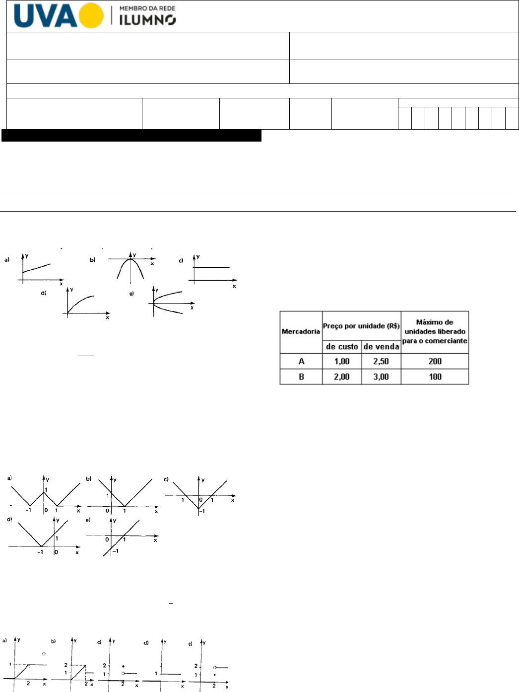 FOLHA DE QUESTÕES CURSO: DISCIPLINA: Ciclo Básico das Engenharias Cálculo Elementar ASS.: NOME: Professor: Thiago D. R. DATA: Nº de ordem GRAU: PROVA: TURMA MATRÍCULA: 19/09/2017 A1 1ENG31A TODAS AS QUESTÕES DEVEM APRESENTAR DESENVOLVIMENTO. Não é permitido durante a realização da prova: a) troca de material escolar entre os alunos, b) o uso de calculadora ou celular, c) consulta a qualquer tipo de documento, d) o uso de equipamentos eletrônicos. QUESTÕES MÚLTIPLA ESCOLHA (0,5) QUESTÃO 1 Qual dos gráficos não representa uma função? (0,5) QUESTÃO 2 A desigualdade 1 𝑥𝑥+1 ≥ 0 é satisfeita se: A) 𝑥𝑥 > 0 B) 𝑥𝑥 > −1 C) 𝑥𝑥 < 0 D) 𝑥𝑥 ≥ −1 E) Nenhuma das respostas acima e correta. (0,5) QUESTÃO 3 O esboço do gráfico de y = lxl - 1 é: (0,5) QUESTÃO 4 O gráfico da função f dada por 𝑓𝑓(𝑥𝑥) = �0𝑥𝑥 21 𝑠𝑠𝑠𝑠 𝑥𝑥 ≤ 0 𝑠𝑠𝑠𝑠 0 < 𝑥𝑥 ≤ 2 𝑠𝑠𝑠𝑠 𝑥𝑥 > 2 (1,0) QUESTÃO 5 Um comerciante gastou R$250,00, adquirindo as mercadorias A e B para revender. Observando a tabela a seguir, calculou e comprou o número de unidades de A e B para obter o lucro máximo. Com a venda de todas unidades compradas, o lucro máximo, em reais, foi: a) 225 b) 250 c) 275 d) 325 e) 350 (1,0) QUESTÃO 6 Uma fábrica de camisas tem um custo mensal dado por C=5000+15x, onde x é o número de camisas produzidas por mês. Cada camisa é vendida por R$25,00. Atualmente, o lucro mensal é de R$2000,00. Para dobrar esse lucro, a fábrica deverá produzir e vender mensalmente: a) o dobro do que produz e vende b) 100 unidades a mais do que produz e vende c) 200 unidades a mais do que produz e vende d) 300 unidades a mais do que produz e vende e) 50% a mais do que produz e vende 2 QUESTÕES DISCURSIVAS (1,5) QUESTÃO 5 O índice I de massa corporal de uma pessoa adulta é dado pela fórmula: I = M/h² onde M é a massa do corpo, dada em quilogramas, e h é a altura da pessoa, em metros. O índice I permite classificar uma pessoa adulta, de acordo com a seguinte tabela: (1,0) a) Calcule o índice I para uma mulher cuja massa é de 64,0kg e cuja altura 1,60m. Classifique-a segundo a tabela anterior. (0,5) b) Qual é a altura mínima para que o homem cuja massa é de 97,2kg não seja considerado obeso? (1,0) QUESTÃO 6 A função f(x) é definida por f(x) = ax + b. Sabe-se que 𝐟𝐟(𝟎𝟎) = 𝟑𝟑 e 𝐟𝐟(𝟐𝟐) = 𝟔𝟔. Determine: a) (0,1)- O valor do coeficiente linear: b) (0,1)- O valor do coeficiente angular: c) (0,1)- O valor de f(4): d) (0,1)- Domínio de f(x): e) (0,1)- Imagem de f(x): f) (0,5)- Construa o gráfico de f(x): (2,0) QUESTÃO 7 Resolva as inequações a) (1,0)- �𝟏𝟏−𝟗𝟗𝒙𝒙 𝟐𝟐�(𝒙𝒙𝟐𝟐+𝟏𝟏𝒙𝒙) ≥ 𝟎𝟎 b) (1,0)- 𝟐𝟐 − 𝐱𝐱 < 𝟑𝟑𝐱𝐱 + 𝟐𝟐 ≤ 𝟒𝟒𝐱𝐱 + 𝟏𝟏 (1,5) QUESTÃO 8 Se a função f(x) é definida por 𝐟𝐟(𝐱𝐱) = � 𝒙𝒙 + 𝟏𝟏 , 𝒔𝒔𝒔𝒔 𝒙𝒙 ≤ 𝟎𝟎 −𝟑𝟑𝒙𝒙𝟐𝟐 + 𝟐𝟐𝒙𝒙 + 𝟏𝟏 , 𝒔𝒔𝒔𝒔 𝟎𝟎 ≤ 𝒙𝒙 ≤ 𝟏𝟏 𝟐𝟐𝒙𝒙 + 𝟐𝟐 , 𝒔𝒔𝒔𝒔 𝟏𝟏 < 𝒙𝒙 ≤ 𝟐𝟐|𝒙𝒙 − 𝟐𝟐| , 𝒔𝒔𝒔𝒔 𝒙𝒙 > 𝟐𝟐 . a) (1,5)- Construa o gráfico da função. Boa Prova! 😊😊 FOLHA DE QUESTÕES CURSO: DISCIPLINA: BÁSICO DAS ENGENHARIAS Física 1 ASS.: NOME: Professor: Thiago D. R. DATA: 20/09/2017 Nº de ordem GRAU: PROVA: TURMA MATRÍCULA: A1 1ENG12A TODAS AS QUESTÕES DEVEM APRESENTAR DESENVOLVIMENTO. Não é permitido durante a realização da prova: a) troca de material escolar entre os alunos, b) o uso de calculadora ou celular, c) consulta a qualquer tipo de documento, d) o uso de equipamentos eletrônicos. QUESTÕES MÚLTIPLA ESCOLHA (0,5) QUESTÃO 1 Um carro parte de Aqui, viaja 50 km em linha reta até Ali, faz um retorno e volta para Aqui. O tempo total de viagem é 2 horas. O módulo da velocidade média da viagem de ida e volta é A) 0 km/h B) 50 km/h C) 100 km/h D) 200 km/h E) Não pode ser calculado sem conhecer a aceleração. (0,5) QUESTÃO 2 Um carro partiu de Aqui, viajou 50 km em linha reta até Ali, fez um retorno imediato e voltou para Aqui. A viagem de ida e volta levou 2 horas. A velocidade escalar média do carro durante a viagem foi de A) 0 km/h B) 25 km/h C) 50 km/h D) 100 km/h E) Não é possível responder sem conhecer a aceleração. (0,5) QUESTÃO 3 O gráfico mostra a posição de uma partícula em função do tempo. Qual é a velocidade média da partícula entre t = 0s e t = 2s? A) 3 m/s B) −3 m/s C) 6 m/s D) −6 m/s E) Não há dados suficientes para responder. (0,5) QUESTÃO 4 Se um objeto leva 5,3 s para se deslocar do ponto x = –2,1 m, y = 3,7 m, z = 1,4 m para o ponto x = 3,3 m, y = –1,1 m, z = 4,2 m, qual é a sua velocidade média? A) (0,23 m/s)i + (0,49 m/s)j+ (0,53 m/s)k B) (5,4 m/s)i − (4,8 m/s)j + (2,8 m/s)k C) (1,0 m/s)i − (0,91 m/s)j+ (0,53 m/s)k D) (1,0 m/s)i + (0,91 m/s)j + (1,1 m/s)k E) −(1,0 m/s)i + (0,91 m/s)j + (0,53 m/s)k (0,5) QUESTÃO 5 Um bombardeiro que está voando horizontalmente com velocidade constante deixa cair uma bomba antes de sobrevoar o alvo. Desprezando a resistência do ar e supondo que a bomba atinge o alvo, qual das afirmações abaixo NÃO é verdadeira? A) O bombardeiro está sobrevoando o alvo no momento em que a bomba atinge o alvo. B) A aceleração da bomba é constante. C) A velocidade horizontal do avião é igual à velocidade vertical da bomba no momento em que atinge o alvo. D) A trajetória da bomba não é retilínea. E) O tempo de queda da bomba não depende da velocidade horizontal do avião. (0,5) QUESTÃO 6 A força de “reação” não cancela a força de “ação” porque A) a força de ação é maior que a força de reação. B) as duas forças agem sobre corpos diferentes. C) as duas forças apontam no mesmo sentido. D) a força de reação aparece ap