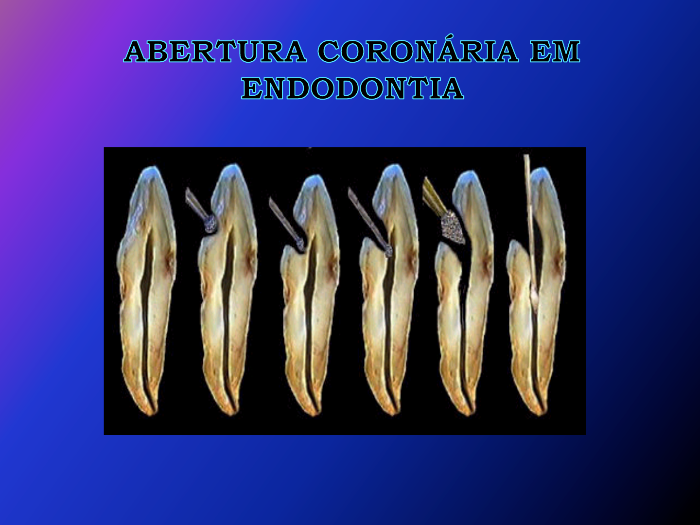 Profa. Paula Tereza Vardasca de Oliveira Endodontia A riqueza de informações sobre a complexidade dos canais radiculares levou os americanos a denominarem o canal radicular, de “sistema de canais radiculares”. Teorias Sobre as Origens dos Desvios de Raízes • Walkhoff, Kamp e Watsgott • Sponner e Robinson • Gotlieb • Schoeder ou Hemodinâmica Inclinação das Raízes No sentido V-L raízes inclinadas para L No sentido M-D raízes inclinadas para D Exceção: 1o MS; ICI; ILI; são paralelos à linha mediana. 2o MS, inclinado p/ M Exceção: a partir do 2o PMI, a raiz está p/ V e a coroa p/ L. Abertura coronária Ato operatório pelo qual se expõe a câmara pulpar. OBJETIVO INICIAL Remoção do teto da câmara pulpar Desgastes compensatórios Forma de conveniência DESGASTE COMPENSATÓRIO Ato operatório realizado na câmara pulpar, através do qual se remove as interferências dentinárias que impedem o acesso franco e direto à entrada dos canais radiculares. FORMA DE CONVENIÊNCIA Ato operatório que tem por finalidade efetuar o contorno final da abertura coronária, por meio da realização de desgastes mecânicos. OBJETIVOS Ampla visualização do assoalho da câmara pulpar, facilitando a localização das entradas; Facilitar acesso direto, e a exploração dos canais. PROCEDIMENTOS PRÉVIOS Mentalizar a cavidade pulpar; Organizar os instrumentais; Remover totalmente o tecido cariado, restaurações, pólipos pulpares; Isolamento adequado somente da unidade dental que vai ser submetida a tratamento; Relembrar e confirmar radiograficamente os fatores fisiológicos e patológicos; Reconstruções coronárias provisórias. PRÍNCIPIOS FUNDAMENTAIS QUE REGEM A ABERTURA CORONÁRIA Toda abertura coronária deverá ser efetuada de maneira que nos ofereça por meio de linha reta um acesso direto ao canal radicular. Endodontia: tratamento de canais radiculares: princípios técnicos e biológicos/ Mario Roberto Leonardo – São Paulo: Artes Médicas, 2005. Pág: 461 PRÍNCIPIOS FUNDAMENTAIS QUE REGEM A ABERTURA CORONÁRIA O limite da abertura coronária deverá incluir todos os cornos pulpares, saliências e retenções do teto da câmara pulpar. Endodontia: tratamento de canais radiculares: princípios técnicos e biológicos/ Mario Roberto Leonardo – São Paulo: Artes Médicas, 2005. Pág: 471 Endodontia: tratamento de canais radiculares: princípios técnicos e biológicos/ Mario Roberto Leonardo – São Paulo: Artes Médicas, 2005. Pág: 484 PRÍNCIPIOS FUNDAMENTAIS QUE REGEM A ABERTURA CORONÁRIA A parede cervical ou assoalho da câmara pulpar não deverá ser deformado. Endodontia: tratamento de canais radiculares: princípios técnicos e biológicos/ Mario Roberto Leonardo – São Paulo: Artes Médicas, 2005. Pág: 484 ETAPAS DA ABERTURA CORONÁRIA • ZONAS DE ELEIÇÃO • DIREÇÃO DE TREPANAÇÃO • FORMA DE CONTORNO • FORMA DE CONVENIÊNCIA ZONAS DE ELEIÇÃO Fase inicial da abertura; Desgaste da superfície de esmalte até a dentina; Acesso direto e retilíneo à câmara pulpar e posteriormente ao canal radicular. x x DIREÇÃO DE TREPANAÇÃO Fase que permite atingir o interior da câmara pulpar. Dentes anteriores Dentes posteriores FORMA DE CONTORNO Acesso à entrada e ao interior dos canais radiculares; Movimentos de dentro para fora com broca de ponta inativa; 1. Tamanho da câmara pulpar; 2. Forma da câmara pulpar; 3. Número de canais e suas curvaturas. Anatomia das Cavidades Pulpares X Abertura Coronária Anatomia das Cavidades Pulpares dos Diferentes Grupos de Dentes Incisivo Central Superior Raiz única 100% Canal único Canal reto Curva discreta no 1/3 apical para V ou D Incisivo Central Superior DETALHES DA ABERTURA CORONÁRIA ICS ZONA DE ELEIÇÃO face P, próximo ao cíngulo TIPO DE BROCA esférica diamantada 1012, 1013 DIREÇÃO TREPANAÇÃO perpendicular P/ longo eixo do dente FORMA DE CONTORNO triangular com base para I. 2082, 3080,3081 FORMA DE CONVENIÊNCIA remoção ombro lingual. Batt 12,14 X Z O N A E L E I Ç Ã O X V Confecção da Pré cavidade Direção de Trepanação Forma de Contorno Forma de Conveniência (desgaste compensatório) Anatomia das Cavidades Pulpares dos Diferentes Grupos de Dentes Incisivo Lateral Superior Raiz única Canal único fenda ( Dens in Dente) DETALHES DA ABERTURA CORONÁRIA ILS ZONA DE ELEIÇÃO face P, próximo ao cíngulo TIPO DE BROCA esférica diamantada 1011, 1012 DIREÇÃO TREPANAÇÃO perpendicular P/ longo eixo do dente FORMA DE CONTORNO triangular com base para I. 2082, 3080, 3081 FORMA DE CONVENIÊNCIA remoção ombro lingual. Batt 12,14 Incisivo Lateral Superior X Z O N A E L E I Ç Ã O Forma de Conveniência (Desgaste Compensatório) X Confecção da Pré cavidade Forma de Contorno Anatomia das Cavidades Pulpares dos Diferentes Grupos de Dentes Canino Superior Raiz Única , (+ longa) Canal Único, Ápice bastante afilado. DETALHES DA ABERTURA CORONÁRIA CS ZONA DE ELEIÇÃO face P, próximo ao cíngulo TIPO DE BROCA esférica diamantada 1012, 1013, 1014 DIREÇÃO TREPANAÇÃO perpendicular P/ longo eixo do dente FORMA DE CONTORNO ovalada, losangular. 3080, 3081 FORMA DE CONVENIÊNCIA remoção ombro lingual. Batt 12,14 Canino Superior Z O N A E L E I Ç Ã O X X Confecção da Pré cavidade Forma de Contorno Forma de Conveniência (desgaste compensatório) Forma de Conveniência (desgaste compensatório) Endodontia: tratamento de canais radiculares: princípios técnicos e biológicos/ Mario Roberto Leonardo – São Paulo: Artes Médicas, 2005. Pág: 472 Anatomia das Cavidades Pulpares dos Diferentes Grupos de Dentes Incisivo Central Inferior Raiz única 100% Canal único canal reto curva discreta no 1/3 apical p/ V ou D DETALHES DA ABERTURA CORONÁRIA ICI ZONA DE ELEIÇÃO face L, próximo ao cíngulo TIPO DE BROCA esférica diamantada 1011 DIREÇÃO TREPANAÇÃO perpendicular P/ longo eixo do dente FORMA DE CONVENIÊNCIA remoção ombro lingual. Batt 12,14 FORMA DE CONTORNO triangular com