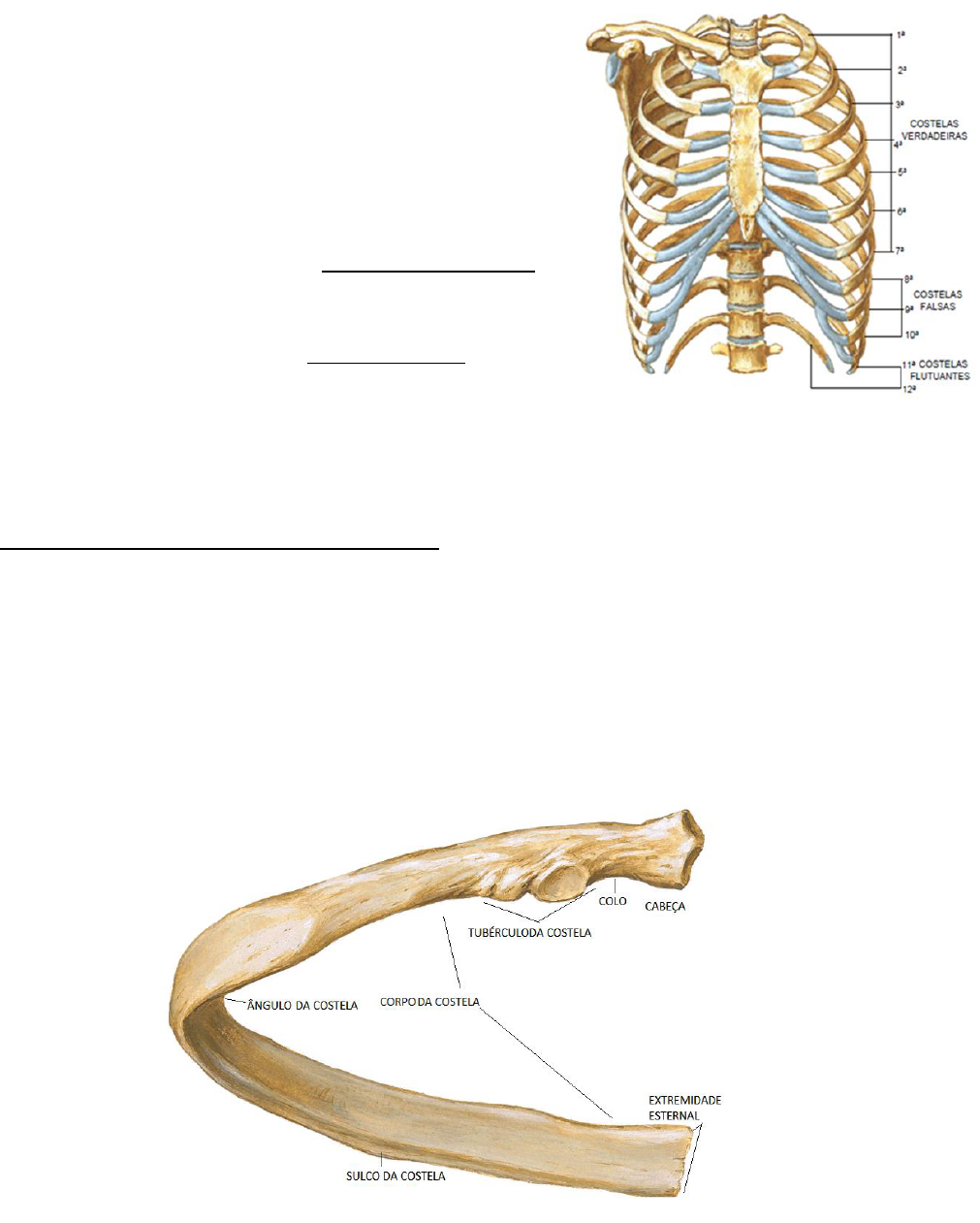 ESTRUTURAS DO TÓRAX E ABDOME O tórax é a região superior do tronco entre o pescoço e o abdome. É formado pelos 12 pares de costelas, esterno e cartilagens costais, além das 12 vértebras torácicas. Essas estruturas ósseas e cartilagíneas formam a caixa torácica que circunda a cavidade torácica e suporta o cíngulo do membro superior. A caixa torácica forma um arcabouço que abriga e protege os conteúdos da cavidade torácica – coração, pulmões. SUPERFICIES ÓSSEAS O esqueleto torácico forma a caixa torácica osteocartilagínea que protege as vísceras torácicas e alguns órgãos abdominais. O esqueleto torácico inclui: 12 pares de costelas e cartilagens costais. 12 vértebras torácicas e discos intervertebrais. 1 esterno. 1. Costelas As costelas são ossos planos encurvados que formam a maior parte da caixa torácica. Existem 3 tipos de costelas: Costelas verdadeiras (vertebrocostais) – as primeiras 7 costelas: se fixam diretamente ao esterno através de suas cartilagens costais próprias. Costelas falsas (vertebrocondrais) – da 8ª a 10º costelas: suas cartilagens são unidas àquela da costela imediatamente superior a elas (conexão indireta). Costelas flutuantes (vertebrais livres) – 11º e 12º costelas: não se conectam com o esterno, terminam na musculatura abdominal posterior. Acidentes ósseos das costelas típicas (3ª a 9ª) o Cabeça – cuneiforme e possui duas facetas separadas pela crista da cabeça; uma para a articulação com a vértebra numericamente correspondente e uma para a vértebra superior a ela. o Colo – liga a cabeça ao corpo no nível do tubérculo. o Corpo – apresenta uma curva chamada de ângulo da costela. o Tubérculo – ocorre na junção do corpo e do colo. Possui uma face articular lisa para a articulação com o processo transverso da vertebra correspondente e uma parte não articular rugosa para o ligamento costotransversário. Acidentes ósseos das costelas atípicas (1ª, 2ª e da 10ª a 12ª) o A 1ª costela é a mais curta e mais larga. Apresenta uma faceta única na sua cabeça para articulação com a vértebra T1 e dois sulcos que cruzam sua face superior em direção aos vasos subclávios, e que são separados por um tubérculo do músculo escaleno anterior. Obs: No sulco da costela há um feixe vasculonervoso formado pela artéria e nervo intercostal. o A 2ª costela é mais fina, menos encurvada e mais longa. Apresenta 2 facetas para articulação com as vértebras T1 e T2 e uma tuberosidade para inserção do músculo serrátil anterior. o Da 10ª a 12ª costela há apenas uma faceta em suas cabeças. o A 11ª e 12ª costelas são curtas e não possuem colos ou tubérculos. 2. Esterno O esterno é o osso plano alongado que forma o meio da parte anterior da caixa torácica. Acidentes ósseos: o Manúbrio: é um osso quase triangular que se situa no nível dos corpos das vértebras T3 e T4. O centro côncavo facilmente palpável é a incisura jugular, e o mais profundo é a incisura clavicular. o Ângulo: a junção do manúbrio e corpo formam essa proeminência. o Corpo: mais longo, mais estreito e mais fino que o manúbrio, localizado ao nível das vértebras T5 à T9. Apresenta incisuras costais e cristas transversas. o Processo xifoide: a menor e mais variável parte do esterno, situado ao nível de T10. ARTICULAÇÕES DO TÓRAX Embora os movimentos das articulações da parede torácica sejam frequentes, em associação com a respiração, por exemplo, a amplitude de movimento nas articulações individuais é menor. Qualquer distúrbio que reduza a mobilidade destas articulações, contudo, interfere na respiração. 1. Articulação costocondral: é uma sincondrose entre a extremidade lateral da cartilagem costal com a extremidade esternal da costela. 2. Articulação intercondral: do tipo sinovial plana entre as cartilagens costais. 3. Articulação costoesternal: entre a 1ª costela e o esterno – sincondrose; entre as 2ª a 7ª costelas e o esterno – sinovial do tipo plana. 4. Articulação esternoclavicular: entre a extremidade esternal da clavícula e o manúbrio do esterno, classificada com sinovial do tipo selar. 5. Articulação manubrioesternal: entre o manúbrio e o corpo do esterno, classificada como sínfise. 6. Articulação xifoesternal: entre o processo xifoide e o corpo do esterno, classificada com sínfise. Ligamentos que estabilizam essas articulações: a. Ligamento esternoclavicular anterior b. Ligamento esternoclavicular posterior c. Ligamento costoclavicular d. Ligamento radiado da costela Movimentos da caixa torácica Os movimentos da parede torácica e diafragma durante a inspiração produzem aumentos no volume intratorácico e nos diâmetros do tórax. Consequentes mudanças de pressão resultam na introdução de ar nos pulmões (inspiração), processo ativo; e na expulsão de ar dos pulmões (expiração), processo passivo no repouso e ativo no exercício. a. Movimento braço de bomba: aumenta o diâmetro ântero-posterior da caixa torácica. b. Movimento alça de balde: aumenta o diâmetro látero-lateral da caixa torácica (elevação lateral da costela). MÚSCULOS DA RESPIRAÇÃO 1. Músculos intercostais Os músculos da respiração são os intercostais que ocupam os espaços intercostais. A lâmina superficial é formada pelos intercostais externos, a lamina média pelos intercostais internos, e a lâmina profunda pelos intercostais íntimos. a. Intercostais externos: ocupam os espaços anteriores e anteriormente, as fibras musculares são substituídas pelas membranas intercostais externas. São responsáveis pela inspiração, elevando as costelas. b. Intercostais internos: ocupam a lamina média. Posteriormente, as fibras são substituídas pelas membranas intercostais internas que são subdivididas em parte intercondral (entre as cartilagens costais) – responsável pela inspiração, e parte interóssea (entre as costelas) – responsável pela expiração. 