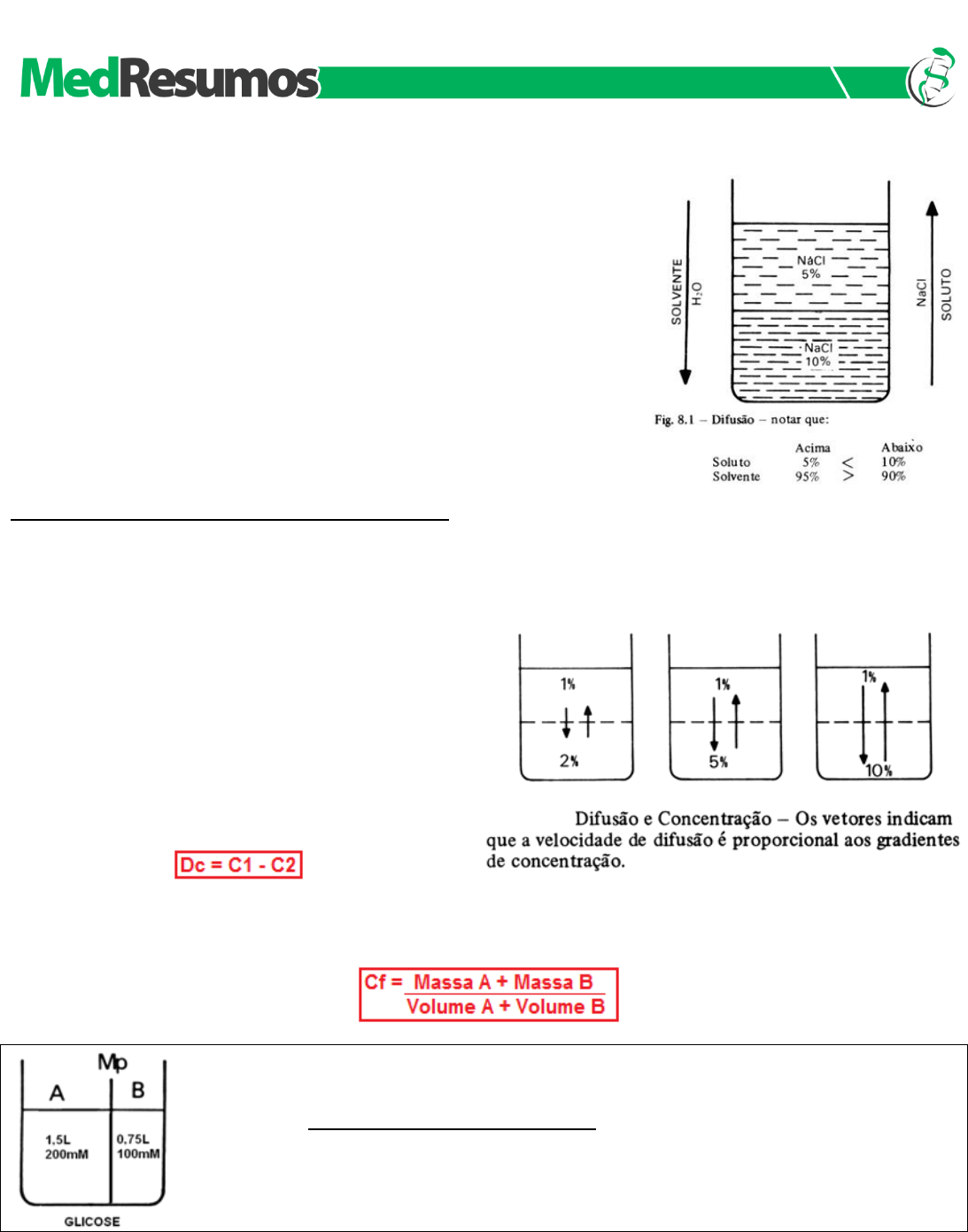 Arlindo Ugulino Netto ● MEDRESUMOS 2016 ● BIOFÍSICA 1 www.medresumos.com.br DIFUSÃO Difusão consiste na simples movimentação de moléculas, causada pela diferença de concentração das mesmas. Contudo, a difusão abrange um conceito ainda maior, incluindo a movimentação da água, além de outros fatores que influenciam neste processo de movimento, tais como: tamanho e solubilidade das moléculas, temperatura, etc. No exemplo ao lado, é possível observar que haverá movimentação do solvente de “A” para “B”, e do soluto de “B” para “A”. Essa movimentação caracteriza o fenômeno da difusão, e é finalizada quando ambos os líquidos atingirem uma concentração comum. FATORES QUE INTERFEREM NA DIFUSÃO Dentre os principais fatores que interferem no processo de difusão, podemos citar: Gradiente de concentração das partículas do meio Tamanho das moléculas ou das partículas Temperatura GRADIENTE DE CONCENTRAÇÃO O gradiente de concentração é de grande importância para o estudo da difusão, uma vez que, como foi visto anteriormente a propósito de seu conceito, a difusão é o principal responsável pela movimentação das partículas e depende diretamente da concentração destas partículas. O exemplo ao lado explica que quanto maior a diferença de concentração (Dc) entre as soluções, mais intensa será a difusão, por meio do qual poderemos instituir a seguinte relação: OBS 1 : Concentração de equilíbrio. Para se calcular a concentração final em casos em que os volumes são iguais, basta calcular a média aritmética das concentrações envolvidas. Contudo, quando os volumes das concentrações são diferentes, a concentração final (Cf) pode ser calculada de acordo com a seguinte fórmula: Ex: Tomando como base a figura ao lado, e sabendo que Massa = Concentração x Volume, temos: Cf = (200mM x 1,5L) + (100mM x 0,75L) 1,5L + 0,75L Cf = 166mM Arlindo Ugulino Netto. BIOFÍSICA 2016 Arlindo Ugulino Netto ● MEDRESUMOS 2016 ● BIOFÍSICA 2 www.medresumos.com.br OBS 2 : O gráfico da concentração em função do tempo, exemplificado na figura ao lado, demonstra o que ocorre em um processo de difusão. Considerando que o compartimento A (Ca) apresenta glicose em maior concentração do que o compartimento B (Cb), haverá a passagem de soluto de um meio para o outro (A → B), até que suas concentrações atinjam um equilíbrio, que está evidenciado no ponto Cf, representando, assim, a concentração final de equilíbrio. TAMANHO DAS PARTÍCULAS Evidentemente, o tamanho dos veículos interfere no transito de uma cidade: veículos longos lentificam e atrapalham na fluidez de uma via bastante movimentada, enquanto que motos e carros menores tendem a aumentar a velocidade da via e, desta forma, reduzir o congestionamento. Molecularmente, o tamanho das partículas também funciona como outro fator que interfere na difusão. Essa interferência ocorre especificamente na velocidade da passagem das partículas de um meio “A” para “B”. Ainda tomando como base este conceito, o peso molecular (MM), característico de cada molécula, também interfere na difusão, pois quanto maior o MM, menor será a difusão (pois maior será o tempo de difusão até que a concentração final de equilíbrio seja alcançada). TEMPERATURA A temperatura também contribui positivamente para a difusão, pois a elevação da mesma proporciona uma elevação na energia cinética das moléculas, aumentando assim o seu grau de agitação, o que proporciona uma maior velocidade na taxa de difusão. TAXA DE DIFUSÃO A taxa de difusão é a relação existente entre os diversos fatores que interferem na velocidade de movimentação das partículas através de dois meios, estando ela diretamente proporcional ao gradiente de concentração e à temperatura e inversamente proporcional a massa molecular da substância. Desta forma, temos: ΔC: Gradiente de Concentração A: Área do Compartimento Difusível T: Temperatura Δx: Distância entre os Compartimentos Difusíveis. No caso das células, seria a espessura da própria membrana plasmática, ou seja: a distância da superfície externa da interna. MM: Massa Molecular da Substância Arlindo Ugulino Netto ● MEDRESUMOS 2016 ● BIOFÍSICA 3 www.medresumos.com.br LEI DE FICK A lei de Fick é uma lei quantitativa na forma de equação diferencial que descreve diversos casos de difusão de matéria ou energia em um meio no qual inicialmente não existe equilíbrio químico ou térmico. Recebe seu nome de Adolf Fick, que as derivou em 1855. Ela determina que a taxa de difusão J representa a massa do soluto difundido em função do tempo. Tem-se a seguinte relação: OBS 3 : O sinal de negatividade presente na fórmula representa o sentido da difusão, que se dá de forma oposta ao gradiente de concentração. J: taxa de difusão D: Constante de difusão A: Área do Compartimento Difusível ΔC: Gradiente de concentração Δx: Distância entre os compartimentos difusíveis Baseando-se na lei de Fick, pode-se provar como os fatores descritos anteriormente interferem na difusão. Ora, de acordo com a fórmula, quanto maior o Δc, maior será a difusão (J), de modo que estas grandezas guardam uma relação diretamente proporcional; o mesmo ocorre com a área do compartimento. Com relação ao Δx, quanto maior a distância entre os compartimentos, menor será a taxa de difusão (J) – o mesmo ocorrendo com o peso molecular, pois estas, por sua vez, são grandezas inversamente proporcionais. Ex: OKUNO (1986): O coeficiente de difusão da sacarose em água é de 5,2.10 -10 m 2 /s. Quanta sacarose se difundirá em 20 segundos através de uma tubulação horizontal de 1,5 cm de raio, se o gradiente de concentração for 0,25Kg/m 3 em cada metro da tubulação. i. Área Seccional do Tubo: iii. J = 5,2.10-10 m2.s-1 x 7.10-4 m2 x 0,25 Kg.m-3 A= .r2 1m A= 3,14. (0,015m)2 J= - 9,1.10-14 Kg/s A= 7.10-4 m2 ii. J = -D.A.C/X iv.E