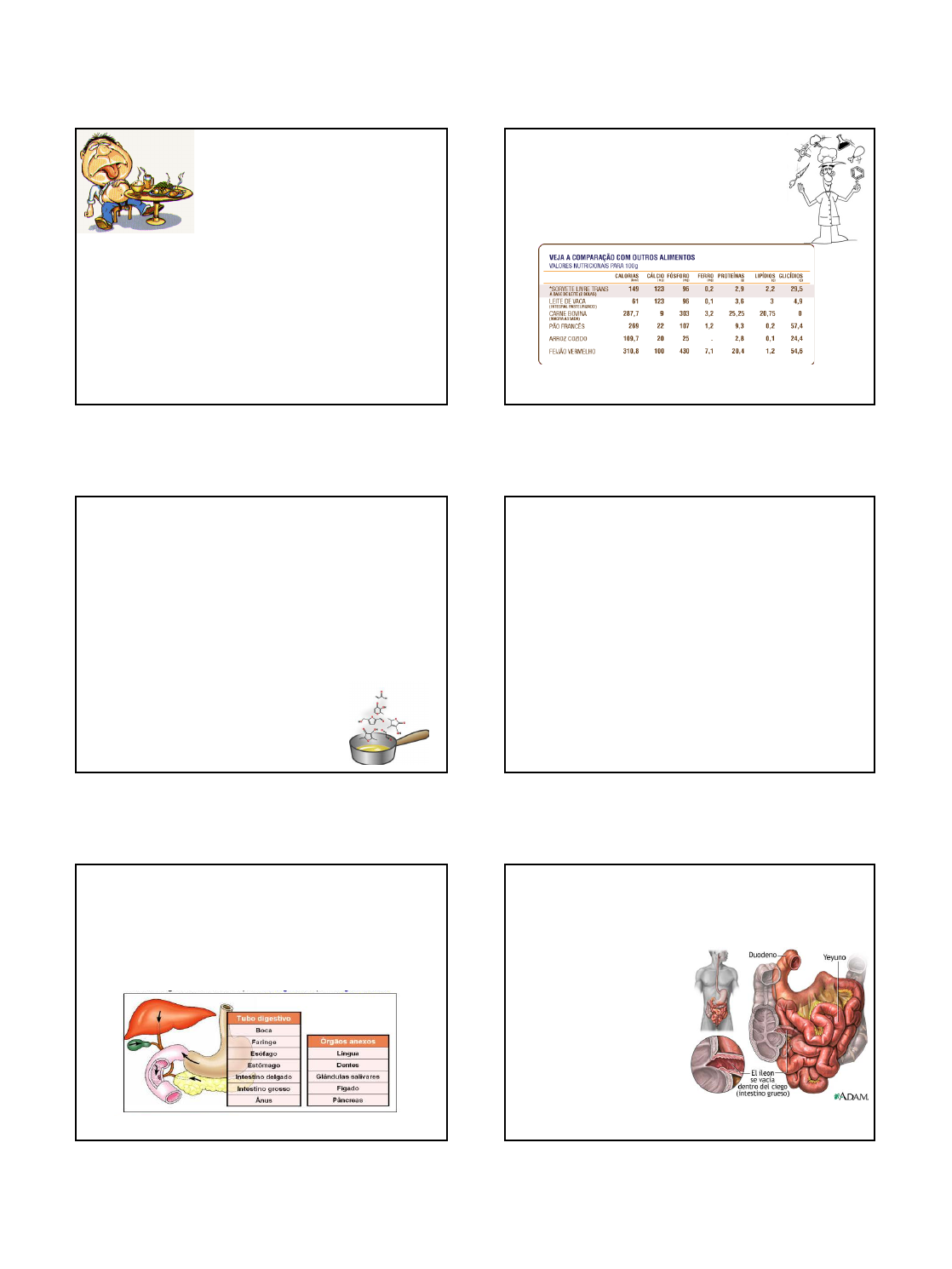 19/02/2018 1 Digestão e Absorção de Constituintes Nutricionais Básicos Manual de Bioquímica – Com Correlações Clínicas – Thomas M. Devlin Prof. Dr. Victor Carneiro Sistema Digestivo - Função • Alimentos versos nutrientes Sistema Digestivo - Função •Este s alimentos tê m de ser transformados em substân cia s utilizáveis, envolvendo vários fenómenos físicos e químicos. •Este s fenómeno s oco rre m ao longo do tubo dige stivo com o auxílio de vários órgãos. Sistema Digestivo (conclusão): • Tem a função retirar dos alimento s ingerido s os nutriente necessár ios para o desen volvimento e a manutenção do organismo, isto é, o tubo digestivo tem a função de transformar alimento em nutrientes e absorvê-los. Sistema Digestivo - Constituíção • O sistema digestivo é constituído pelo tubo digestivo e pelos órgãos anexos. Sistema Digestivo Intestino Delgado Ä porção mais longa do tubo digestivo, tem 6 a 7 metros de comprimento, razão pela qual se encontra dobrado várias vezes sobre si. Ä é formado pelo duodeno (segmento inicial, que se segue ao estômago e que recebe os sucos produzidos pelo fígado e pelo pâncreas) e pelo jejuno-ílio (zona de absorção digestiva). 19/02/2018 2 Digestão – como tudo acontece… •Os alimentos sofrem, durante a digestão, uma ação mecânica e uma ação química. •A ação mecânica é desenvolvida pela língua, pelos dentes e pelos movimentos peristálticos que ocorrem ao longo de todo o tubo digestivo. •A ação química é provocada pelos sucos digestivos (possuem enzimas) produzidos pelos diferentes órgãos do sistema digestivo. Digestão no intestino delgado •Os nutrientes encontram-se agora na sua forma mais simple s em conjunto com a s substância s que não sofreram digestão (água,vitaminas, sais minerais, celulose). •O intestino delgado é a principal área de absorção dos nutrientes. •A absorção é muito efi ciente devido à presença das vilosidades tecidual – pregas Absorção •Cada um a dessas preg as apres enta pequ en as saliê ncias em forma de dedo d e luva – as vilosida des intestinais, que p or sua vez possuem expa nsões – as microvilosidades. •Cada vilosid ad e contém capilares sanguí neos e real iza uma abs orçã o seletiva dos alimentos. Absorção - Intestino Grosso •As substâncias nã o diger idas pass am para o intestino gr osso m isturad as com ág ua. Aqui ocorrer á a absorção da maior quantidade possível de água. •No intestino gr osso p odem os enc ontrar bilh ões ba ctérias q ue des empe nh am um importante pa pel na pro duçã o d e algum as vitaminas q ue, em seg uid a, são absorv id as pelo sangue. •Os restos d os alim entos formam as fezes que serão expulsas pelo ânus. Tipos de macronutrientes 19/02/2018 3 Locais de digestão Regulação das secreções Secreção exócrina de enzimas digestivas Regulação celular da secreção exócrina do pâncreas 19/02/2018 4 Pâncreas Colecistoquinina Estômago diminui a motílidade gástrica estimula a liberação, a partir de células exócrinas do pâncreas, de um suco rico em enzimas digestivas+ Lipases e esterases e sais +estimula a liberação de um suco rico em sais, pricipalmente o bicarbonato. Bicarbonato e outros sais Secretina A presença de lipídeos e proteínas estimula glândulas presentes na mucosa intestinal Vesícula biliar estimula a contração da vesícula liberando a bile no intestino Sais biliares + Secretina que liberam no sangue : Colecistoquinina As células da mucosa do jejuno e duodeno inferior produzem hormônios O pH baixo estimula outro grupo de células Secreção e ativação de enzimas do pâncreas Vias de transporte atrevés do epitélio Manual de Bioquímica – Com Correlações Clínicas – Thomas M. Devlin Transporte de Na+ • Absorção e secreção de NaCl • Captação de nutrientes 19/02/2018 5 Manual de Bioquímica – Com Correlações Clínicas – Thomas M. Devlin Digestão e Absorção de Proteínas 19/02/2018 6 Digestão e Absorção de Carboidratos No adulto um vestígio de lipases resistentes ao pH ácido hidrolisa triacilgliceróis em pequeníssima qtde. No estômago dos recém nascidos, graças ao pH neutro, ocorre digestão de lipídeos. Estômago Não ocorre Boca Porções de fosfolipídeos e glicolipídeos não digeridos Digestão de lipídeos Pâncreas Secreção de dois tipos “suco pancreático” . Triacilgliceróis (TG) mais que 90% Fosfolipídeos (PL) Glicolipídeos (GL) Colesterol ( C ) Ésteres de colesterol (CE) Vitaminas lipossolúveis (ADEK) 60 - 150 g/dia Vesícula biliar Armazenamento e secreção da bile. Solubilização, a hidrólise de ácidos graxos livres, monoacilgliceróis, do colesterol da dieta (30-40%)vitaminas lipossolúveis e ác. graxos essenciais. Captação de lipídeos, ressíntese de triacilgliceróis e ésteres de colesterol, formação do quilomícron . Reabsorção de sais biliares. 1 a 2 g de colesterol e 7 a 22 g de lecitina são secretados no lúmem do intestino delgado como constituintes da bile. Intestino delgado 19/02/2018 7 Digestão e Absorção de Lipídeos Pâncreas Colecistoquinina Estômago diminui a motílidade gástrica estimula a liberação, a partir de células exócrinas do pâncreas, de um suco rico em enzimas digestivas+ Lipases e esterases e sais +estimula a liberação de um suco rico em sais, pricipalmente o bicarbonato. Bicarbonato e outros sais Secretina A presença de lipídeos e proteínas parcialmente digeridas na porção superior do intestino delgado estimula glândulas presentes na mucosa intestinal Vesícula biliar estimula a contração da vesícula liberando a bile no intestino Sais biliares + Secretina que liberam no sangue : Colecistoquinina As células da mucosa do jejuno e duodeno inferior produzem hormônios O pH baixo estimula outro grupo de células Pâncreas Vesícula biliar Lipídeo em excesso nas fezes (ESTEATORRÉIA) Bile Células mucosas intest