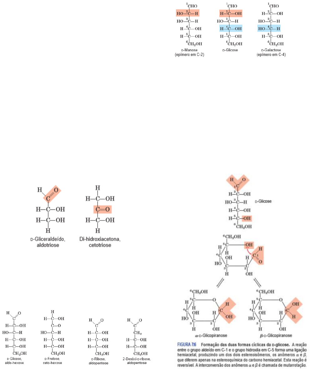2 Bioquímica Fundamental Carboidratos e Glicobiologia Açúcar ou hidratos do Carbono ou oses São aldeídos ou cetoses polihidroxilado Principal fonte de energia Apresentam centros quirais -> estereoisômeros -> estereoisômeros das enzimas. Monossacarídeos Solúveis em água e insolúveis em solventes apolares Quando o grupo carbonil está na extremidade da cadeia de carbonos (isto é, em um grupo aldeído), o monossacarídeo é uma aldose; quando o grupo carbonil está em qualquer outra posição (em um grupo cetona), o monossacarídeo é uma cetose. ->Nomenclatura: monossacarídeos com quatro átomos de carbono = tetroses Cinco = pentoses Seis =hexoses Sete = heptoses Quando o grupo hidroxila do carbono de referência esta à direita = D Quando esta a esquerda = L Dois açúcares que diferem apenas na configuração de um carbono são chamados de epímeros, ex: D-glicose e D-manose, que diferem apenas na estequiometria do C-2 e D-glicose e D-galactose diferem em C-4 ->Estrutura cíclica: - E solução aquosa é comum estruturas cíclicas -> grupo carbonil forma uma ligação covalente com o O do grupo hidroxila -> reação entre álcoois e aldeídos ou cetoses = hemiacetais - Gera um novo centro quiral - Anômeros = formas isoméricas de monossacarídeos que diferem apenas na configuração do átomo de carbono hemiacetal ou hemicetal -O átomo de carbono da carbonila é chamado de carbono anomérico. - anéis de seis membros = piranose - Representação: Grupo hidroxila à direita na projeção de Fisher = aponta para abaixo do plano de anel na perspectiva de Haworth; se ele estiver à esquerda na projeção de Fisher= aponta para cima na perspectiva de Haworth. O grupo ¬CH2OH terminal projeta-se para cima no enantiômero D-, e para baixo no enantiômero L-. Quando a hidroxila anomérica de uma D-hexose estiver no mesmo lado do anel que o C-6, ou seja, hidroxila para cima = a estrutura beta E no lado oposto do C-6, ou seja, para baixo e C6 para cima = estrutura alfa. Ex.: Os anômeros a e b da D-glicose se interconvertem em solução aquosa por um processo chamado de mutarrotação, noica qual uma forma em anel (por exemplo, o anômero a) se abre brevemente na forma linear, e então se fecha novamente produzindo o anômero b. Para interconverter as configurações a e b, a ligação envolvendo o átomo de oxigênio do anel precisa ser rompida, mas a interconversão de duas formas em cadeira (que são confôrmeros) não requer quebra de ligações e não altera as configurações de nenhum dos carbonos do anel. Reações envolvendo açúcares Oxidação do Carbono 1 (anomérico) Açúcar redutor – capazes de reduzir o pion cúprico (Cu++) Ex: a reação de benedict identifica açúcares redutores pois o reativo de benedict contem Cobre que reduz em contato com açúcar com carbono anomeérico livre para ser oxidada. OBS.: Reduzida = cheia de H Oxidada = + O Desoxidação Saída de oxigênio Aminação Entrada de grupamentos aminas Oxidação do Carbono 6 Dissacarídeos Dois mossocarídeos unidos covalentemente por uma ligação glicosídica (ligação 1,4, que pode ser beta ou alfa) - hidrolisadas por ácido e resistem à clivagem por base. Ligações glicosídicas O = grupo hidroxila (normalmente de uma molécula cíclica) que reage com o carbono anomérico de outro Ligações N-glicosídicas unem o carbono anomérico de um açúcar a um átomo de nitrogênio em glicoproteínas e nucleotídeos. Reação de Benedicts é + para maltose, pois ela apresenta carbono anomperico livre -> duas glicoses unidas por uma ligação glicosídica entre o C-1 e o C-4 do outro, conservando assim, um carbono anomérico livre Açúcar não redutor – ligação 1, 1(entre os 2C anoméricos) Dissacarideos Monossacarídeos Monossacarídeos Maltose Glicose Glicose lactase Glicose galactose Sacarose Glicose Frutose Em solução temos glicose tanto na forma de alfa e Beta glucopirosano O carbono anomérico na molécula linear é aquiral e no ciclo se torna quiral. OBS.: Frutose -> Furonose e Glicose -> piranose Polissacarídeos Ou glicanos, podem ser: Homopolissacarídeos Heteropolissacarídeos - Homopolissacarídeos: formado por 1 tipo de monossacarídeo Polimero de glicose: amido, glicogênio e celulose. Amido Dois polimeros ≠ de glicose = amilose e amilopectina Amilose: cadeias lineares e longas, não ramificadas, ligações (alfa 1-4) Amilopectina- cadeia ramificada e nessas ramificações temos ligação alfa 1- 6, enquanto na cadeia principal é ligação alfa 1-4 Glicogênio Subs de reversa aos animais - armazenado no fígado e no músculo esquelético. Glicose ligadas por ligações (alfa 1-4), com ligações (alfa 1-6) nas ramificações, e possui formato de hélice, estabilizada por ligações de hidrogênio entre as cadeias Mais ramificado e mais compactado com amido. Rapidamente ele é esgotado, pois é pouco armazenado devido a sua camada de solvatação Por que não armazenar a glicose em sua forma monomérica? Calcula-se que os hepatócitos armazenam uma concentração de glicogênio equivalente a 0,4 M de glicose. A concentração existente de glicogênio, que é insolúvel e contribui pouco para a osmolaridade do citosol, é de cerca de 0,01 mM. Se o citosol contivesse 0,4 M de glicose, a osmolaridade seria perigosamente elevada, causando uma entrada osmótica de água que poderia romper a célula. Além disso, com a concentração de glicose interna igual a 0,4 M e a concentração externa igual a 5 mM (a concentração no sangue de um mamífero), a variação de energia livre para o transporte de glicose para dentro das células contra este gradiente de concentração tão alto seria proibitivamente grande. Celulose Exclusivo em plantas – responsável ela sustentação Linear e não ramificado -> ligação beta 1-4 Possui uma estrutura esticada devido as várias pontes de hidrogênio, o que explica a resistência da planta. Possuimos α-amilases e glicosidases que rompem as liga