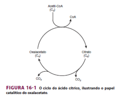 Objetivo 1: IMPORTÂNCIA BIOMÉDICA: O ciclo do acido cítrico (ciclo de Krebs ou ciclo do acido tricarboxilico) consiste em uma sequência de reações na mitocôndria que oxida a porção acetil da acetil-CoA a CO2 e reduz coenzimas que são reoxidadas por meio da cadeia de transporte de elétrons, ligada a formação de ATP. O ciclo do acido cítrico é a via final comum para a oxidação dos carboidratos, dos lipídeos e das proteínas, visto que a glicose, os ácidos graxos e a maior parte dos aminoácidos são metabolizados a acetil-CoA ou a intermediários do ciclo. O ciclo do acido cítrico também desempenha papel central na gliconeogênese,na lipogênese e na interconversão de aminoácidos. Muitos desses processos ocorrem na maioria dos tecidos, porém o fígado é o único tecido no qual todos ocorrem em grau significativo. Assim, as repercussões são profundas, quando, por exemplo, muitas células hepáticas são lesionadas, conforme observado na hepatite aguda, ou são substituídas por tecido conectivo (como na cirrose). Os poucos defeitos genéticos das enzimas do ciclo do acido cítrico que já foram descritos estão associados a ocorrência de lesão neurológica grave, em consequência de comprometimento considerável na formação de ATP no sistema nervoso central. A hiperamoniemia, como a que ocorre na doença hepática avançada, leva a perda da consciência, ao coma e a convulsões devido a atividade reduzida do ciclo do acido citrico, resultando em diminuição na formação de ATP. A amônia causa depleção dos intermediários do ciclo do acido citrico (ao retirar o α-cetoglutarato para a formação de glutamato e glutamina) e também inibe a descarboxilação oxidativa do α-cetoglutarato. O CICLO DO ÁCIDO CÍTRICO FORNECE SUBSTRATOS PARA A CADEIA RESPIRATÓRIA: O ciclo começa com a reação entre a porção acetil da acetil-CoA e o oxalacetato, um ácido dicarboxilico de 4 carbonos, formando um acido tricarboxilico de 6 carbonos, o citrato. Nas reações subsequentes, são liberadas 2 moléculas de CO2, e o oxalacetato e regenerado. Apenas uma pequena quantidade de oxalacetato e necessária para a oxidação de uma grande quantidade de acetil-CoA; pode-se considerar que o oxalacetato desempenha papel catalítico, uma vez que e regenerado no fim do ciclo. O ciclo do acido cítrico e a principal via para a formação de ATP ligado a oxidação de combustíveis metabólicos. Durante a oxidação de acetil-CoA, as coenzimas são reduzidas e subsequentemente reoxidadas na cadeia respiratória, em um processo ligado a formação de ATP (fosforilação oxidativa). Esse processo e aeróbio, exigindo a presença de oxigênio como oxidante final das coenzimas reduzidas. As enzimas do ciclo do acido cítrico localizam-se na matriz mitocondrial, na forma livre ou ancoradas a membrana mitocondrial interna e a membrana das cristas, onde também são encontradas as enzimas e as coenzimas da cadeia respiratória. AS REAÇÕES DO CICLO DO ÁCIDO CÍTRICO LIBERAM EQUIVALENTES REDUTORES E CO2: A reação inicial entre a acetil-CoA e o oxalacetato para formar citrato e catalisada pela citrato-sintase, que forma uma ligação carbono-carbono entre o carbono metil da acetil-CoA e o carbono carbonil do oxalacetato. A ligação tioéster da citril-CoA resultante e hidrolisada, com liberação de citrato e CoASH – uma reação exotérmica. O citrato sofre isomerização a isocitrato pela enzima aconitase (aconitato-hidratase). A reação ocorre em duas etapas: a desidratação a cis-aconitato e a reidratação a isocitrato. Embora o citrato seja uma molécula simétrica, a aconitase reage de modo assimétrico com o citrato, de modo que os 2 átomos de carbono que são perdidos em reações subsequentes do ciclo não são aqueles que foram acrescentados a partir da acetil -CoA. Esse comportamento assimétrico resulta do processo de canalizacao – a transferência direta do produto da citrato sintase para o sitio ativo da aconitase, sem necessidade de entrar em solução livre. A canalização possibilita a integração da atividade do ciclo do acido cítrico com o fornecimento de citrato no citosol como fonte de acetil-CoA para a síntese de ácidos graxos. O citrato so esta disponível, livre em solução, para ser transportado das mitocôndrias ate o citosol para a síntese de ácidos graxos, quando a aconitase e inibida pelo acumulo de seu produto, o isocitrato. O veneno fluoracetato e encontrado em algumas plantas, e o seu consumo pode ser fatal para animais de pastagem. Alguns compostos fluorados empregados como agentes antineoplasicos e substancias químicas industriais (incluindo pesticidas) são metabolizados a fluoracetato. Trata-se de uma substancia tóxica, visto que a fluoracetil-CoA se condensa com o oxalacetato para formar fluorocitrato, que inibe a aconitase, levando ao acumulo de citrato. O isocitrato sofre desidrogenacao catalisada pela isocitrato -desidrogenase, formando, inicialmente, oxalossuccinato, que permanece ligado a enzima e sofre descarboxilacao a α-cetoglutarato. A descarboxilacao requer a presenca de ions Mg2+ ou Mn2+. Existem tres isoenzimas da isocitrato-desidrogenase. Uma delas, que utiliza o NAD+, e encontrada apenas nas mitocondrias. As outras duas utilizam o NADP+ e sao encontradas nas mitocondrias e no citosol. A oxidação do isocitrato ligada a cadeia respiratoria ocorre por meio da enzima dependente de NAD+. O α-cetoglutarato sofre descarboxilacao oxidativa em uma reação catalisada por um complexo multienzimatico semelhante ao complexo envolvido na descarboxilacao oxidativa do piruvato. O complexo da α-cetoglutarato- desidrogenase requer os mesmos cofatores que o complexo da piruvato-desidrogenase – tiamina-difosfato, lipoato, NAD+, FAD e CoA – e resulta na formacao de succinil-CoA. O equilibrio dessa reação favorece tanto a formacao de succinil-CoA, que ela deve ser considerada fisiologicamente como unidirecional. Como no caso 