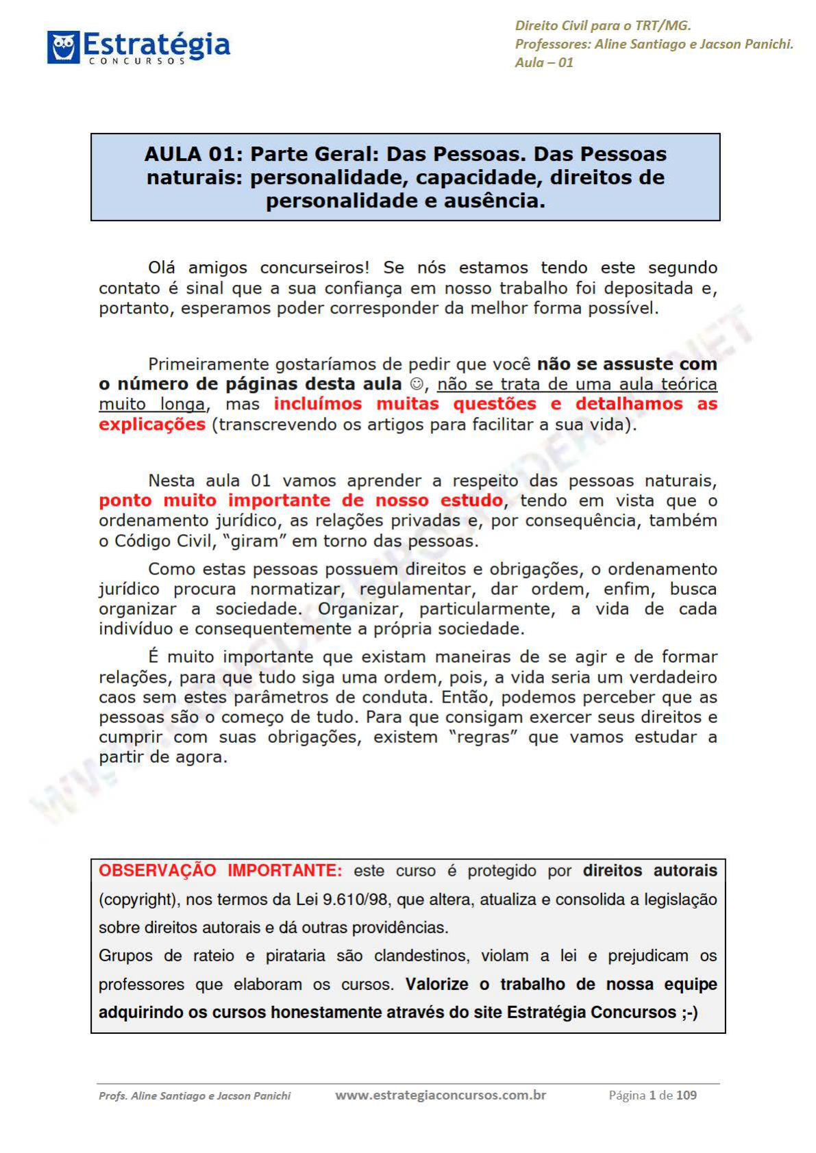 Direito Civil para o TRT/MG. Professores: Aline Santiago e Jacson Panichi. Aula ʹ 01 Profs. Aline Santiago e Jacson Panichi www.estrategiaconcursos.com.br Página 2 de 109 Sumário - Pessoas Naturais: Início de sua existência e personalidade. ................................................................ 3 - Capacidade ............................................................................................................................................ 5 -Incapacidade. ......................................................................................................................................... 7 - Cessação da incapacidade: ............................................................................................................. 13 - Extinção da personalidade natural ..................................................................................................... 17 - Individualização da pessoa natural: Nome, Estado e domicílio.......................................................... 19 - Nome .............................................................................................................................................. 20 - Estado (status) da pessoa natural ................................................................................................... 22 - Domicílio Civil (arts. 70 a 78). ......................................................................................................... 24 - Direitos da Personalidade ................................................................................................................... 27 -Da ameaça ou lesão a direito da personalidade. ............................................................................. 29 -Da disposição do Corpo em vida e para depois da morte. .............................................................. 30 - Do constrangimento a tratamento médico ou intervenção cirúrgica. ........................................... 32 -Proteção ao nome ........................................................................................................................... 34 -Da produção intelectual e da imagem das pessoas. ........................................................................ 34 -Da intimidade................................................................................................................................... 36 - Ausência (arts. 22 a 39). ...................................................................................................................... 36 QUESTÕES FCC E SEUS RESPECTIVOS COMENTÁRIOS. ......................................................................... 45 LISTA DAS QUESTÕES GABARITO. ......................................................................................................... 89 Direito Civil para o TRT/MG. Professores: Aline Santiago e Jacson Panichi. Aula ʹ 01 Profs. Aline Santiago e Jacson Panichi www.estrategiaconcursos.com.br Página 3 de 109 Pessoas Naturais É muito importante que existam maneiras de se agir e de formar relações, isto para que tudo siga uma ordem, pois, a vida seria um verdadeiro caos sem estes parâmetros de conduta. Então, podemos perceber que as pessoas são o começo de tudo. E para que consigam exercer seus direitos e cumprir com suas obrigações��H[LVWHP�³UHJUDV´�TXH�YDPRV�HVWXGDU�D�SDUWLU�GH�DJRUD�� ³Professores, mas para o direito o que são as pessoas? O que eu preciso saber?´ Você precisa entender que em nosso estudo iremos utilizar a conceituação jurídica, onde a pessoa é o ente físico ou moral, susceptível de direitos e obrigações, é o sujeito da relação jurídica, o sujeito de direito. Quanto às pessoas, duas são suas as espécies, quais sejam: a ¹pessoa natural (o ser humano) e a ²pessoa jurídica (agrupamento de seres humanos com fins e interesses comuns). Nesta aula trataremos da pessoa natural, deixando o assunto pessoa jurídica para a nossa próxima aula. - Pessoas Naturais: Início de sua existência e personalidade. O primeiro conceito fundamental do direito privado é o de pessoa. Como vimos acima, pessoa natural1 é o ser humano, o único ser vivo que pode ser titular de relações jurídicas, sujeito de direitos e obrigações. No entanto, aplica-se às chamadas pessoas jurídicas (assunto da nossa próxima aula), no que couber, a proteção dos direitos da personalidade (CC art. 52). Assim, logo no artigo 1º do Código Civil temos: Art. 1º. Toda pessoa é capaz de direitos e deveres na ordem civil. Quando utilizamos D� H[SUHVVmR� ³WRGD� SHVVRD´� TXHUemos dizer homem, mulher, idoso, criança e independentemente de cor, credo... É 1 Também pode ser encontrada a denominação, para pessoa natural, de pessoa física. Direito Civil para o TRT/MG. Professores: Aline Santiago e Jacson Panichi. Aula ʹ 01 Profs. Aline Santiago e Jacson Panichi www.estrategiaconcursos.com.br Página 4 de 109 sujeito de direito, portanto ente dotado de personalidade, como expresso em seguida no artigo 2º, que diz: Art. 2º. A personalidade civil da pessoa começa do nascimento com vida; mas a lei põe a salvo, desde a concepção os direitos do nascituro. Importante observar que; a personalidade é qualidade de quem é sujeito de direitos, sendo adquirida no momento do nascimento com vida2 e encerrada com a morte da pessoa. Quem é pessoa tem personalidade jurídica. ³Ok, mas o que quer dizer exatamente a segunda parte do artigo? Quem é o nascituro?´ Nascituro é o feto, que está dentro do ventre da mãe e que ainda vai nascer. Não possui personalidade jurídica, mas a lei assegura seus direitos desde a concepção. É uma expectativa de direito, se nascer com vida os direitos retroagem a sua concepção. Embora não tenha personalidade é dotado da chamada humanidade (tem natureza humana). Assim, a personalidade de uma pessoa e sua consequente capacidade de direitos e deveres começa no nascimen